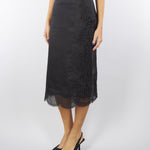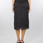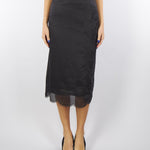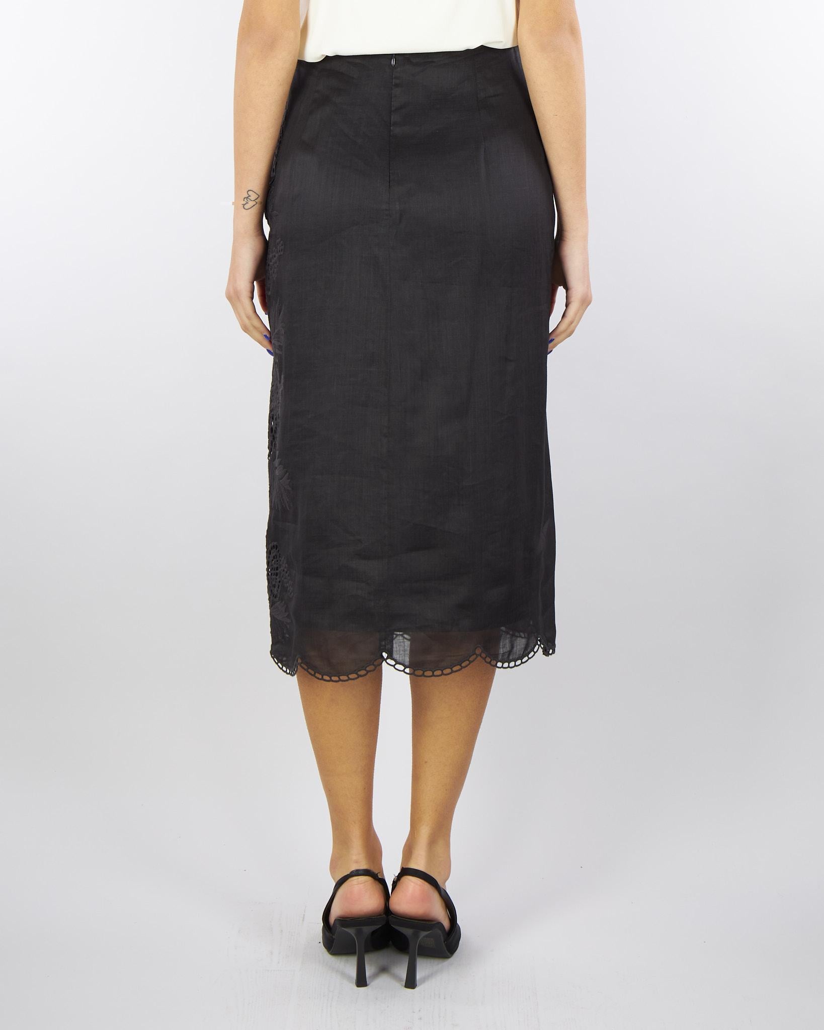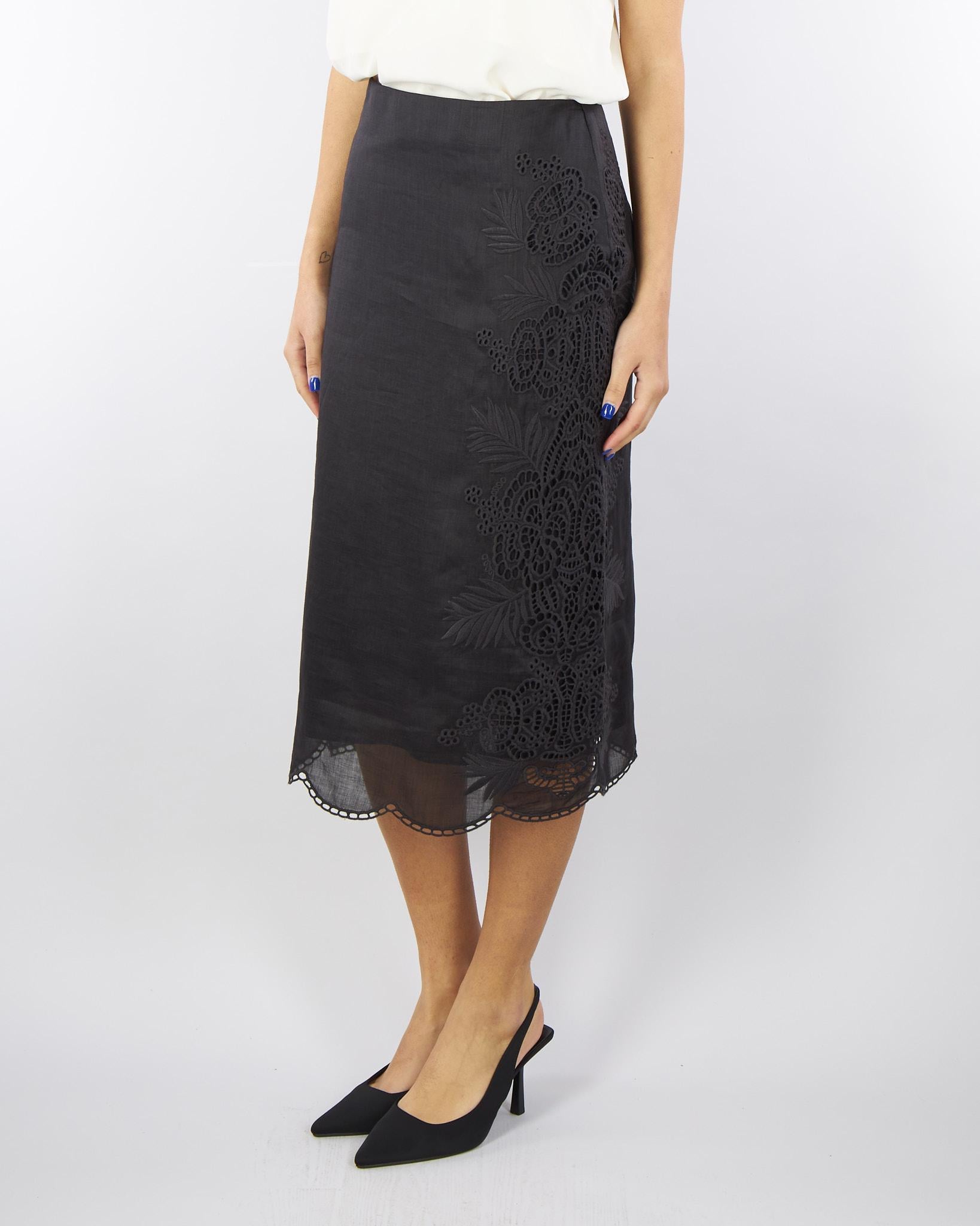 Gonna pencil dalla linea dritta, realizzata in tela ramiè impreziosita con ricamo sangallo piazzato a fiori e bordo smerlato. Foderata in mussola di cotone, si chiude con zip sul retro.