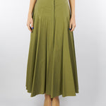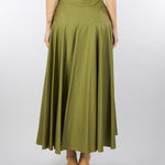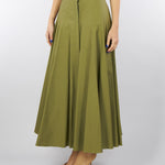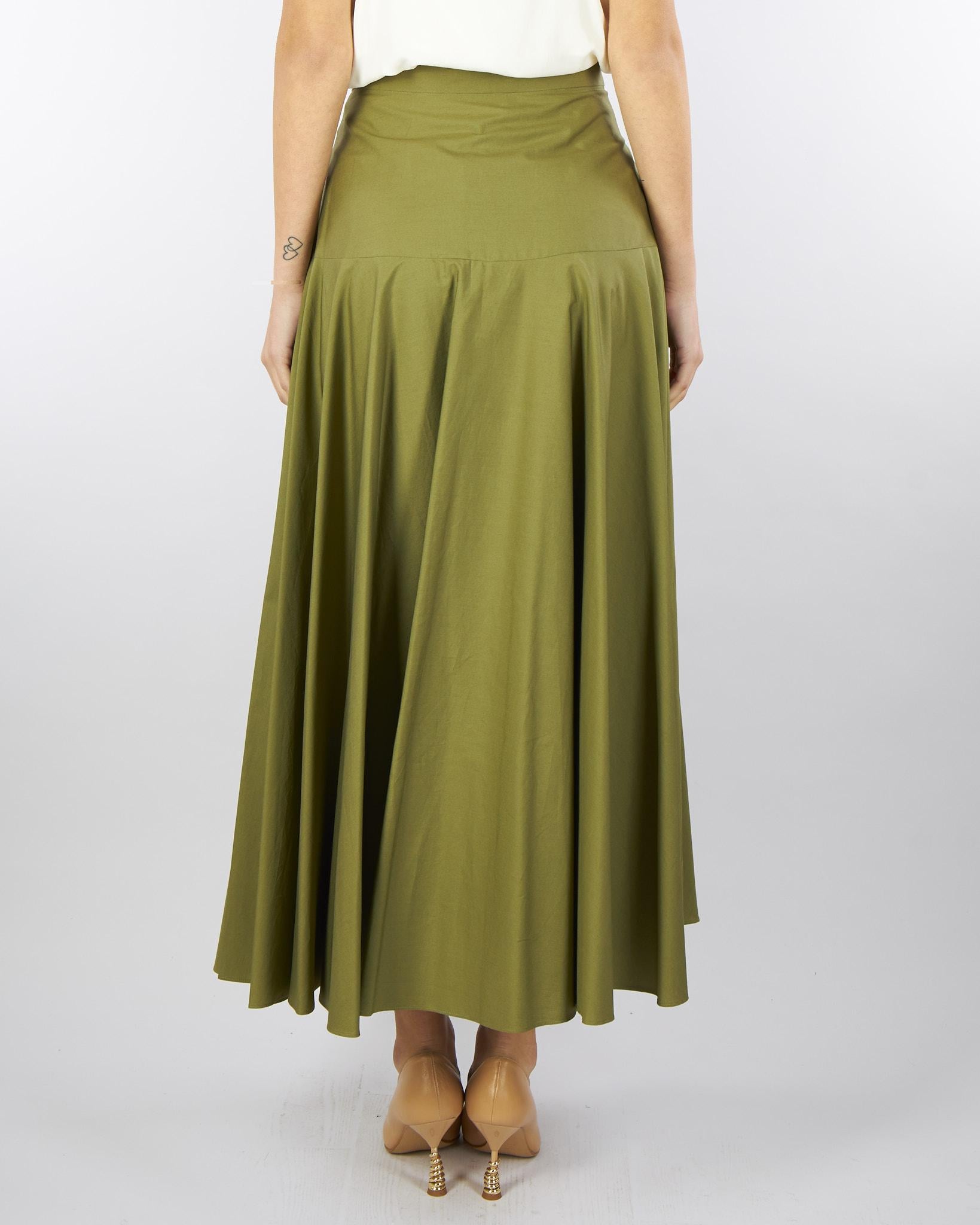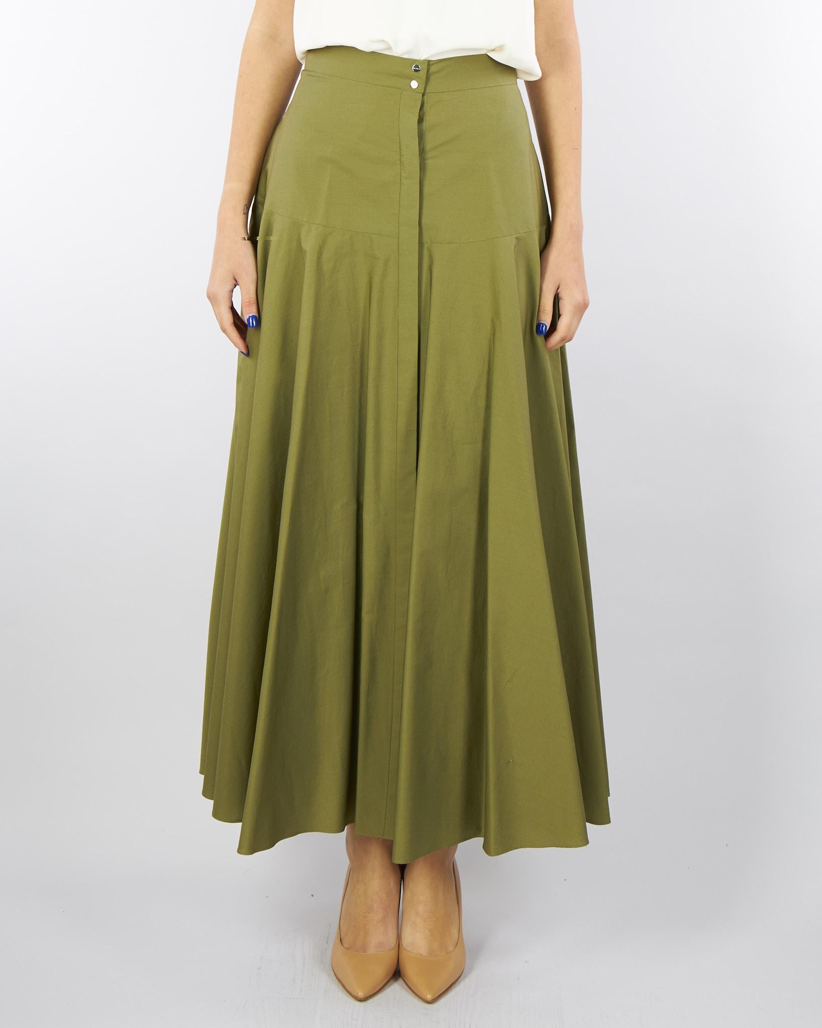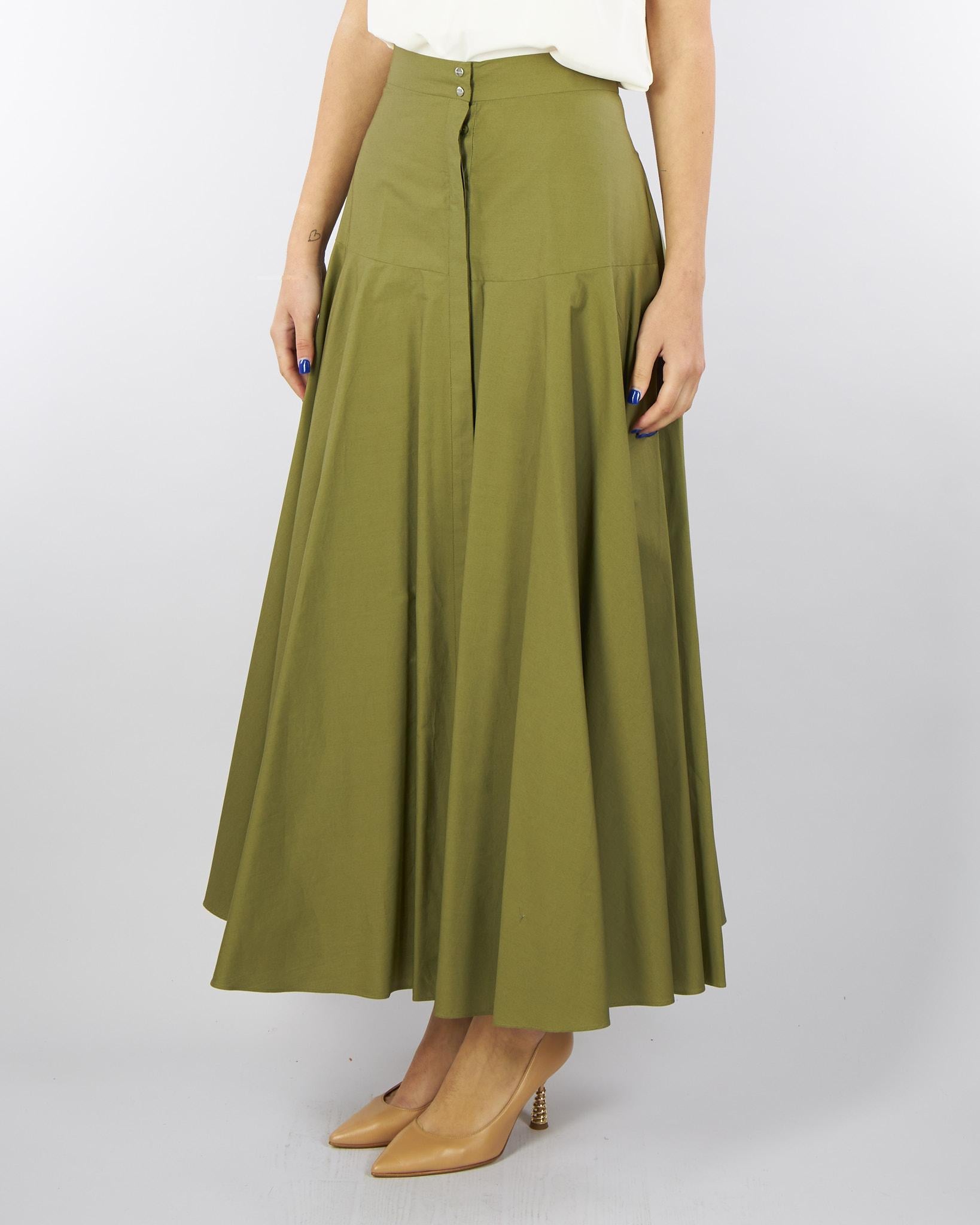 Gonna lunga a ruota, realizzata in morbido popeline di puro cotone. La silhouette presenta motivo di baschina alta sui fianchi, tasche laterali e linea svasata sul fondo. Chiusura frontale nascosta su tutta la lunghezza.