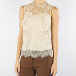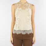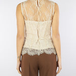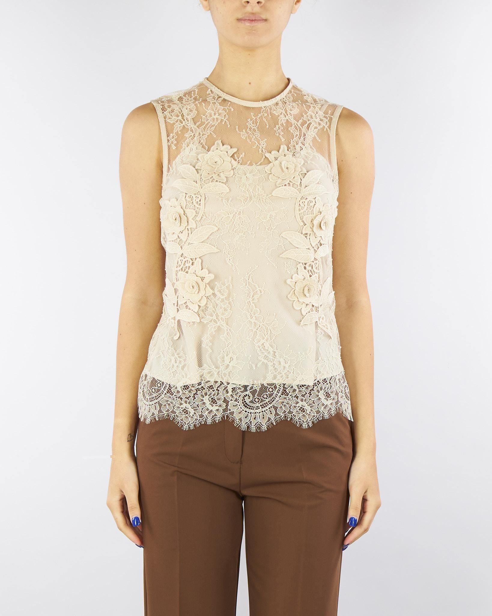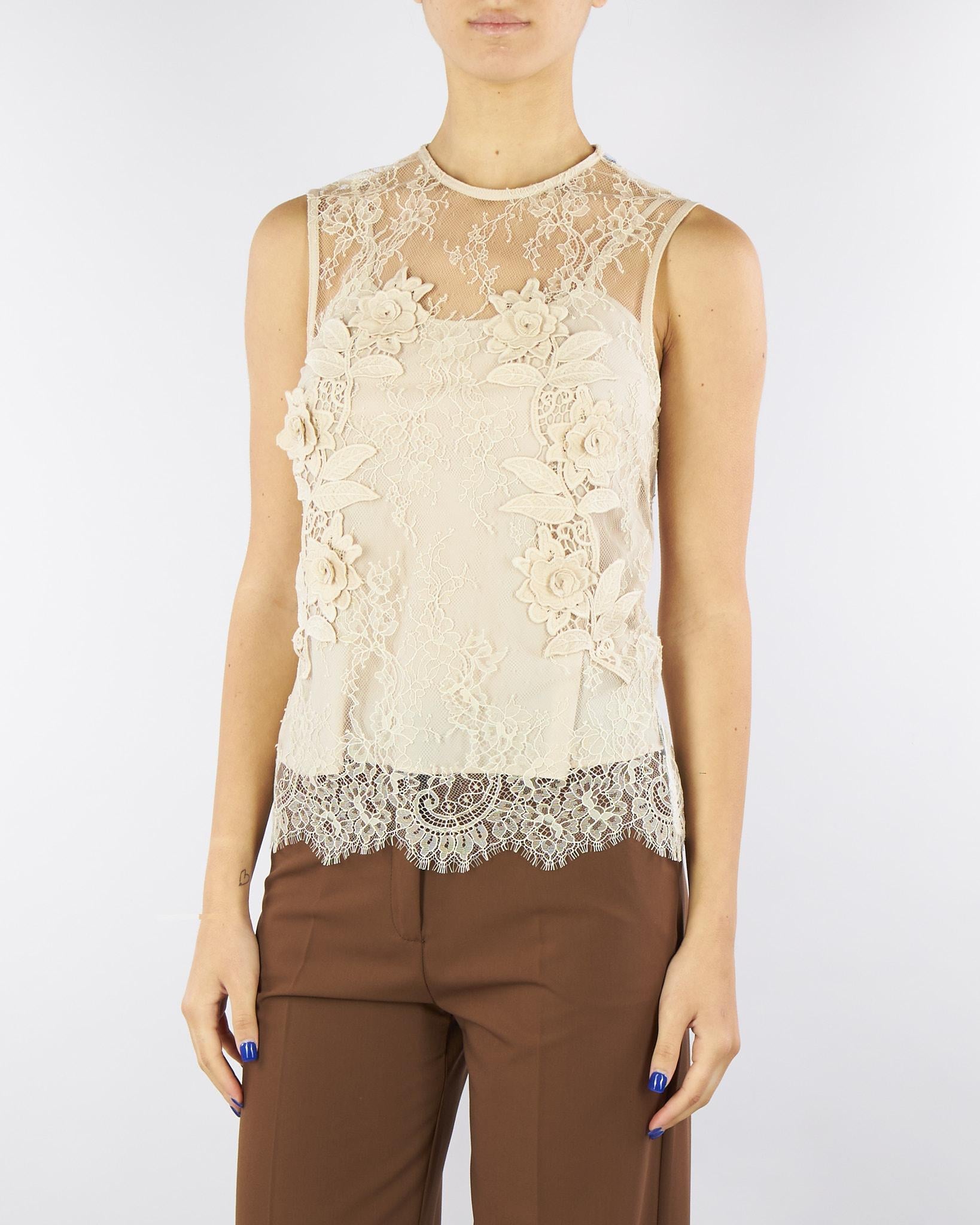 Affronta feste e cerimonie con questo top in pizzo chantilly con applicazione macramè ramage floreale davanti. Ha collo tondo, apertura a goccia e bottone sul retro, linea slim. Sarà un sottogiacca raffinato o il protagonista di un look che non passerà inosservato.