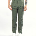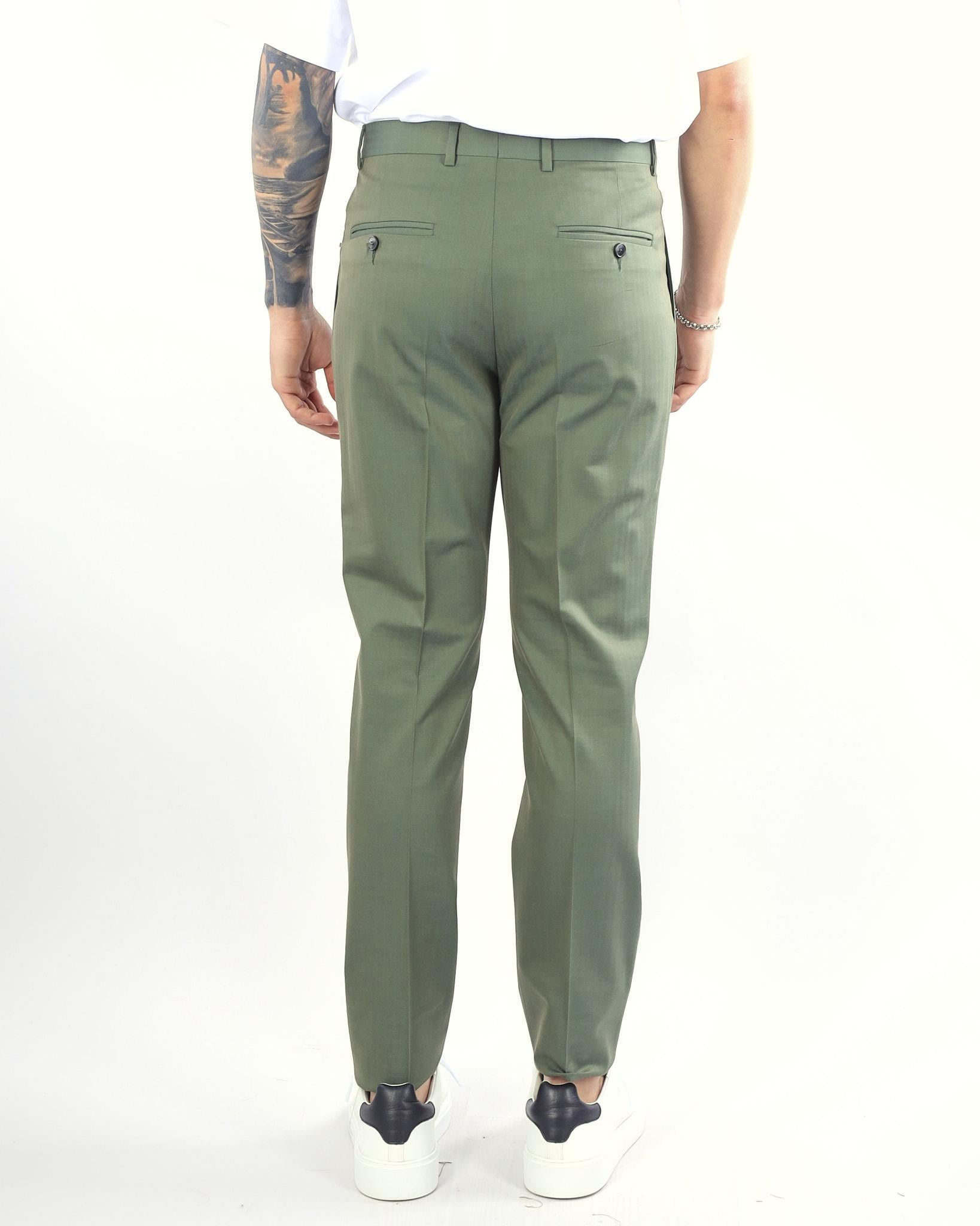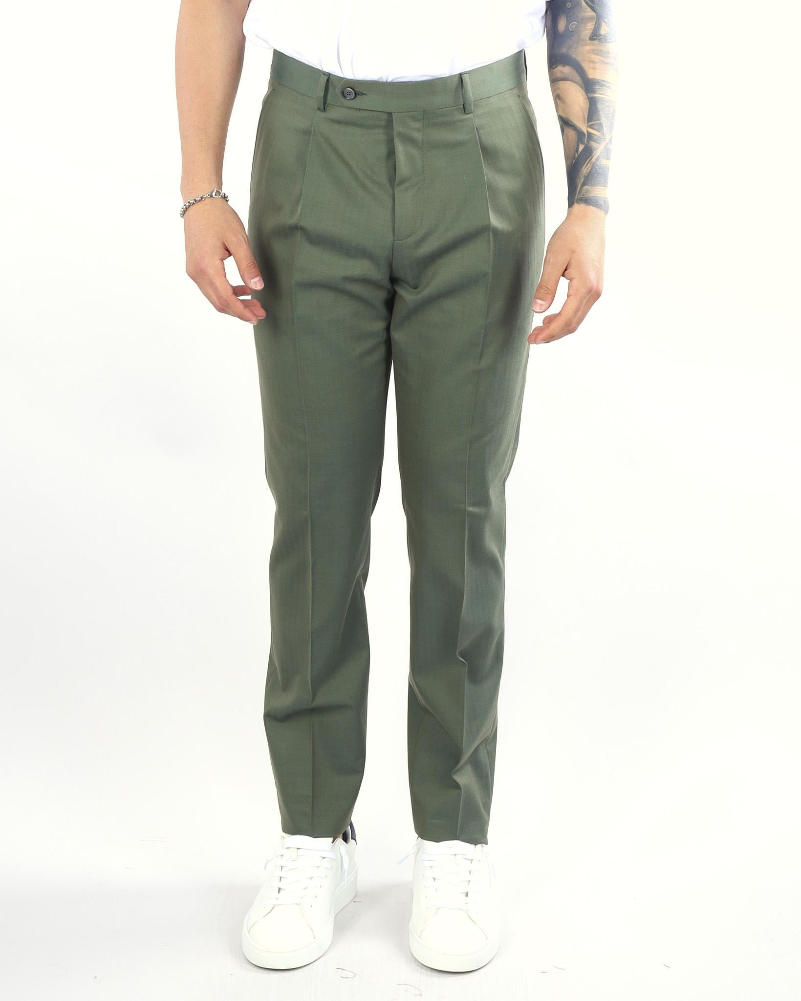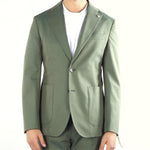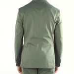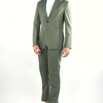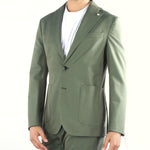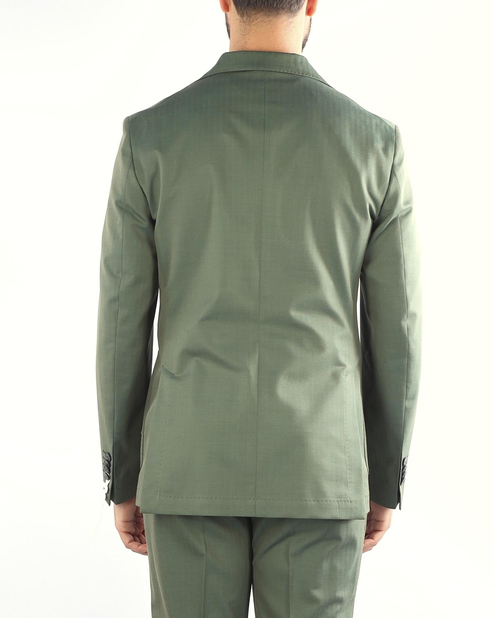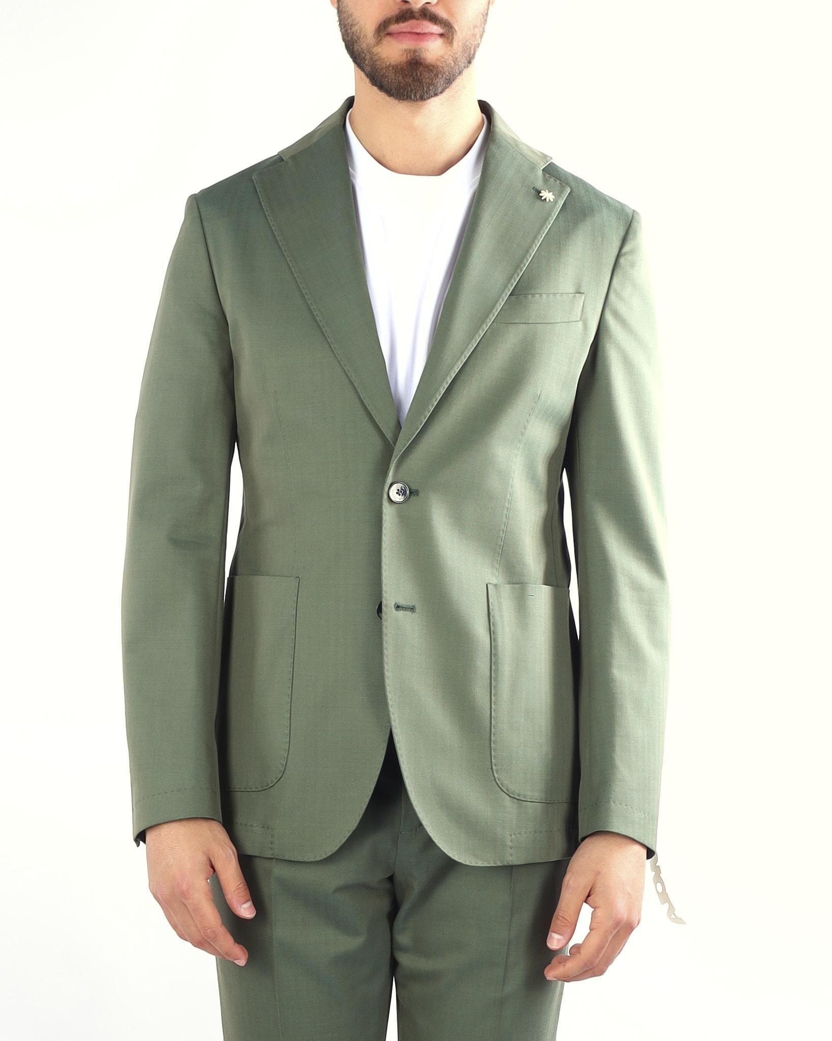 Abito in tessuto Solaro di Manuel Ritz. Modello monopetto con rever classico, tasche a toppa sul davanti e taschino sul petto. Doppio spacco sul retro. Chiusura centrale con due bottoni. Pantalone con pences, tasche america laterali e tasche a filo sul retro. Chiusura con bottone. Spilla iconica sul rever.