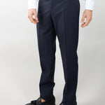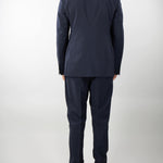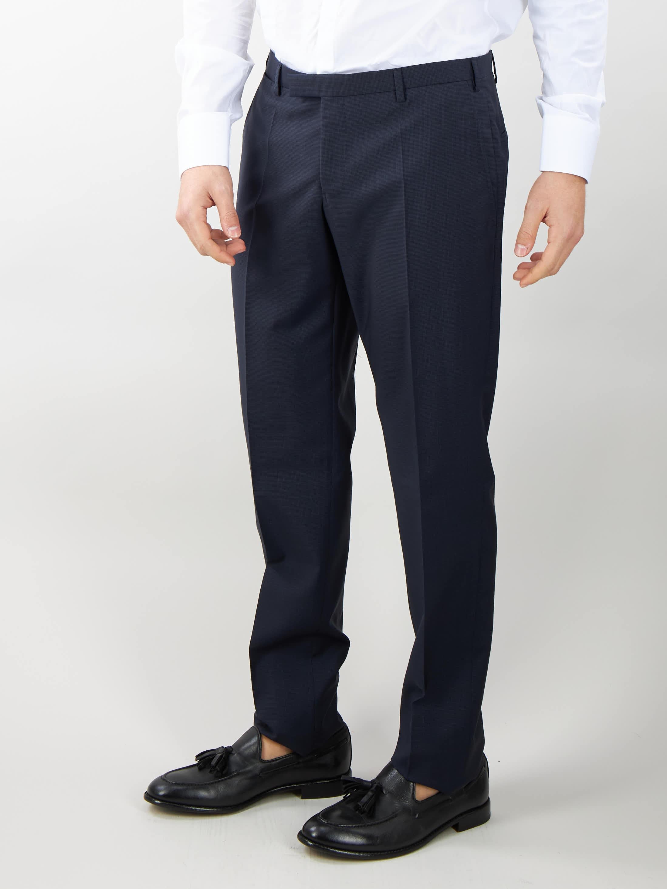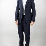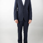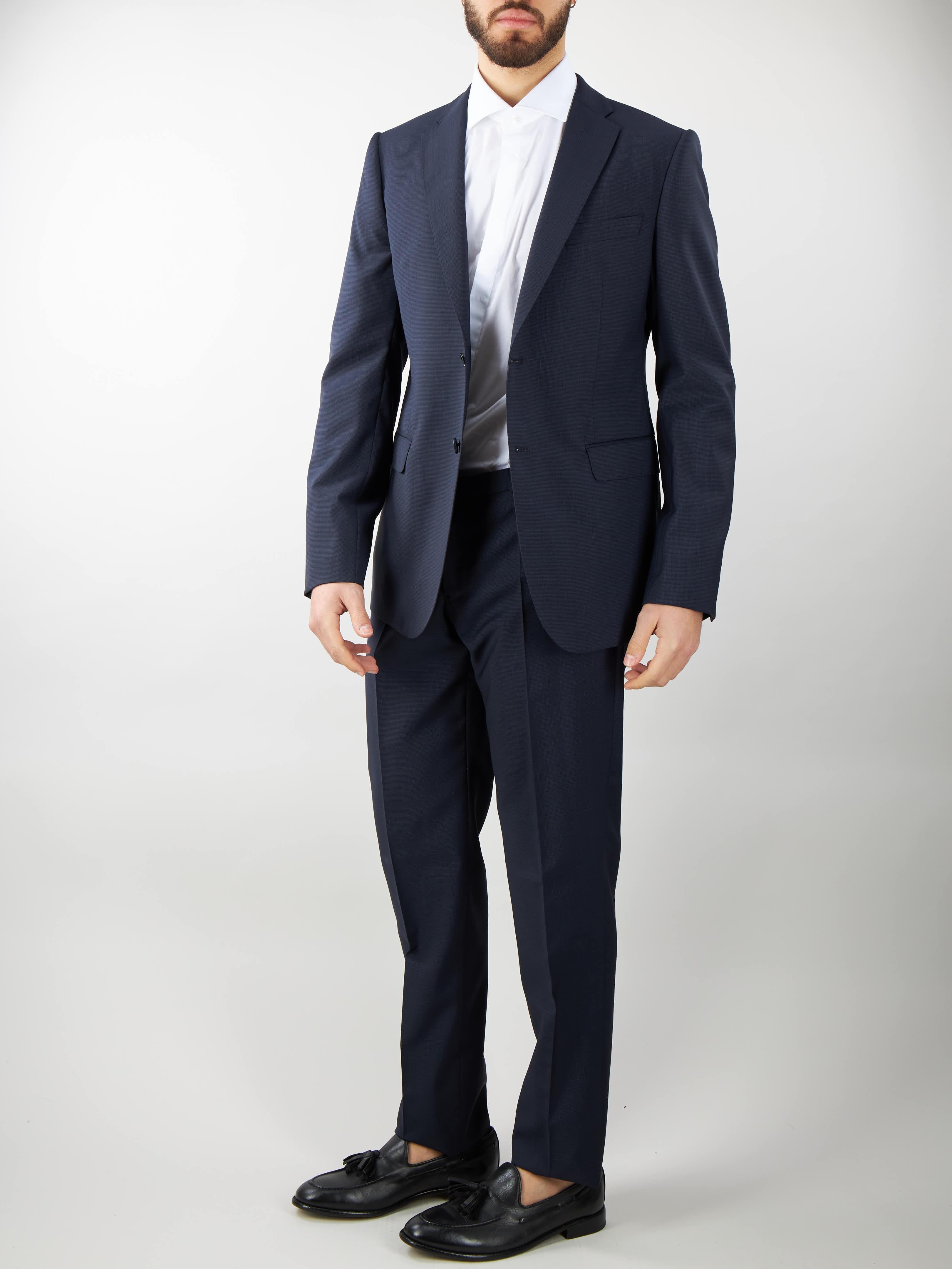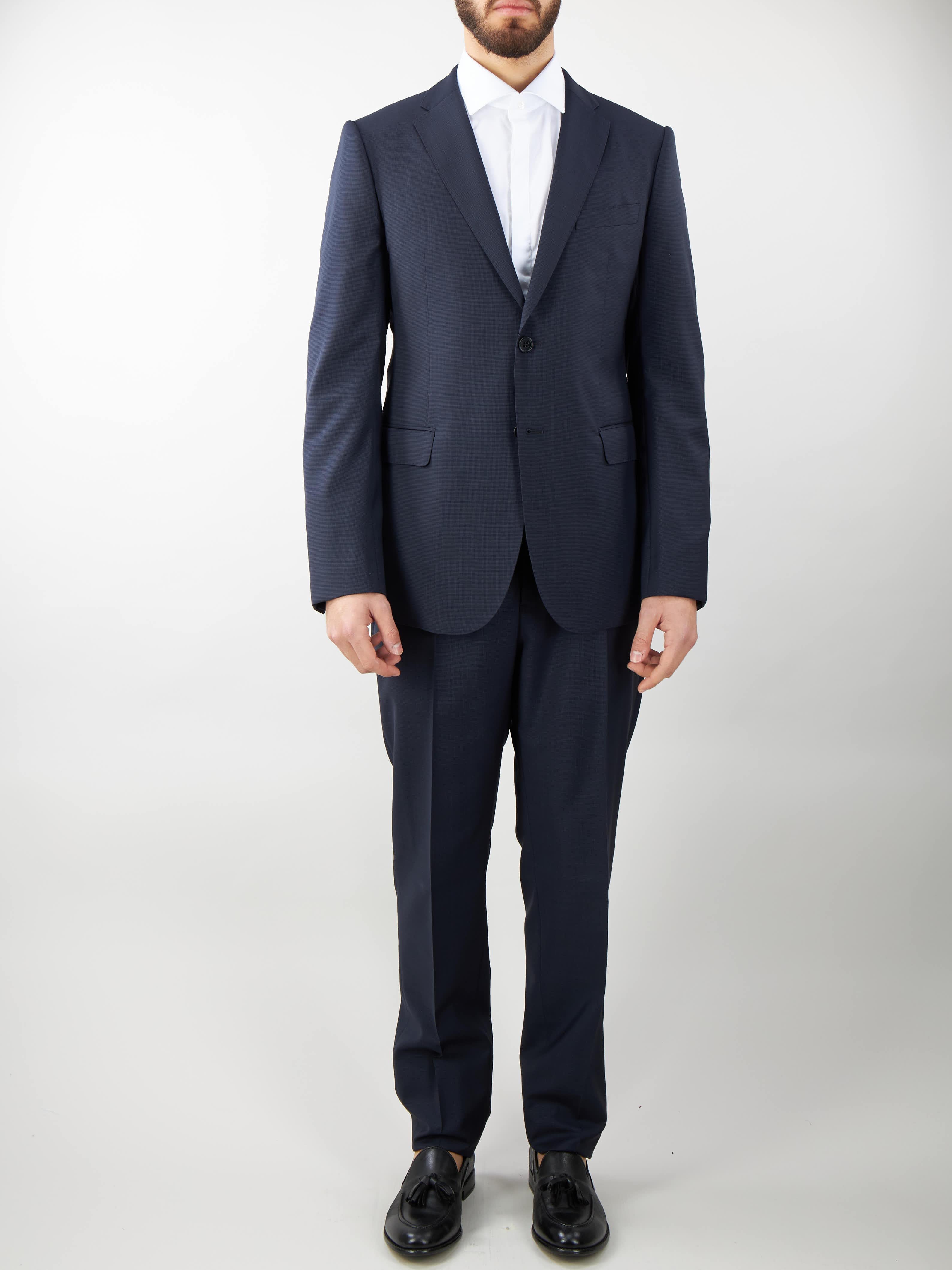Abito in fresco lana di Emporio Armani. Modello monopetto con rever a specchio, tasche a filo con pattina sul davanti e taschino sul petto. Chiusura centrale con due bottoni. Pantalone regular, tasche america laterali e tasche a filo sul retro. Chiusura centrale con zip e bottone.