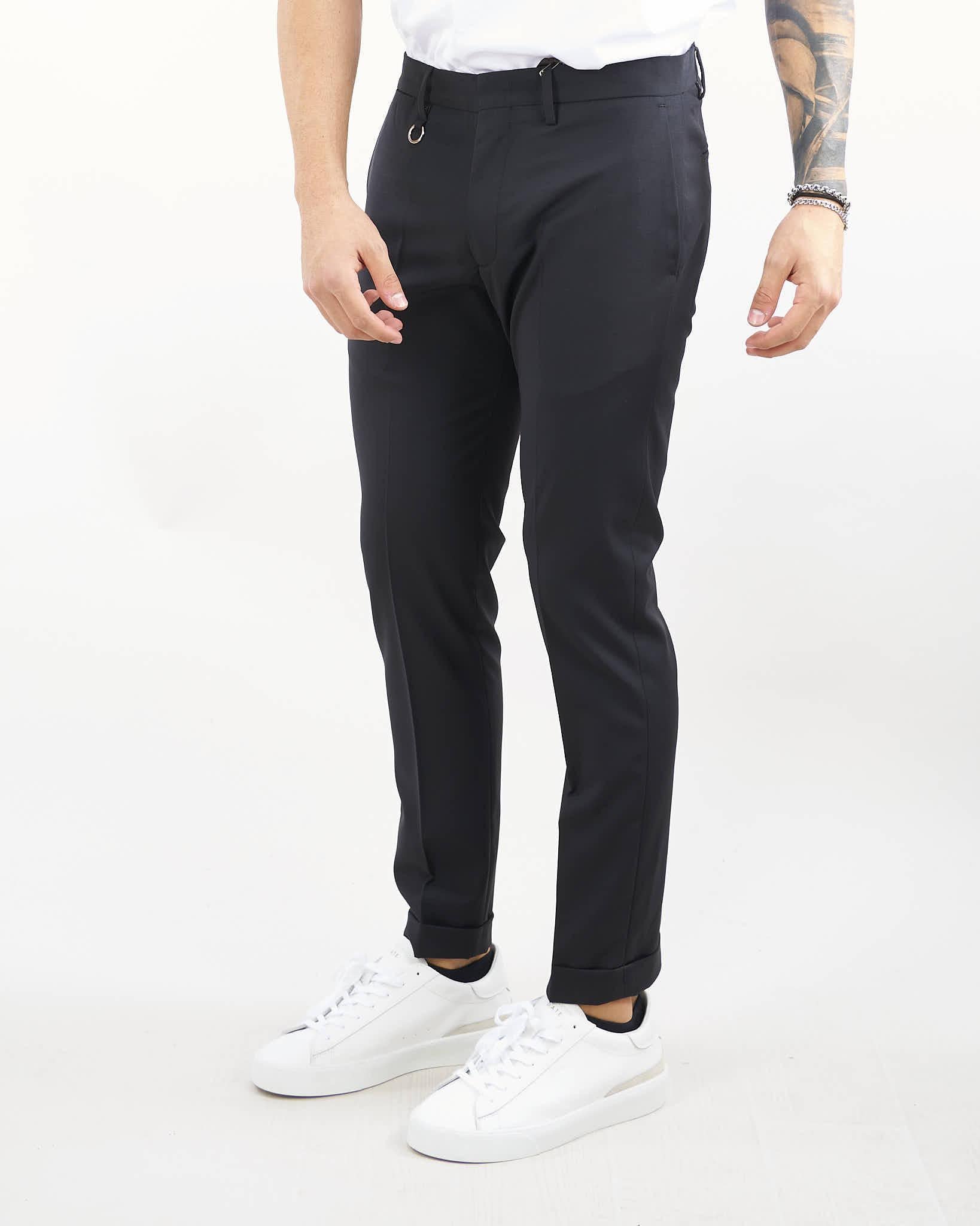 Pantalone Roxy in fresco lana di Golden Craft. Modello con tasche america laterali e tasche a filo sul retro. Fondo con risvolto. Chiusura centrale con zip e gancio. Vestibilità slim.