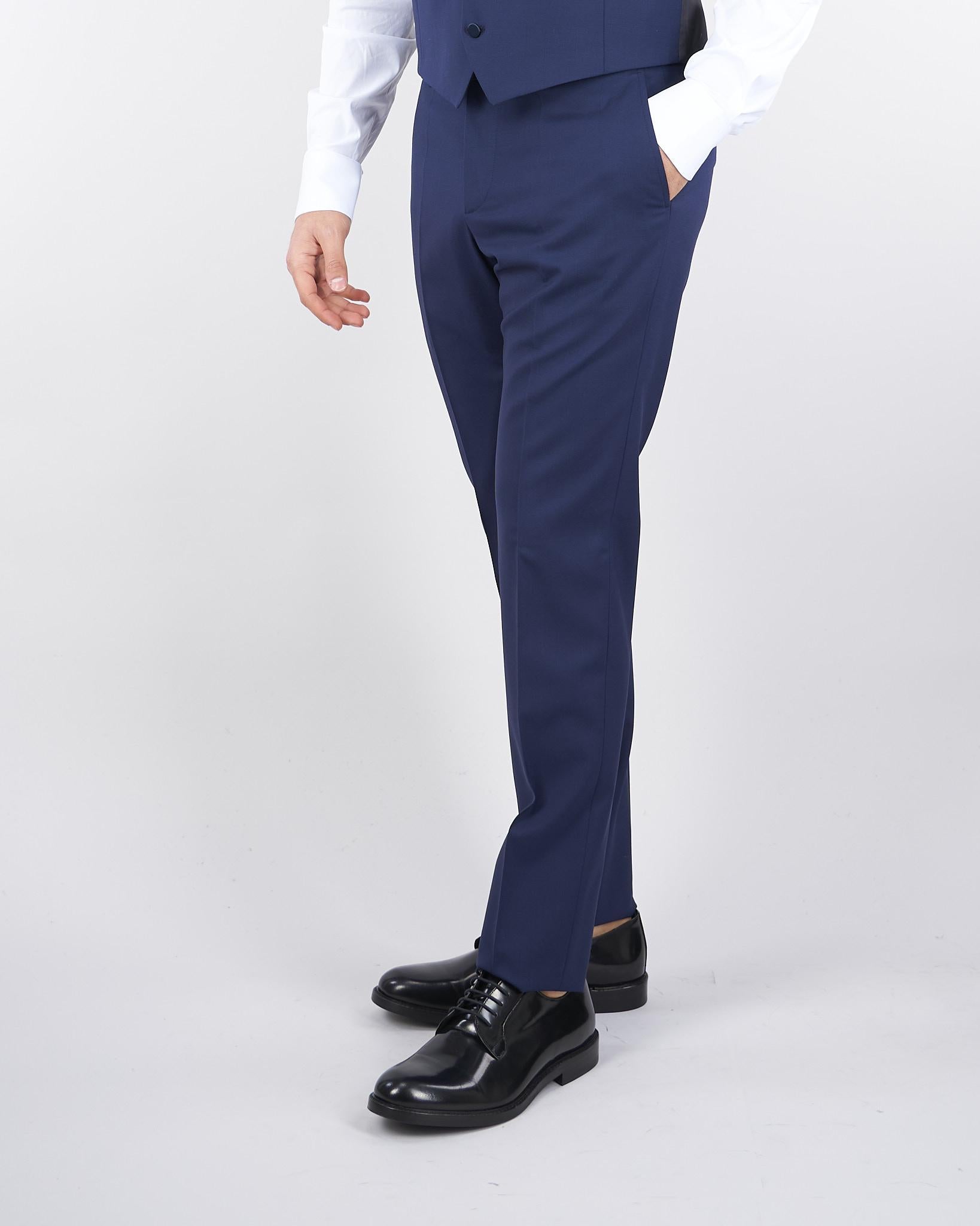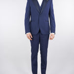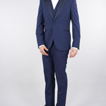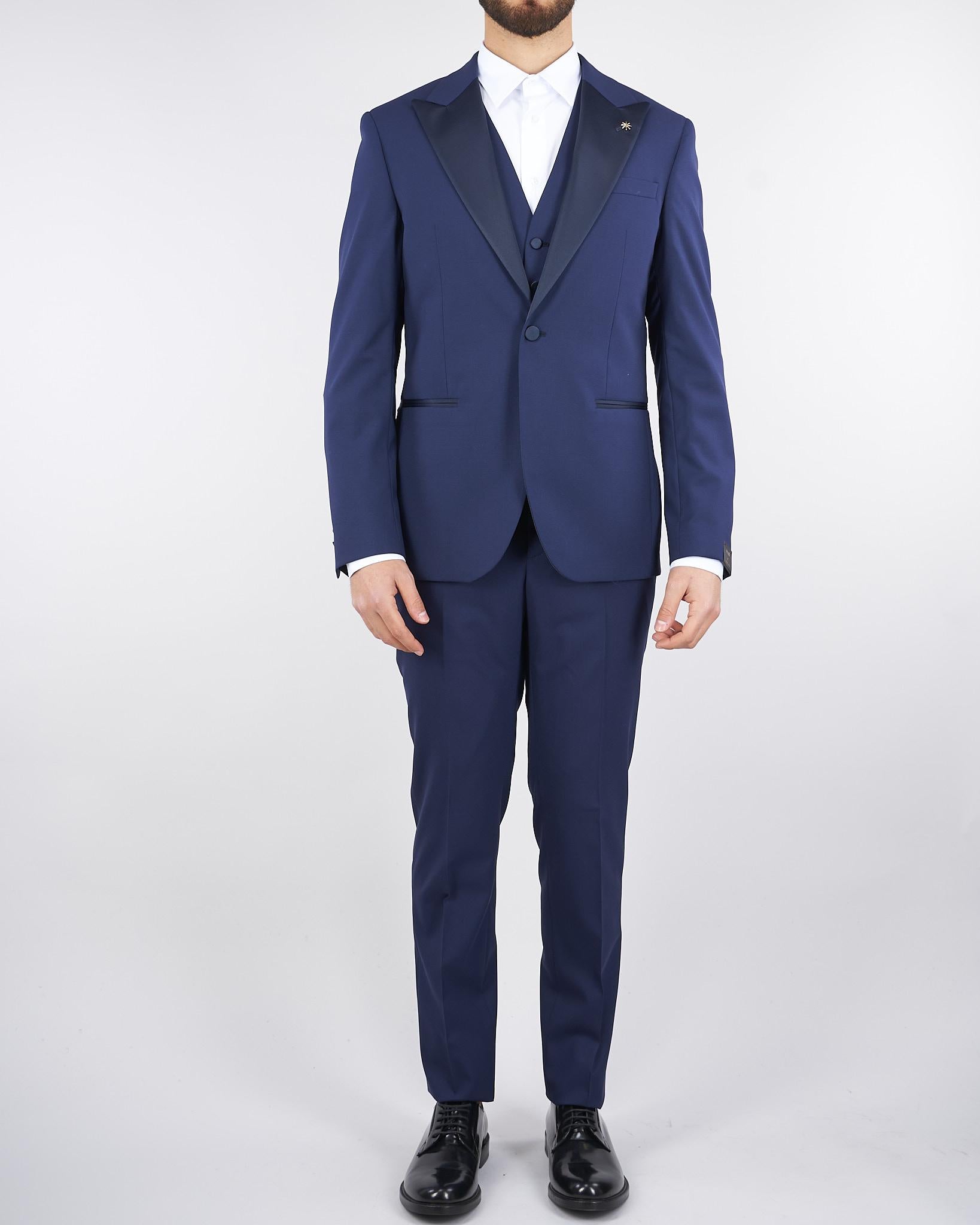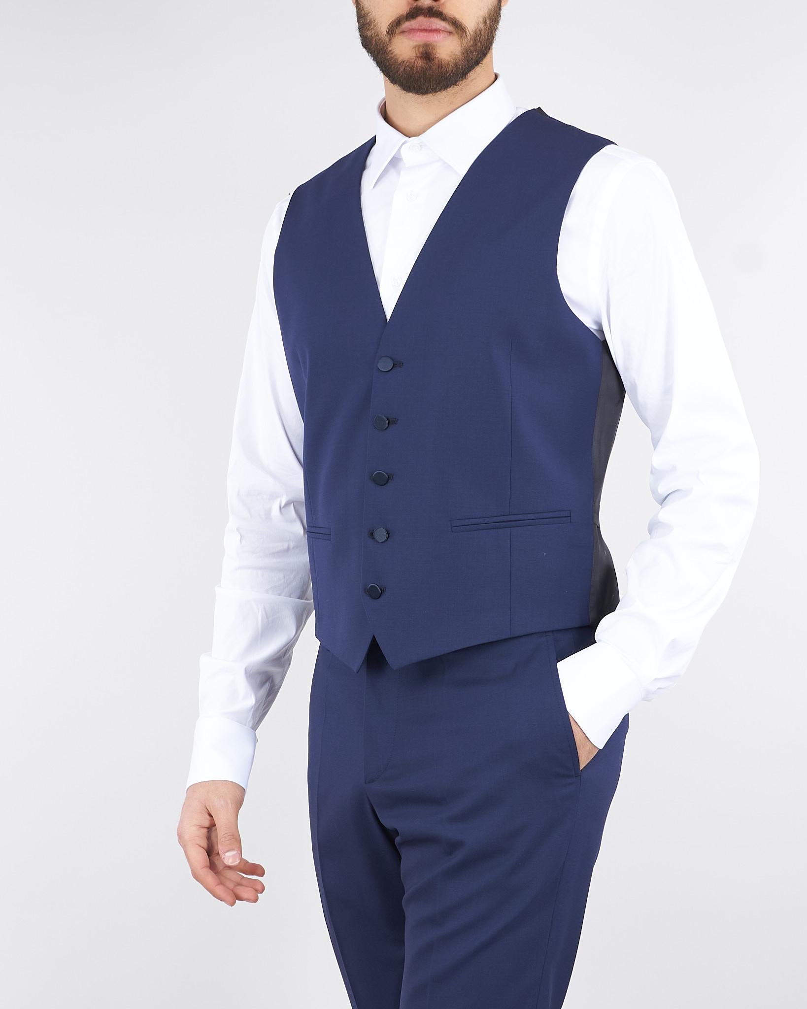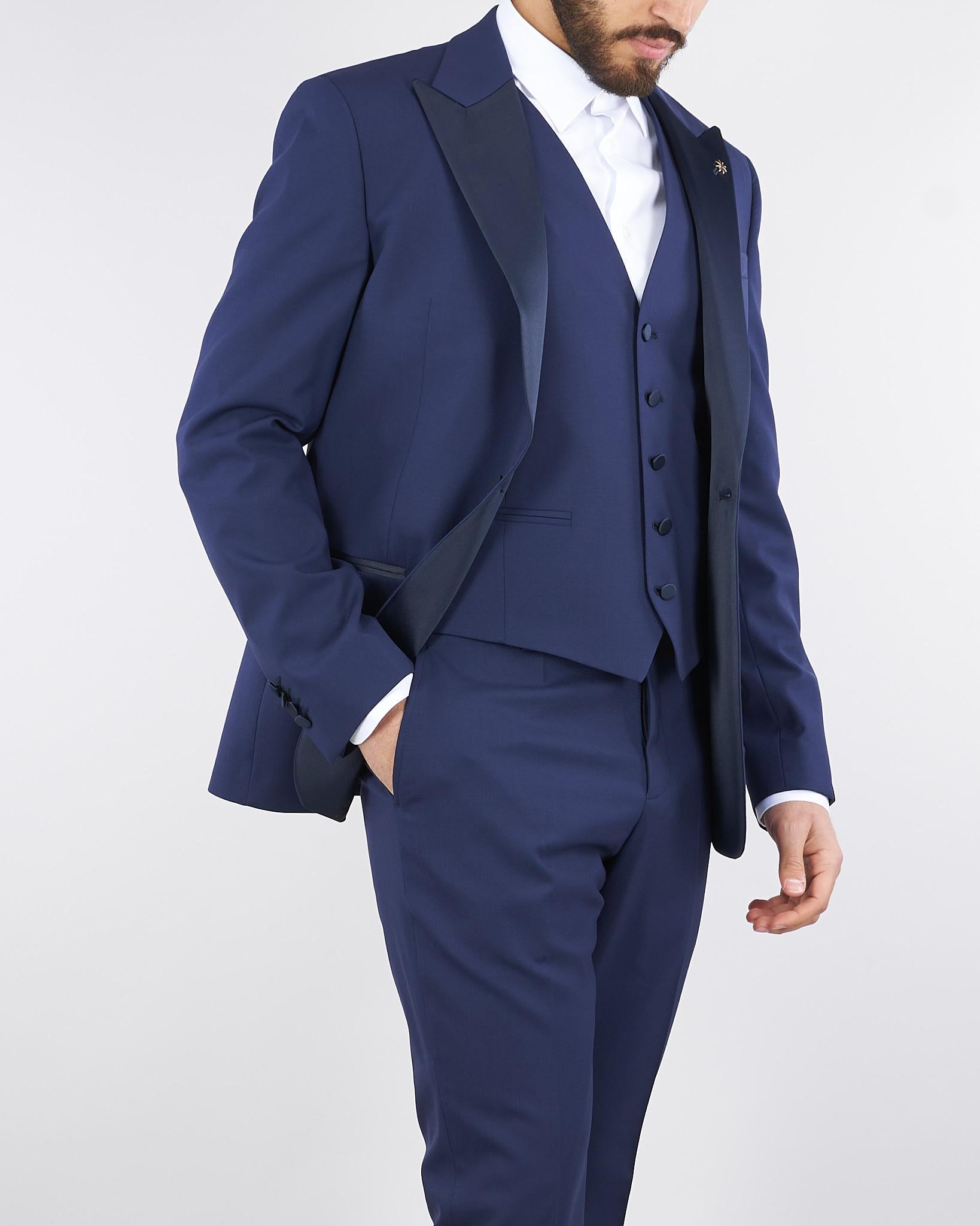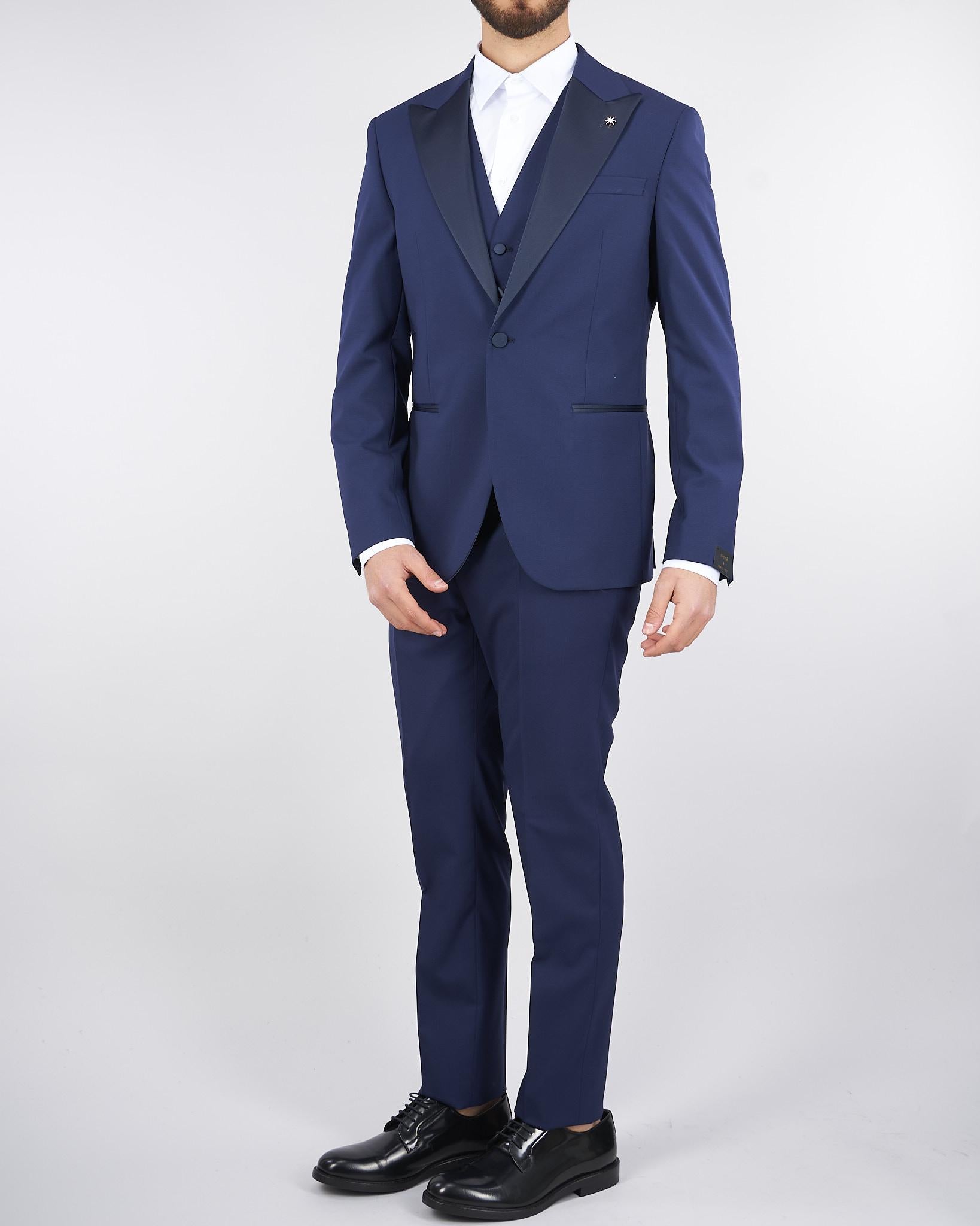 Abito smocking in pura lana vergine di Manuel Ritz. Modello monopetto con rever a lancia in raso, tasche a filo con profili in raso sul davanti e taschino sul petto. Chiusura centrale con un bottone ricoperto in raso. Doppio spacco sul retro. Panciotto in coordinato, regolabile sul retro, tasche a filo e chiusura centrale con bottoni ricoperti in raso. Pantalone slim, tasche francesi laterali e tasche a filo sul retro. Chiusura con bottone. Vestibilità slim.