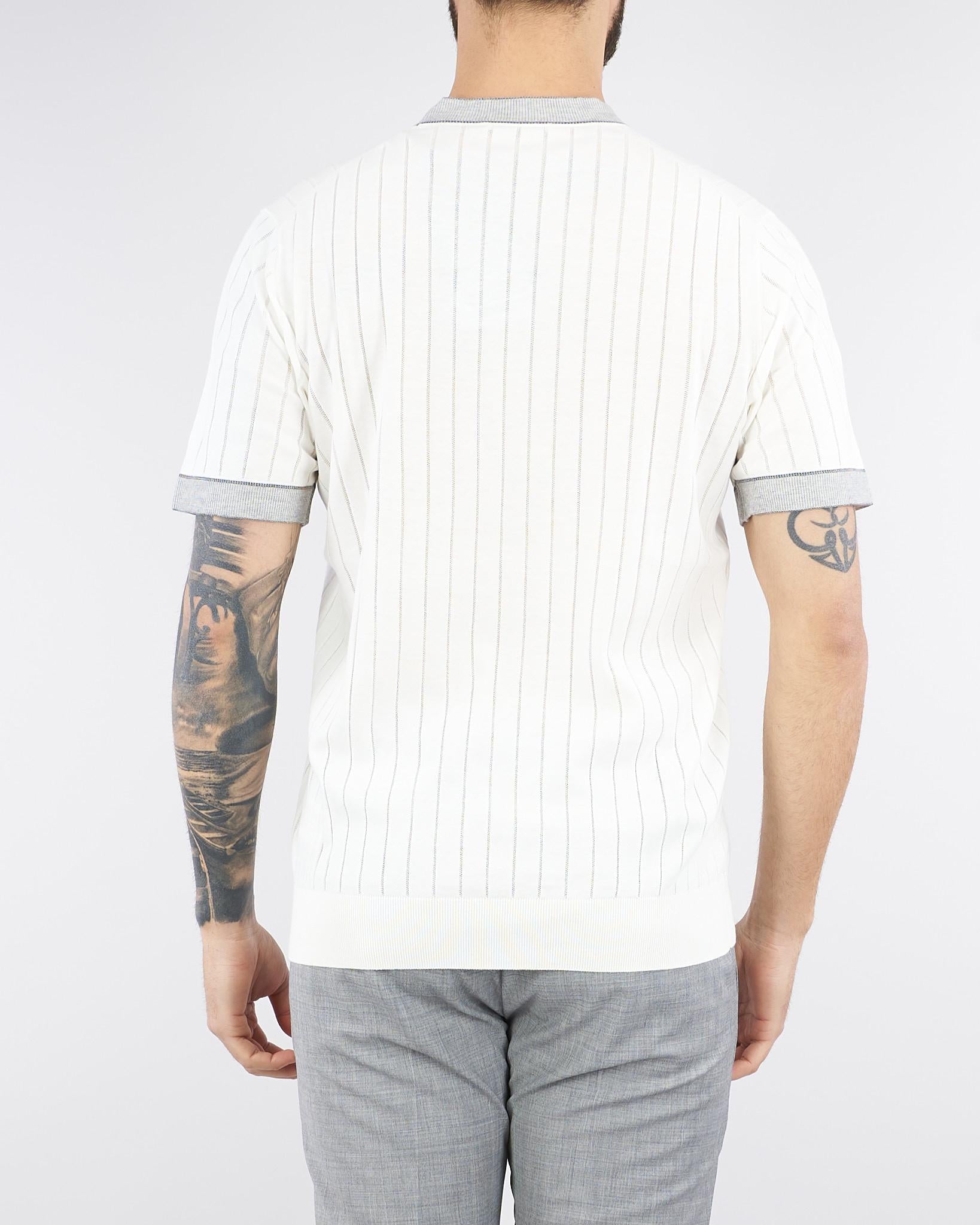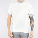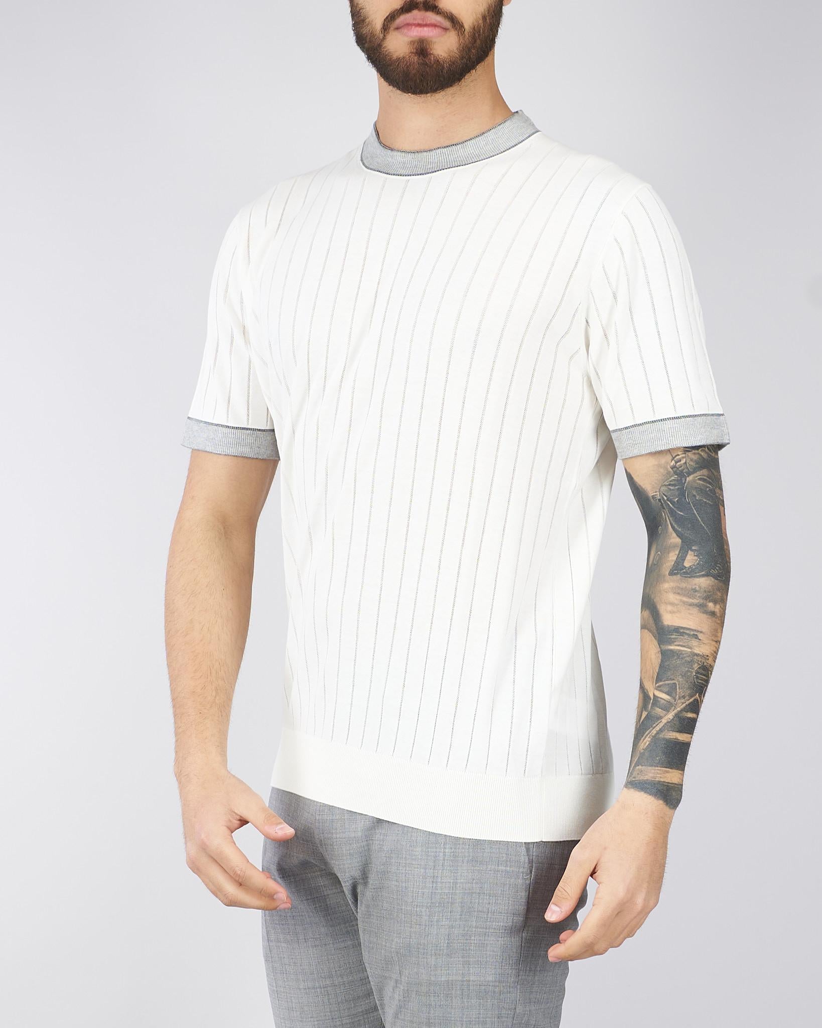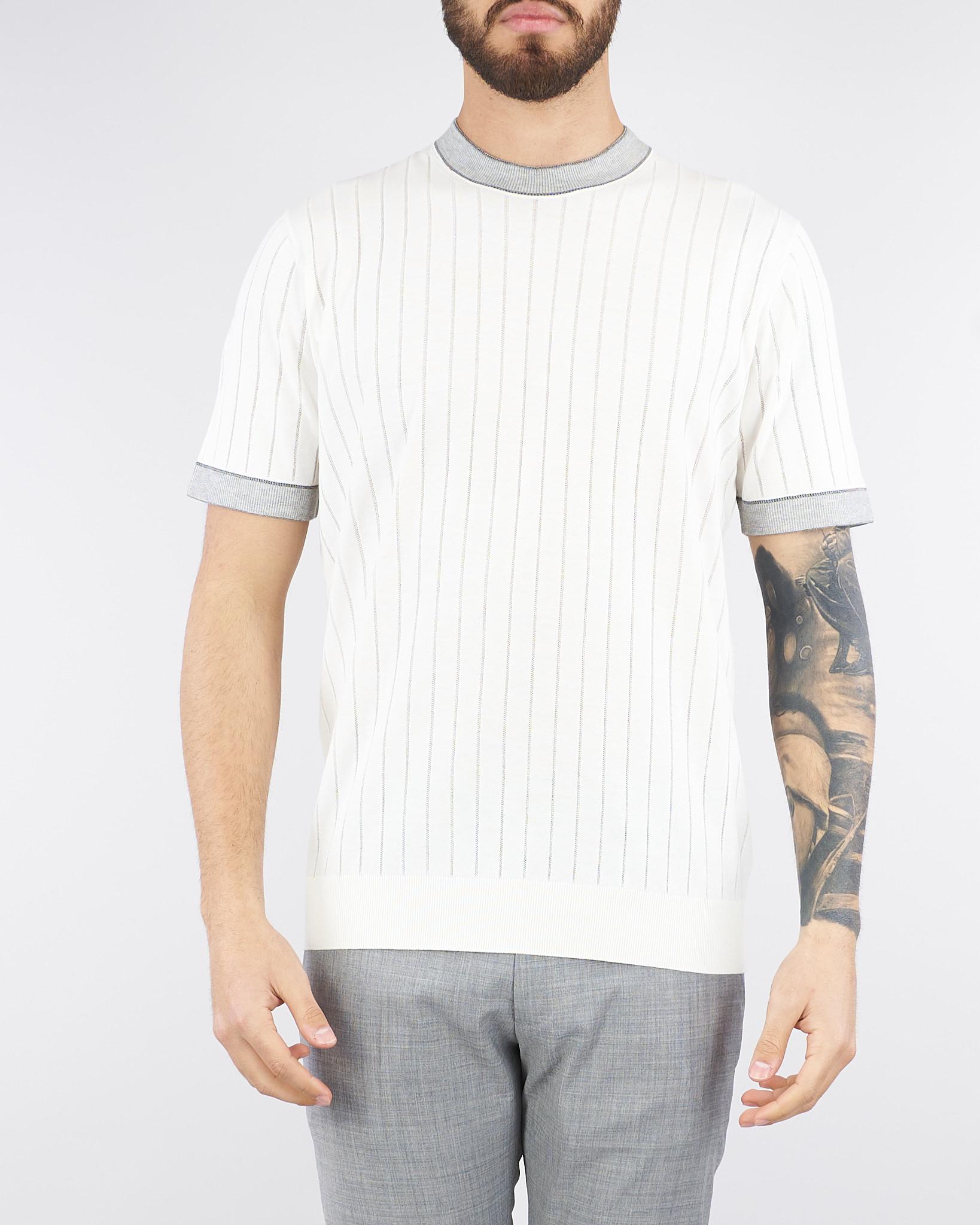 Maglia jacquard in cotone di Paolo Pecora. Modello girocollo con maniche corte. Motivo trama a righe verticali. Bordi a contrasto. Regular fit.