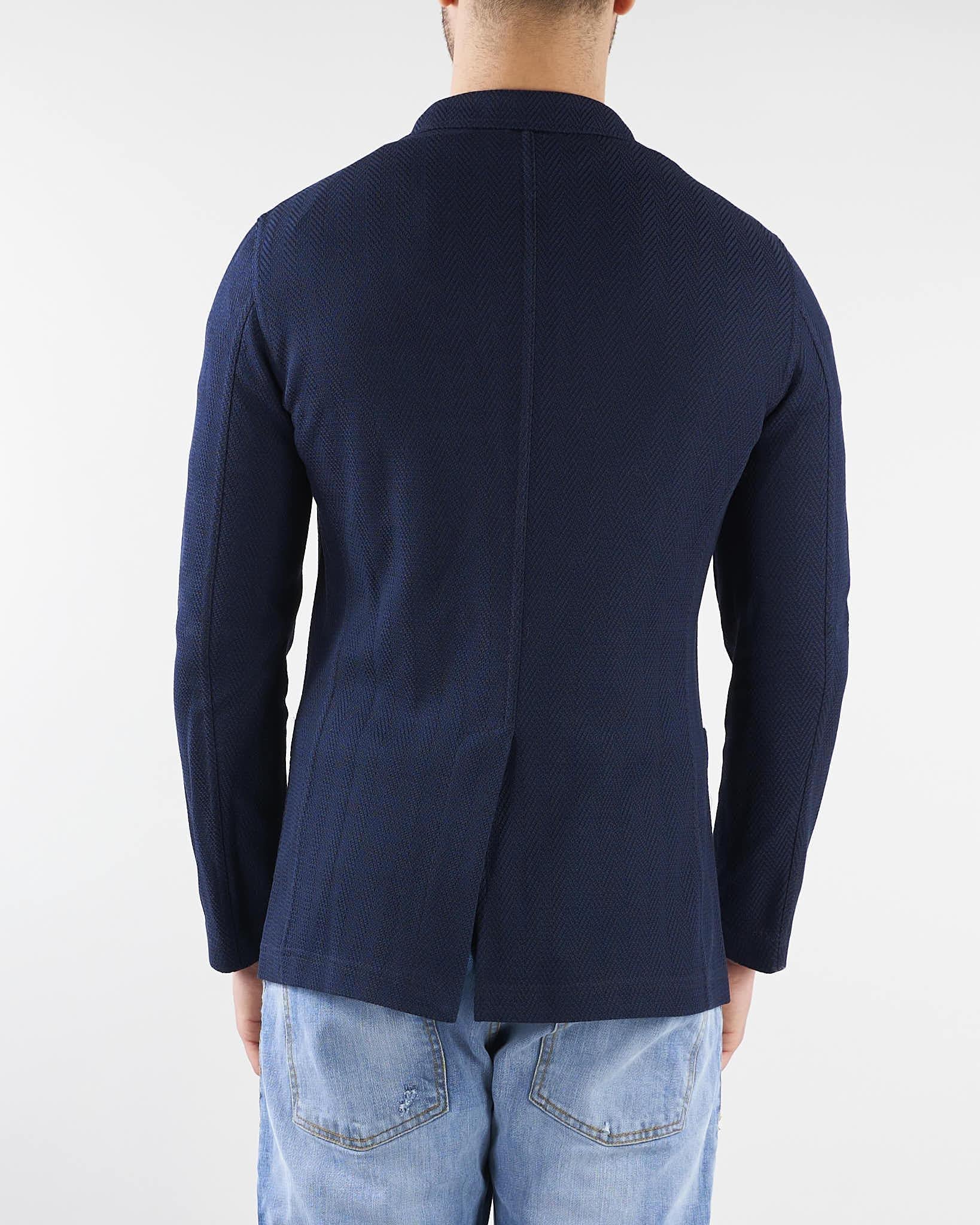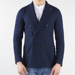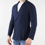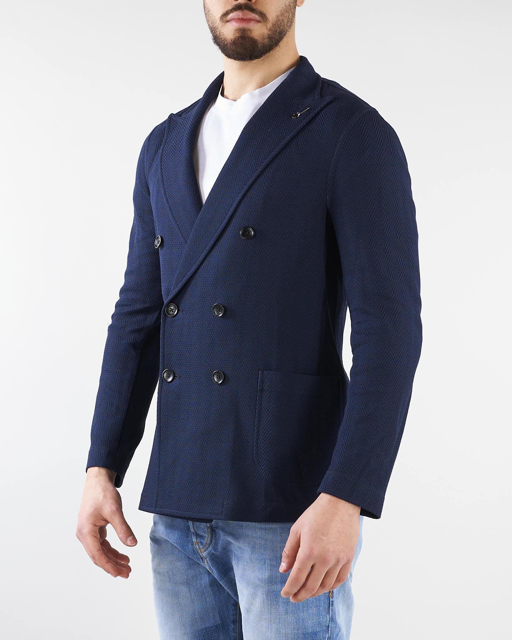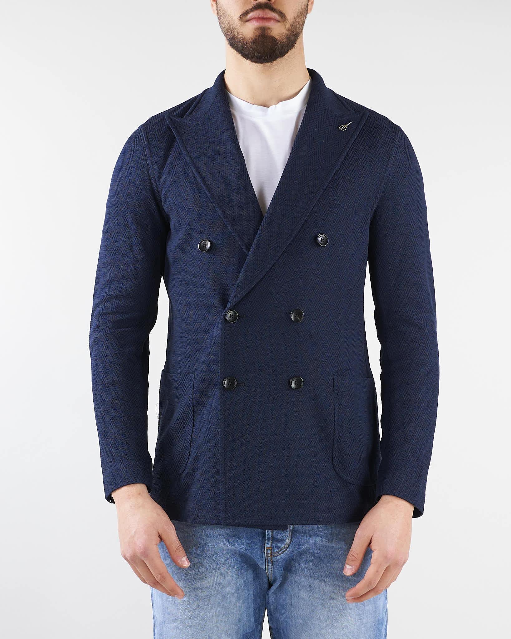 Giacca in maglia di Paoloni. Modello doppiopetto con rever a lancia e tasche a toppa sul davanti. Spacco sul retro. Chiusura centrale con bottoni. Spilla iconica sul rever.
