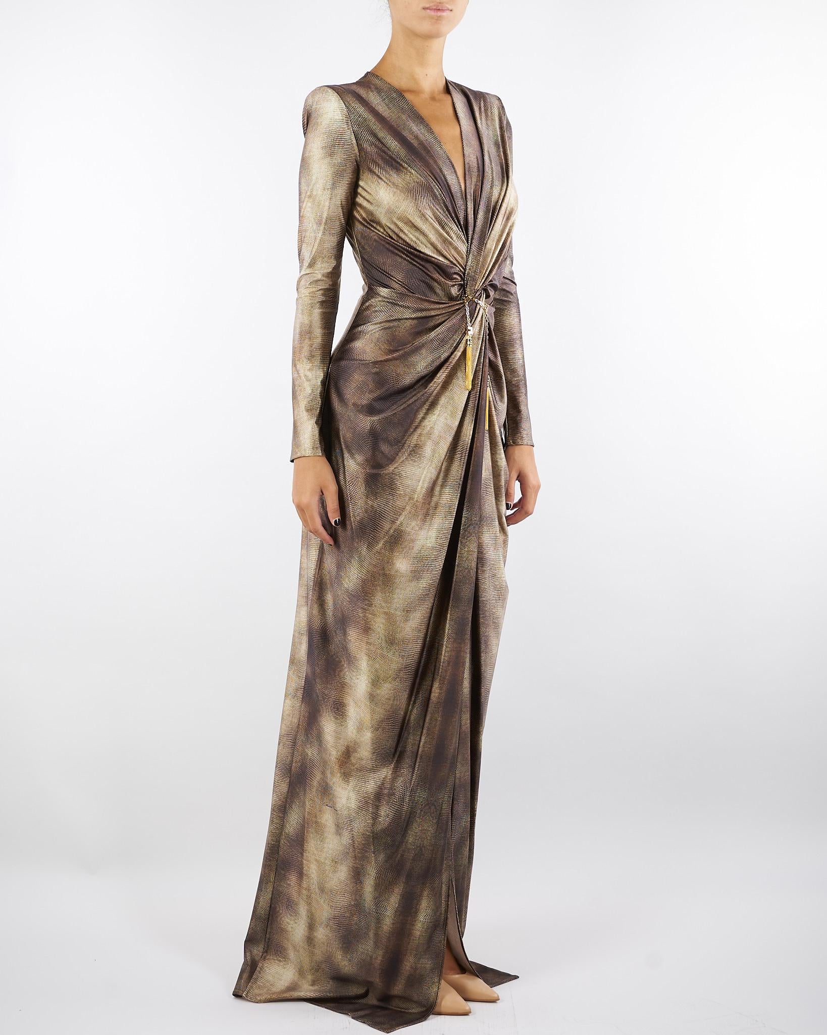 Abito da sera in lycra dalla vestibilità aderente. Il vestito ha spalle strutturate e si distingue per il nodo centrale impreziosito dal dettaglio gioiello amovibile, in catena e con nappine a trama snake. Protagonista è la stampa con fantasia pitone, ingentilita da ipnotiche sfumature. Spacco anteriore.