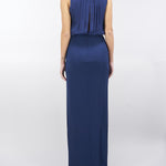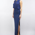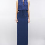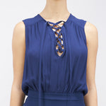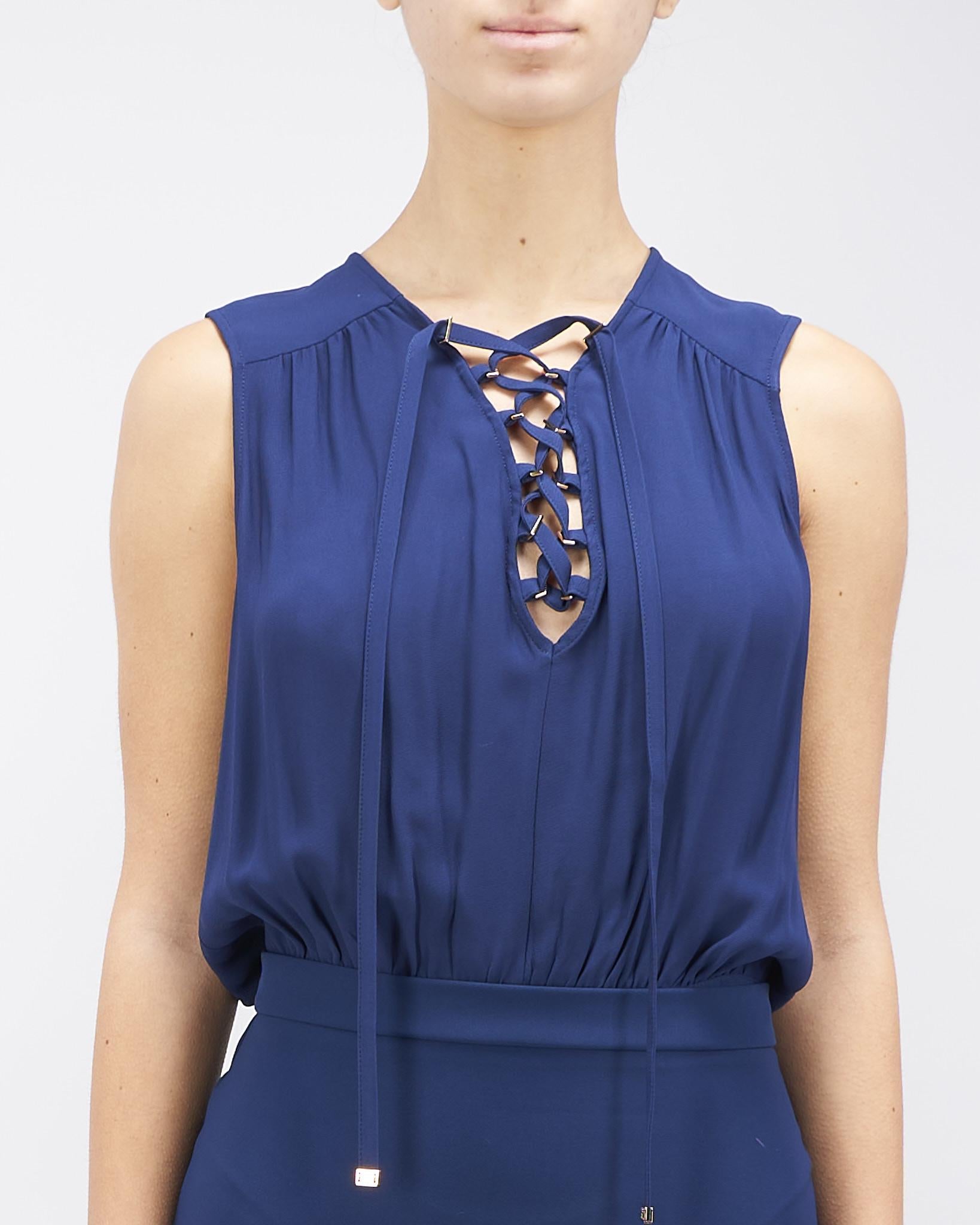 Abito smanicato in doppio crêpe leggero con gonna lunga e spacco laterale. Ha parte superiore amovibile, caratterizzata dal profondo scollo a V con lacci intrecciati in georgette e impreziositi da finalini logati in metallo dorato. Le arricciature sulle spalle donano movimento. Un ultimo dettaglio di stile sul punto vita, con il fiocco gioiello con logo in metallo dorato. Vestibilità regular.