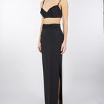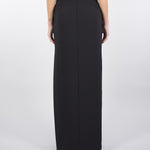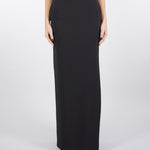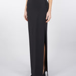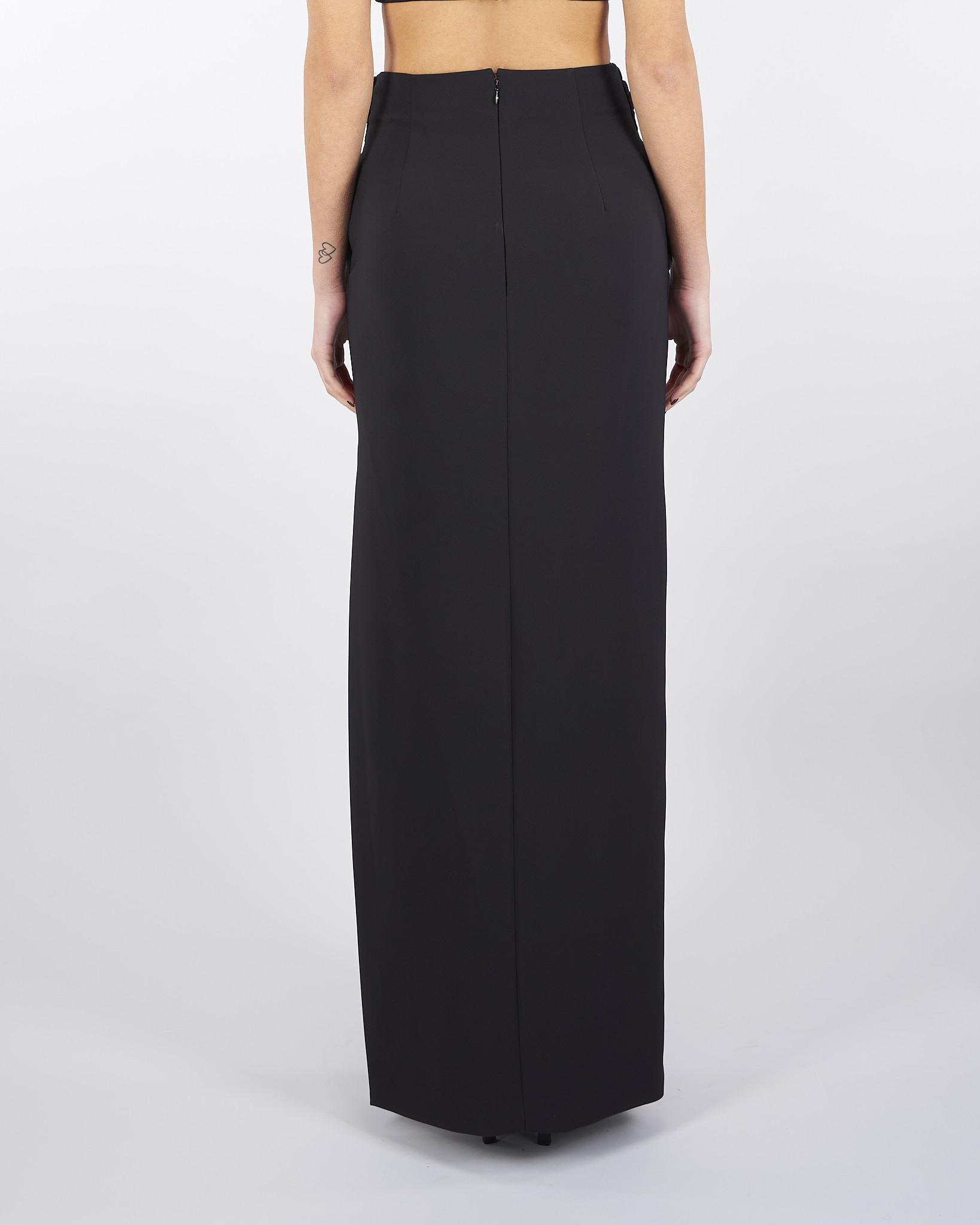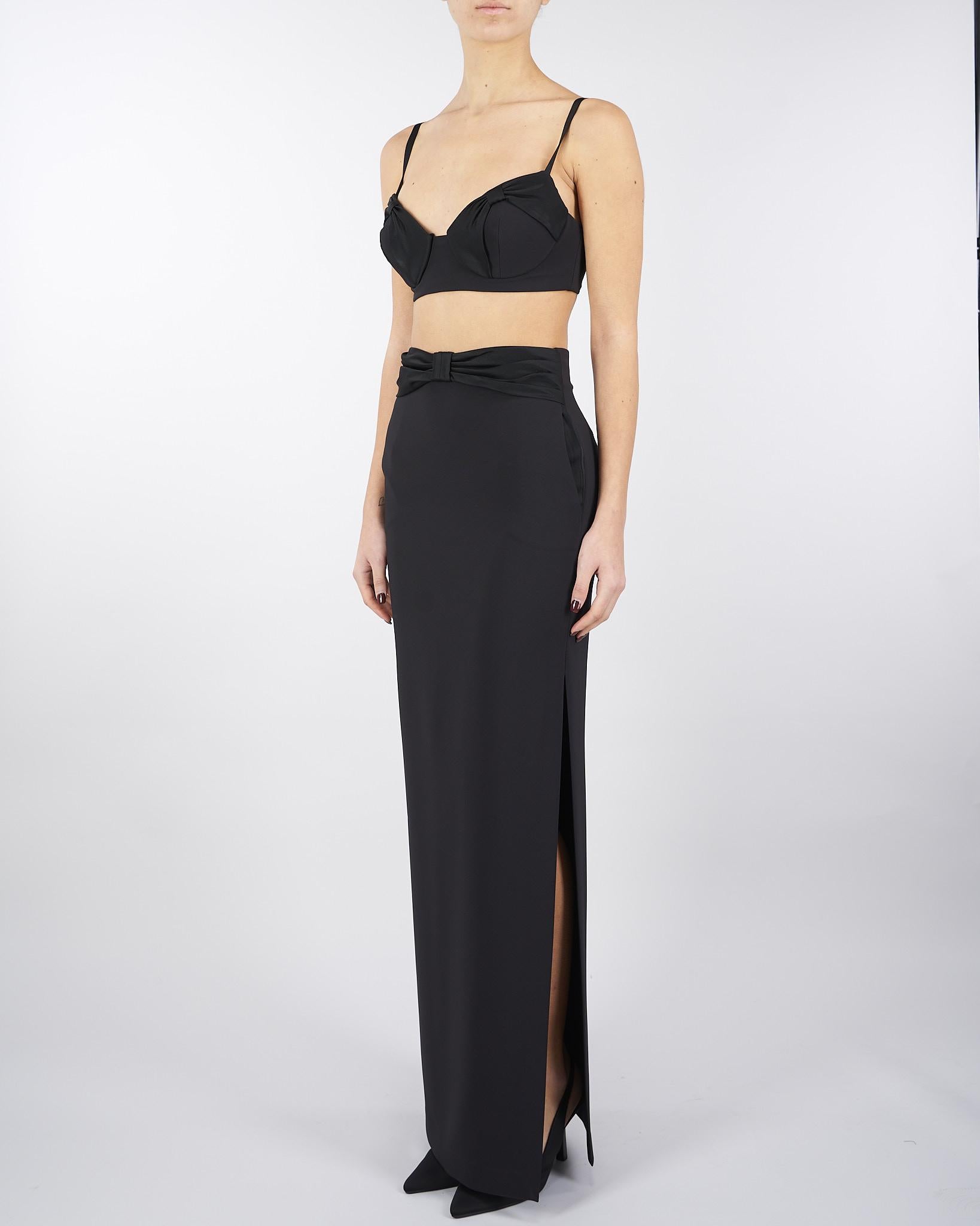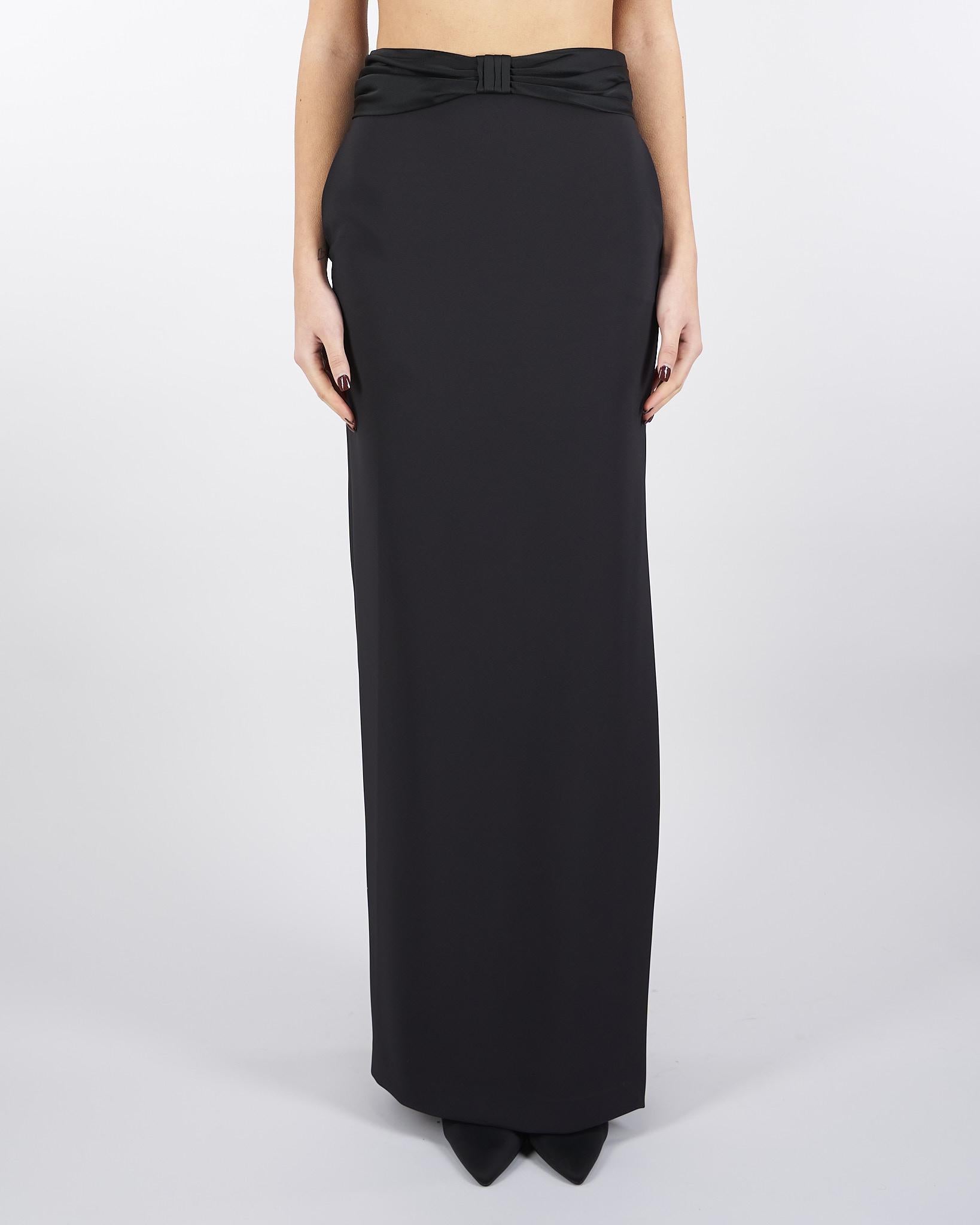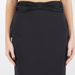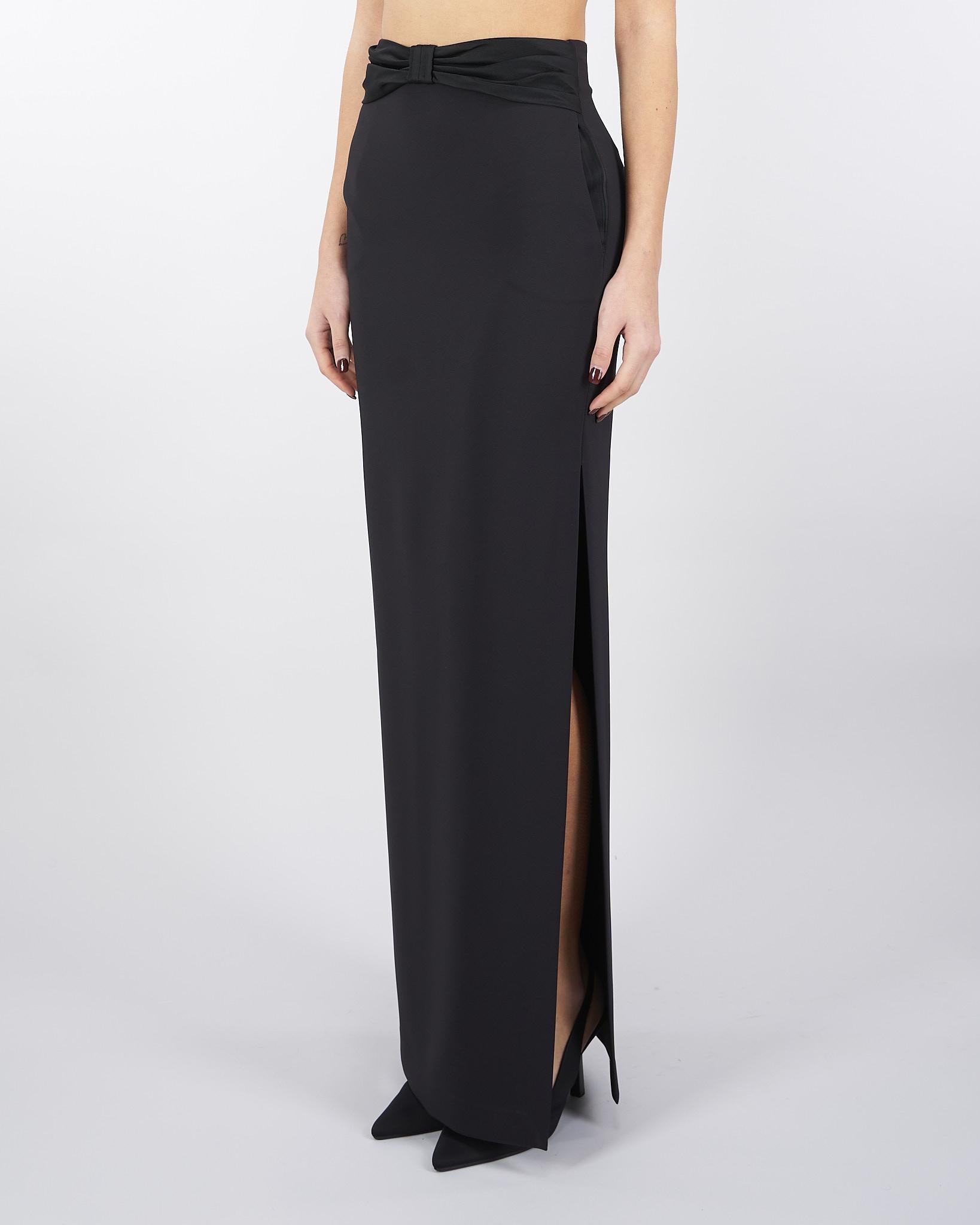 Gonna in crêpe leggero con tasche e spacco laterale. Il dettaglio di stile è il fascione in raso, ingentilito dal motivo a fiocco.