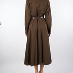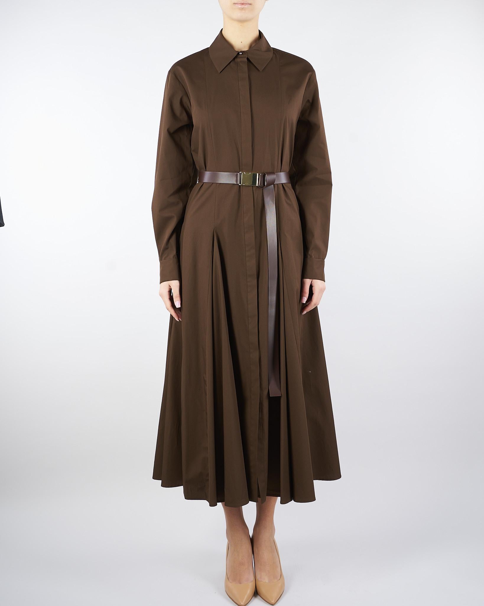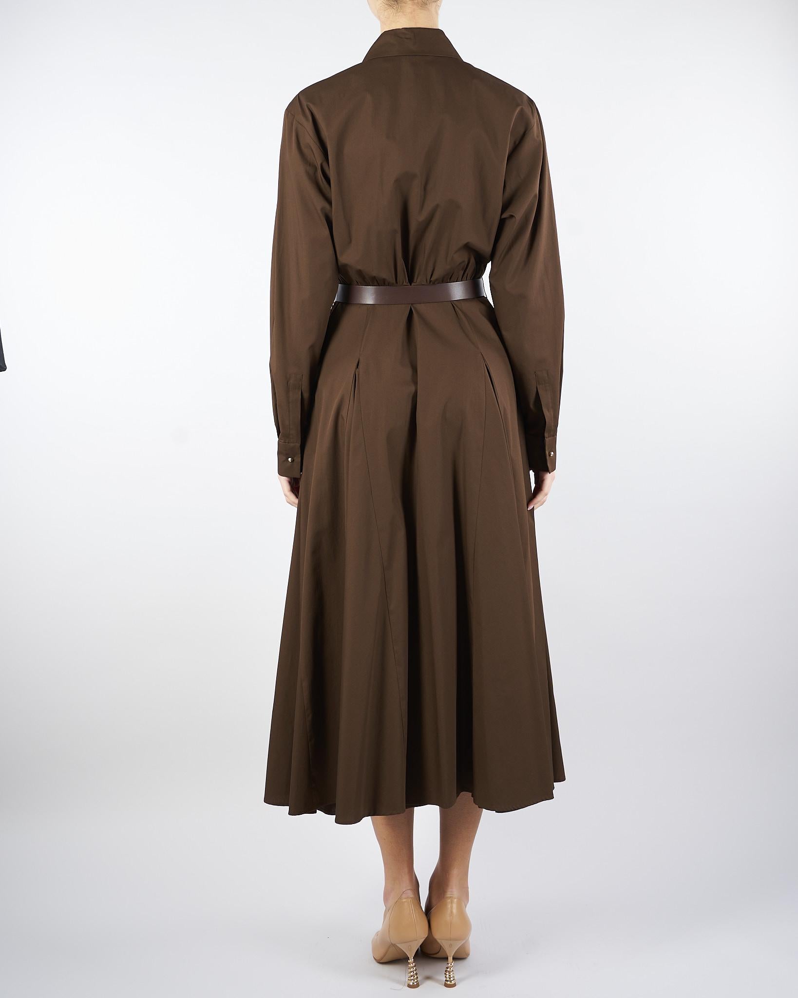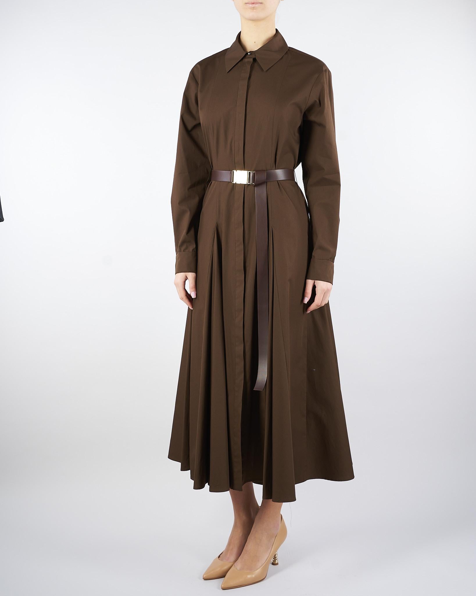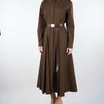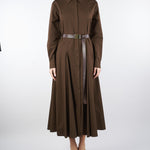 Abito chemisier lungo realizzato in morbido popeline di puro cotone. Il modello è caratterizzato da classico colletto a camicia e maniche lunghe con polsino e bottone. Il motivo di tagli e spicchi sulla gonna disegnano la silhouette mentra la cintura abbinata evidenzia il punto vita. Chiusura frontale con bottoni nascosti e primo bottone a vista metallo.