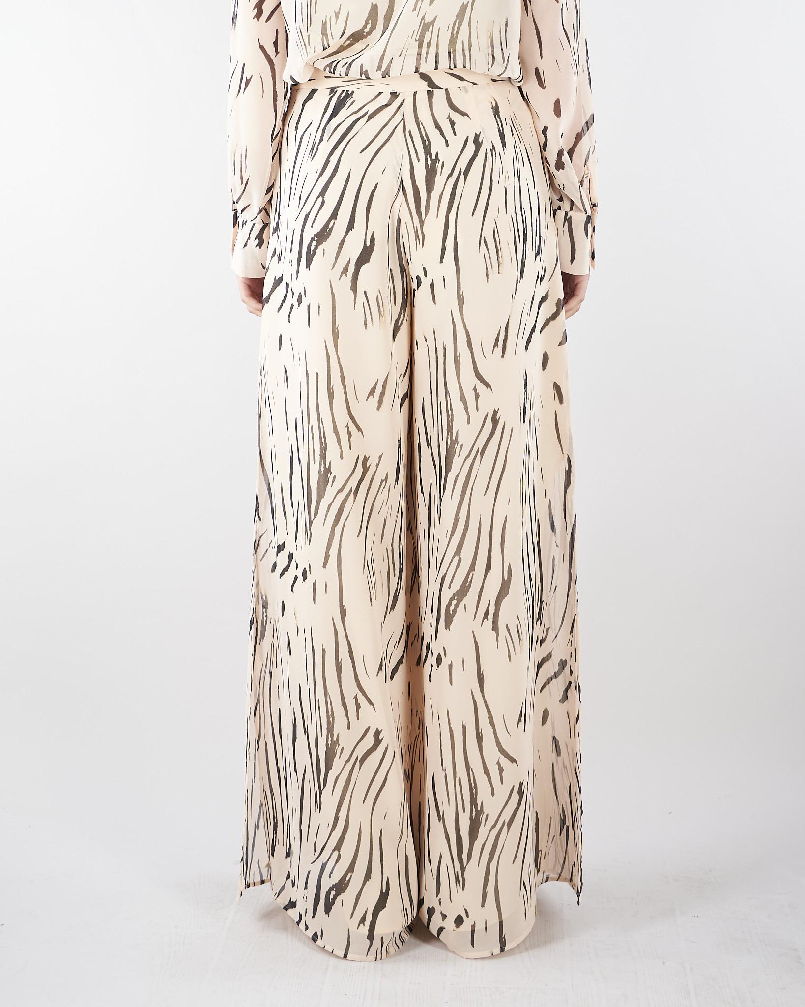 Una ricercata elaborazione grafica di un grintoso motivo zebrato caratterizza questi pantaloni in georgette: eleganti, accompagnano il passo con maxi ampiezze mosse da spacchi. Gamba leggermente svasata. Vita regolare. Spacchi laterali. Tasche inserite ai fianchi. Zip invisibile al fianco. Blusa coordinata in collezione. Fit ampio.