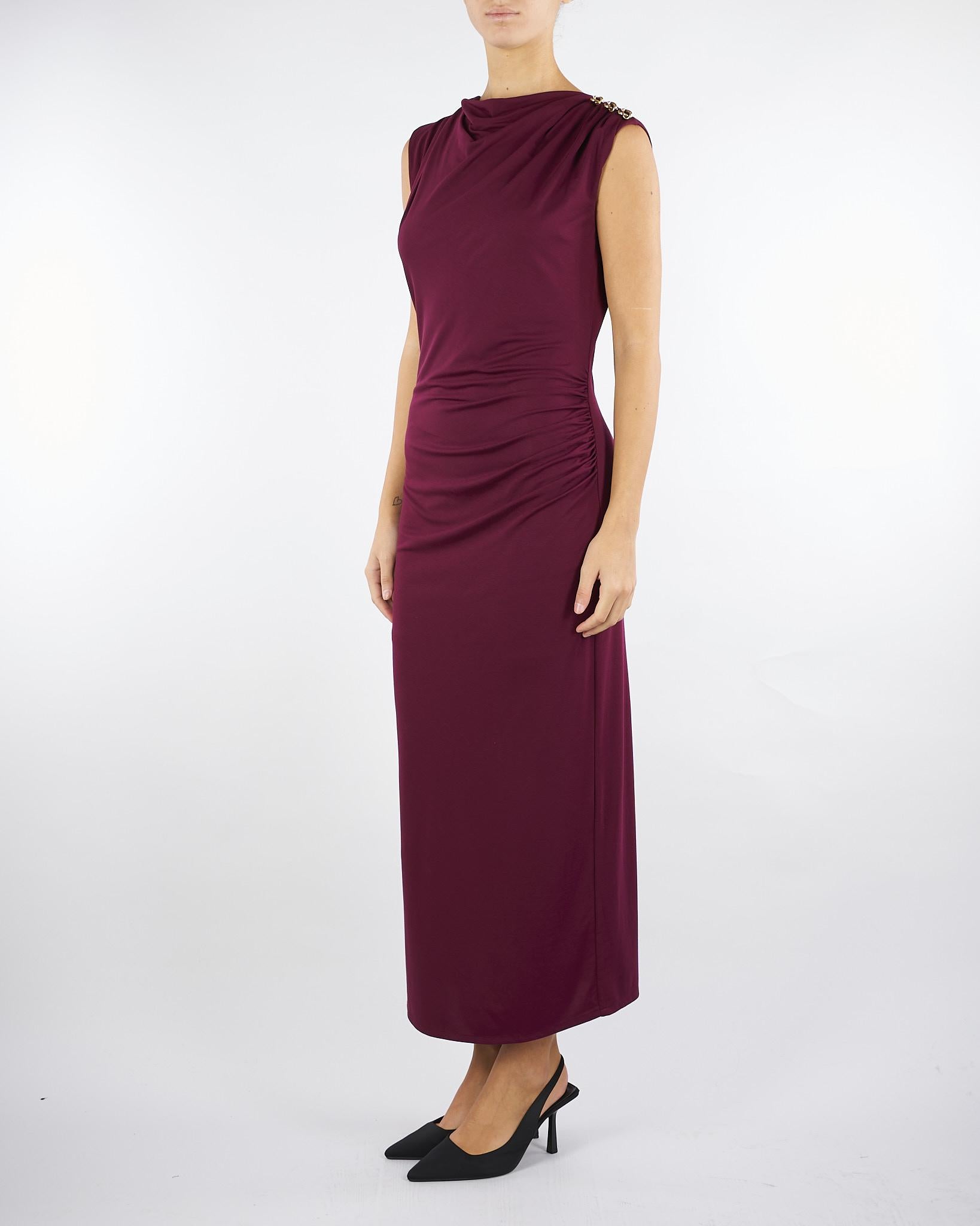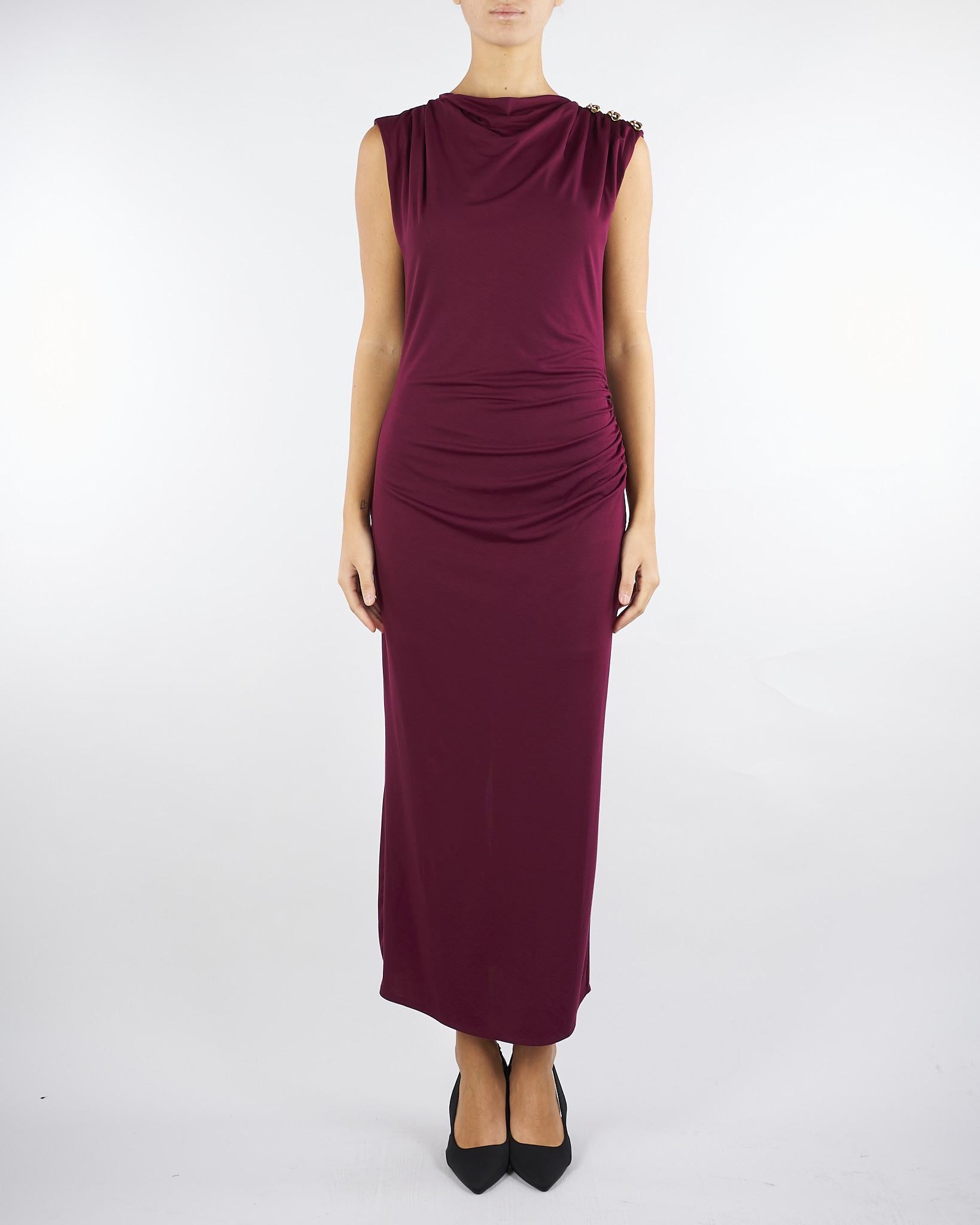 Facile vincere la gara dell'eleganza quotidiana con questo abito in jersey dal fit aderente. La silhouette è scolpita, le braccia scoperte, il busto abbellito da un arriccio su spalle e fianco sinistro. Il look è completato dai bottoni gioiello sulla spalla sinistra.. Abito in jersey di viscosa con fodera interna. Fit aderente e femminile. Collo a barchetta leggermente drappeggiato. Arriccio sulle spalle e sul fianco sinistro. Modello smanicato. Due bottoni gioiello sulla spalla sinistra.
