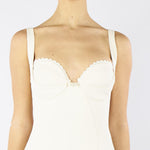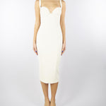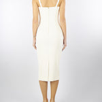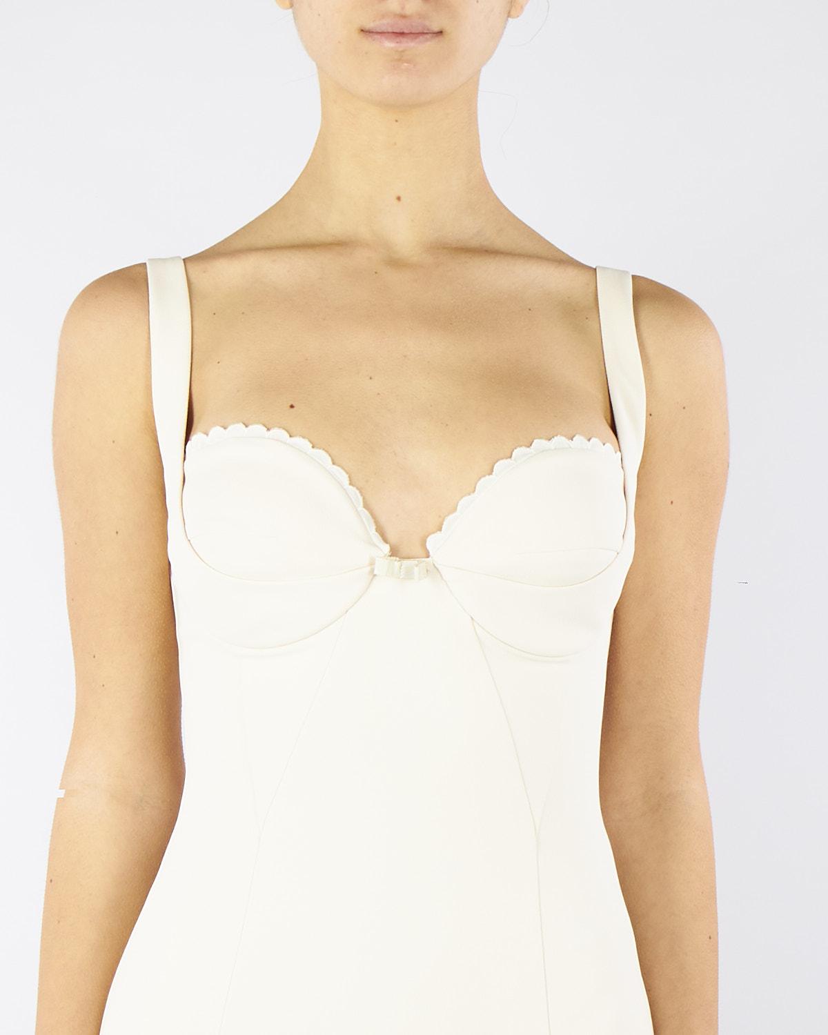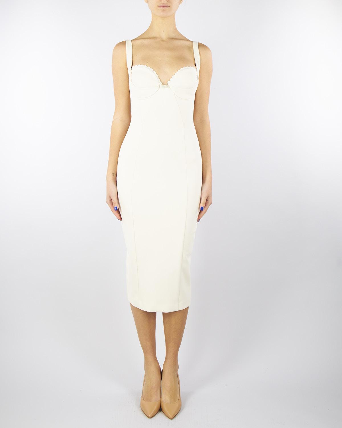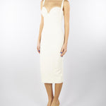 Abito in doppio crêpe stretch. Il vestito ha spalline e gonna midi. Essenziale e sofisticato grazie alle cuciture lineari sul davanti e sul retro, a disegnare una silhouette armoniosa. Il dettaglio di stile è lo smerlo ricamato sulle coppe, impreziosito da un piccolo fiocco in tono. Vestibilità aderente.