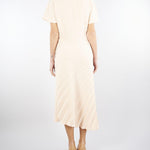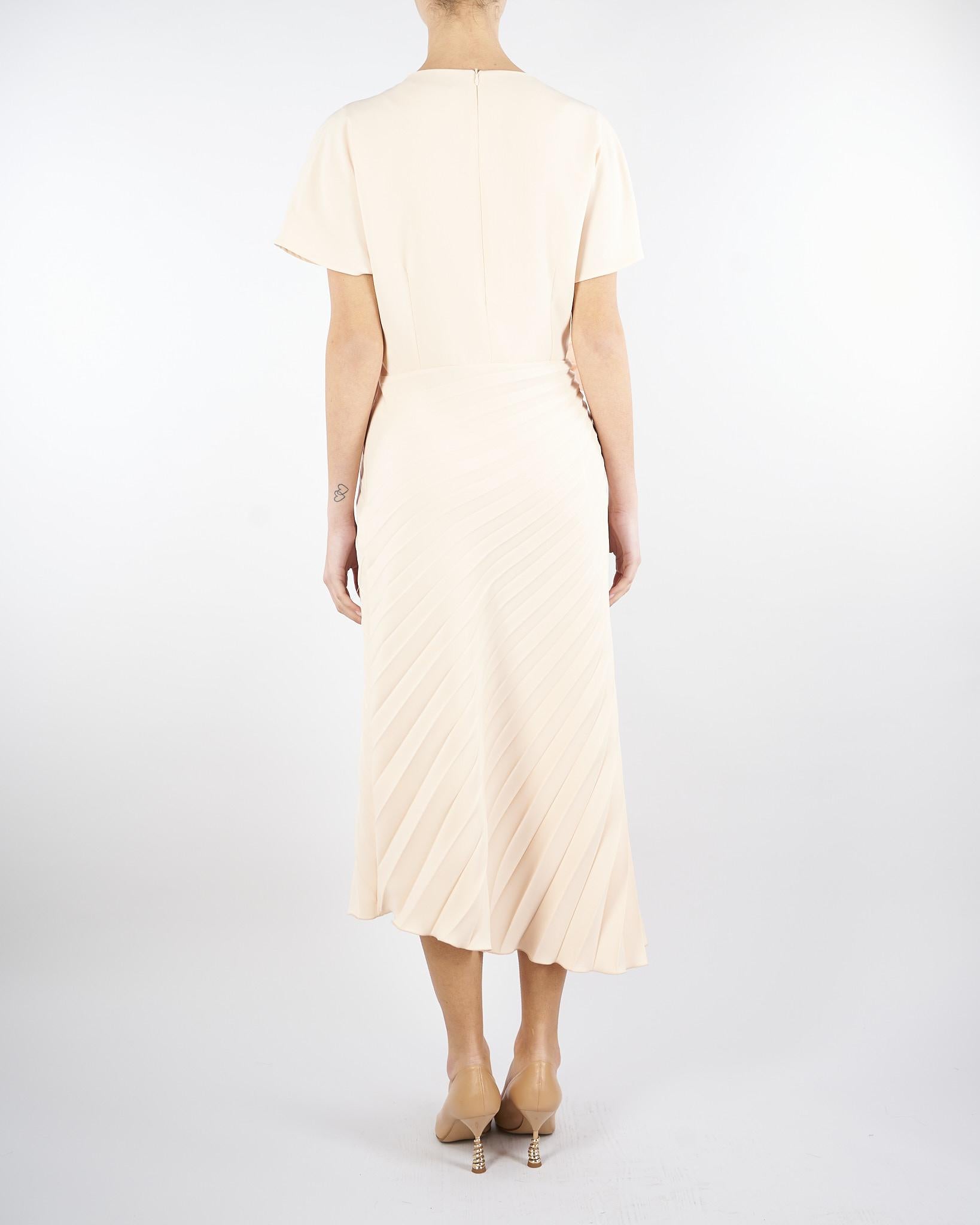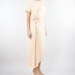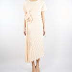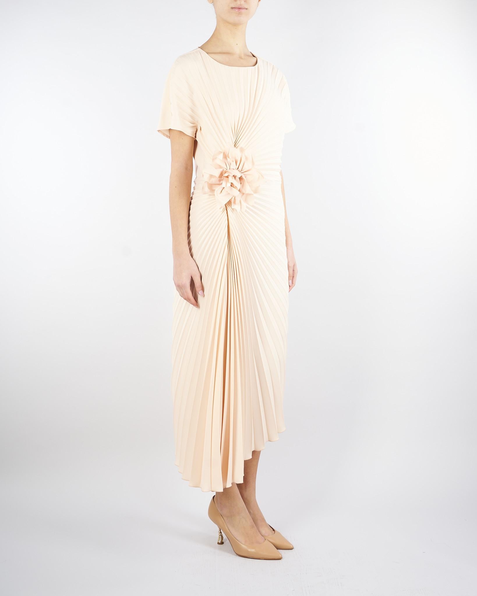 Abito in plissè di Clips. Modello longuette con girocollo e maniche corte. Fondo asimmetrico. Dettaglio fiore ricamato laterale.