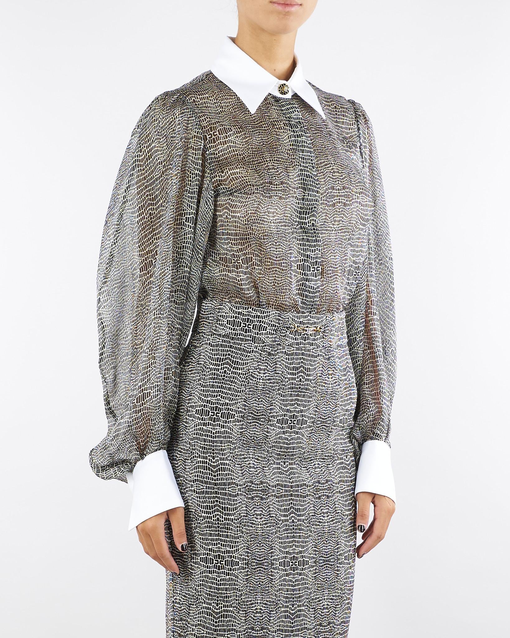 Body in voile dalla vestibilità slim. Si distingue per il colletto e i polsi ispirati al mondo della camiceria, con maniche ampie che regalano volumi inediti. Protagonista è la stampa con fantasia pitone che dona movimento.
