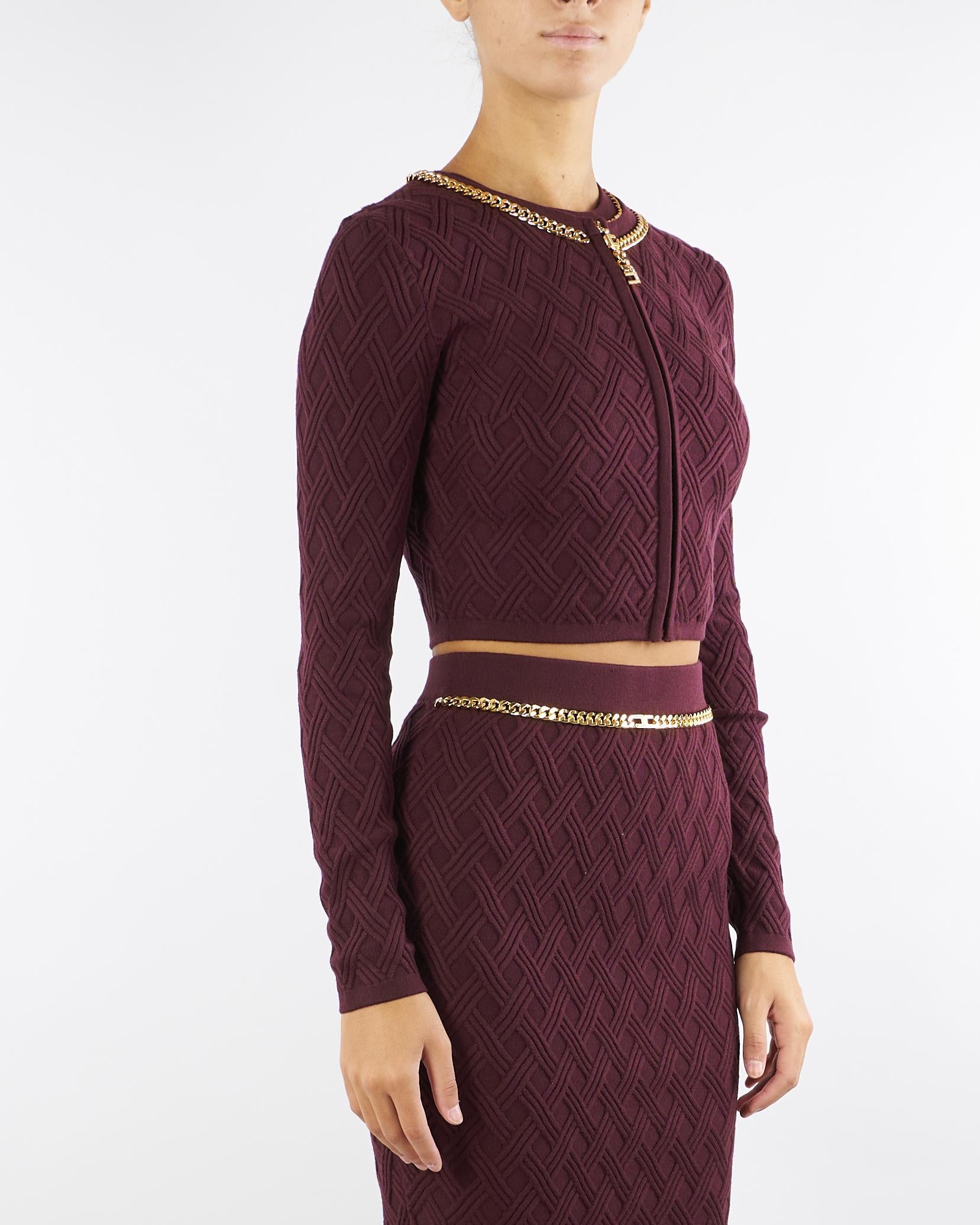 Cardigan in maglia dalla vestibilità aderente. Con girocollo e maniche lunghe, si distingue per l'elaborata lavorazione 3D che crea un disegno geometrico a rombi su tutta la lunghezza. Impreziosito dalla catena con taglio diamantato, ha scollo con zip e tirazip gioiello con logo.