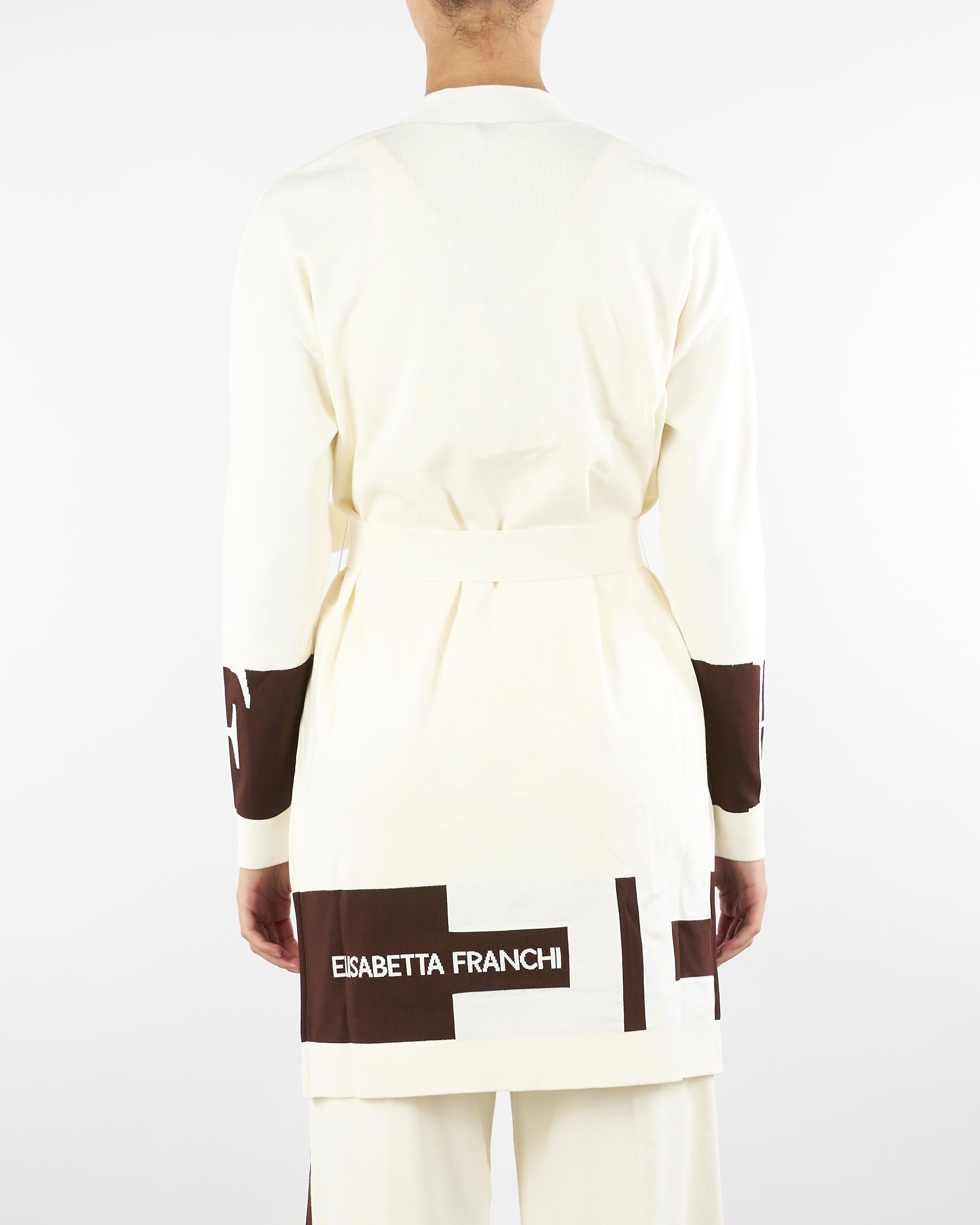 Cardigan a vestaglia in viscosa dalla vestibilità regular. Dalla linea avvolgente, si distingue per i loghi intarsiati in viscosa lucida sulle maniche, sul retro e alle estremità della cintura, a creare dei decisi effetti color-block. Tasche applicate.