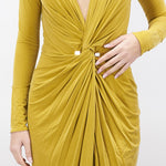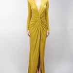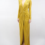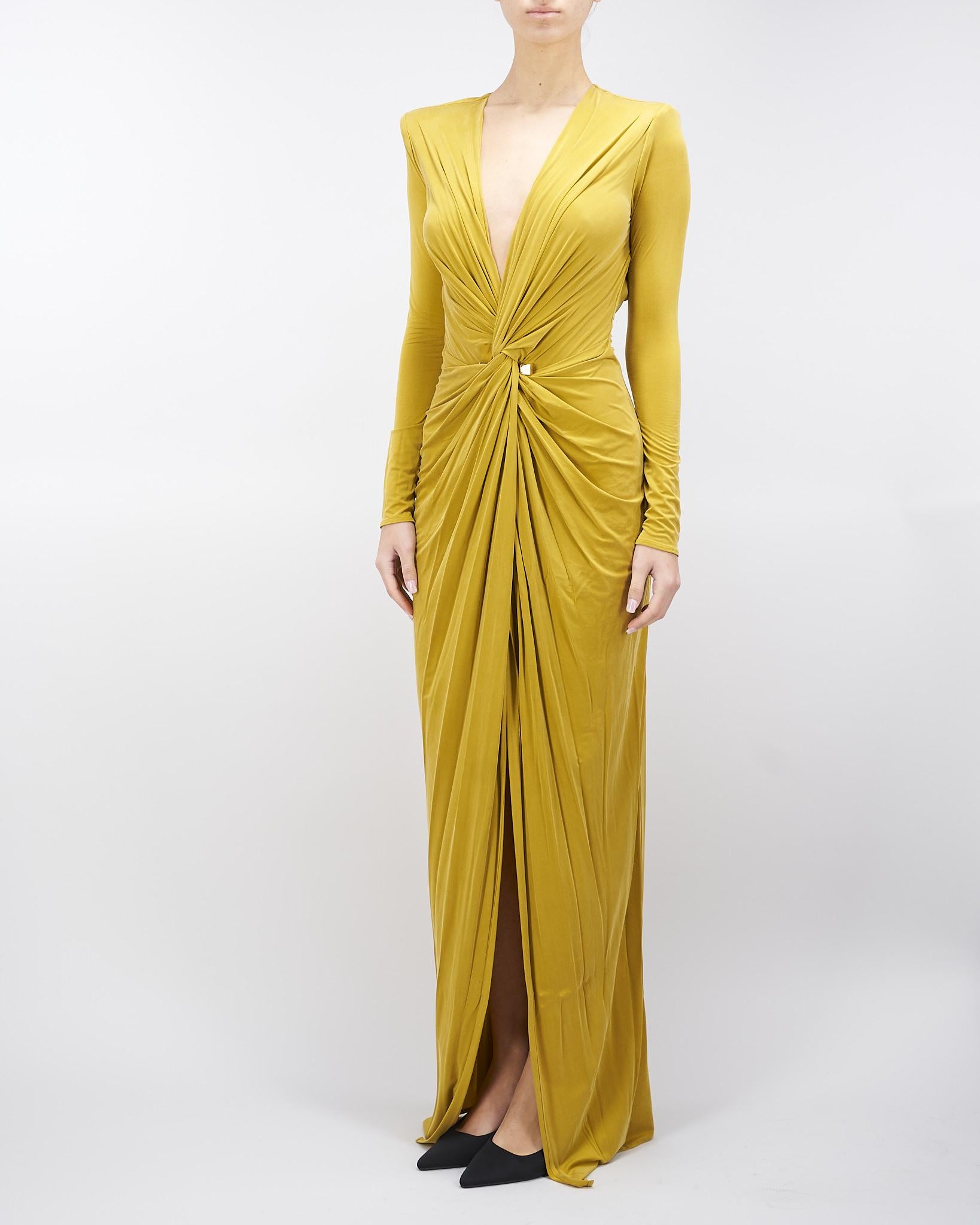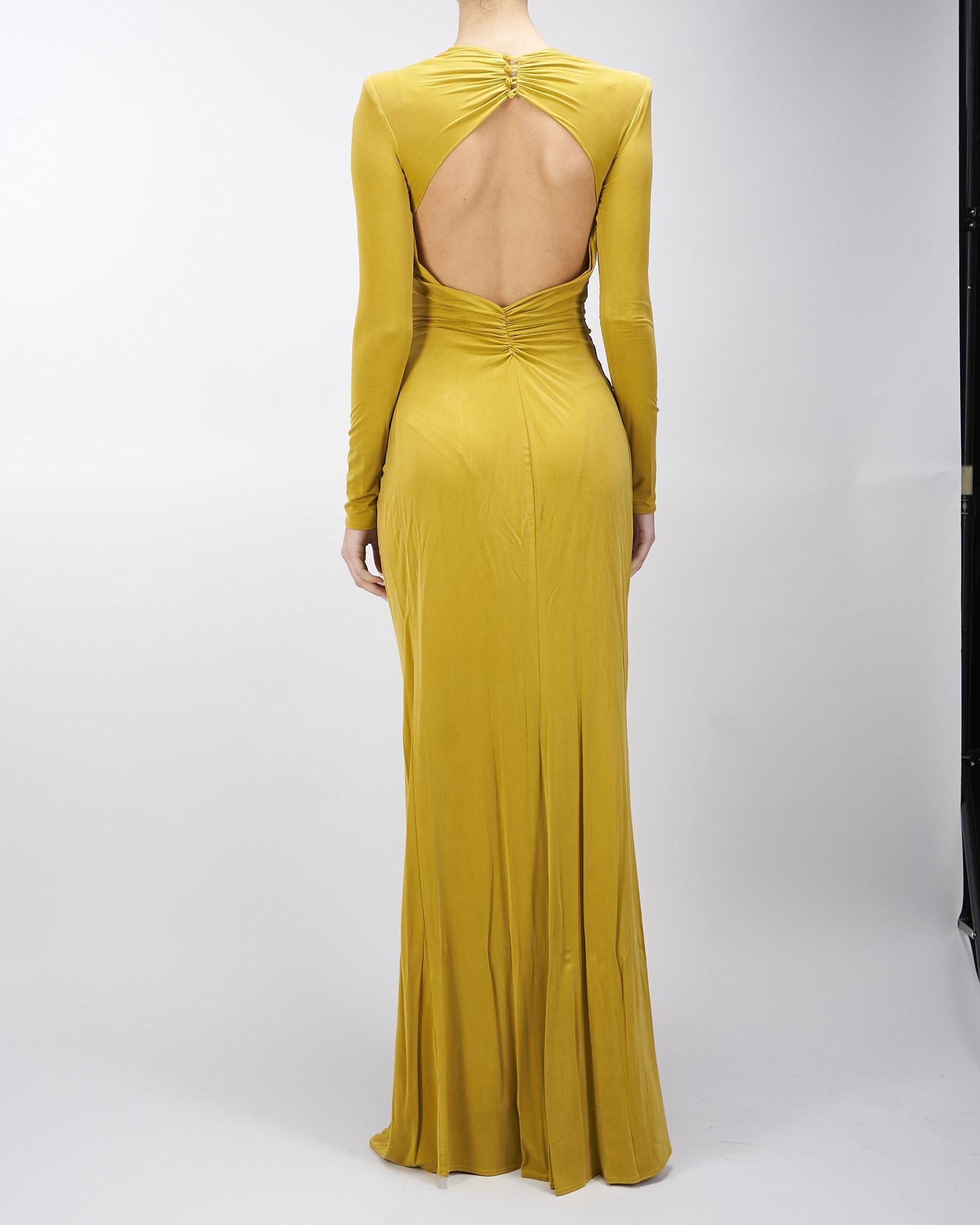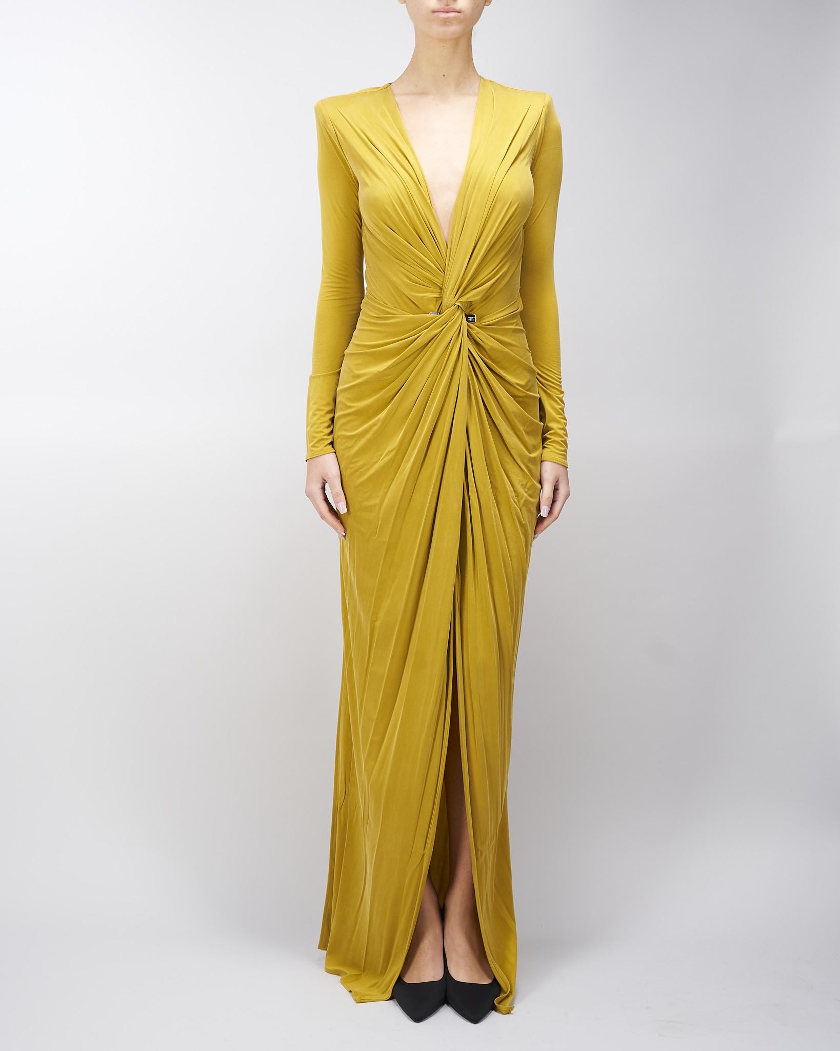 Abito da sera lungo in jersey cupro. Il vestito ha maniche lunghe e si distingue per l'esteso drappeggio con nodo sul davanti, da impreziosire con la decorazione gioiello amovibile in metallo dorato. Sorprende il retro con goccia centrale che lascia la schiena scoperta e rivela dettagliate arricciature.
