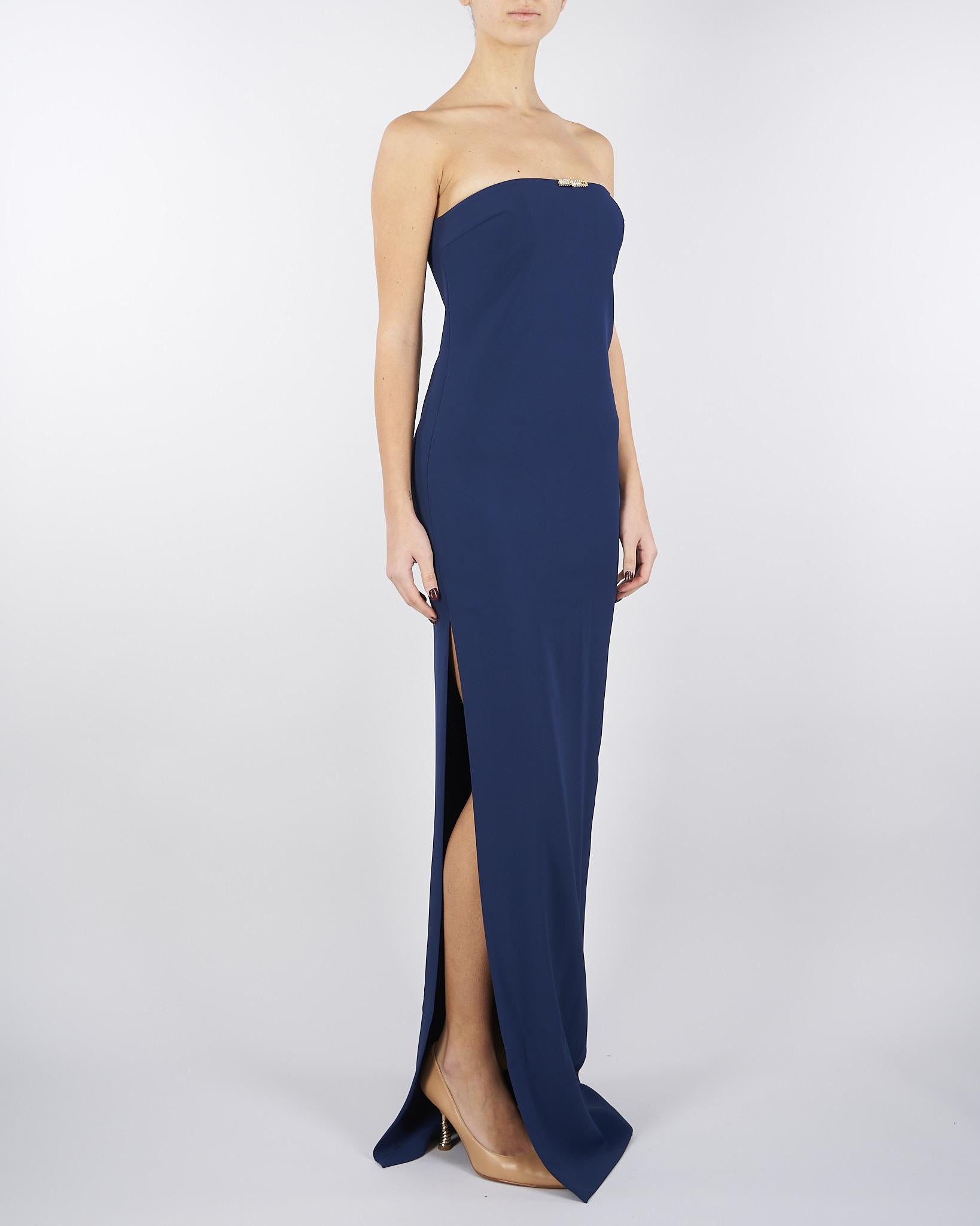 Abito da sera in doppio crêpe leggero. Il vestito ha spalle scoperte e si distingue per la costruzione essenziale, impreziosita dall'applicazione in strass sul top. La gonna ha spacco laterale, perfetto per slanciare la silhouette. Vestibilità slim.