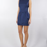 Abito smanicato in duchesse con scollo a barca, l'abito è caratterizzato da una costruzione di pinces che danno movimento sul fondo e dal dettaglio criss cross sul fianco.