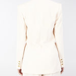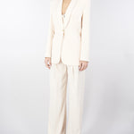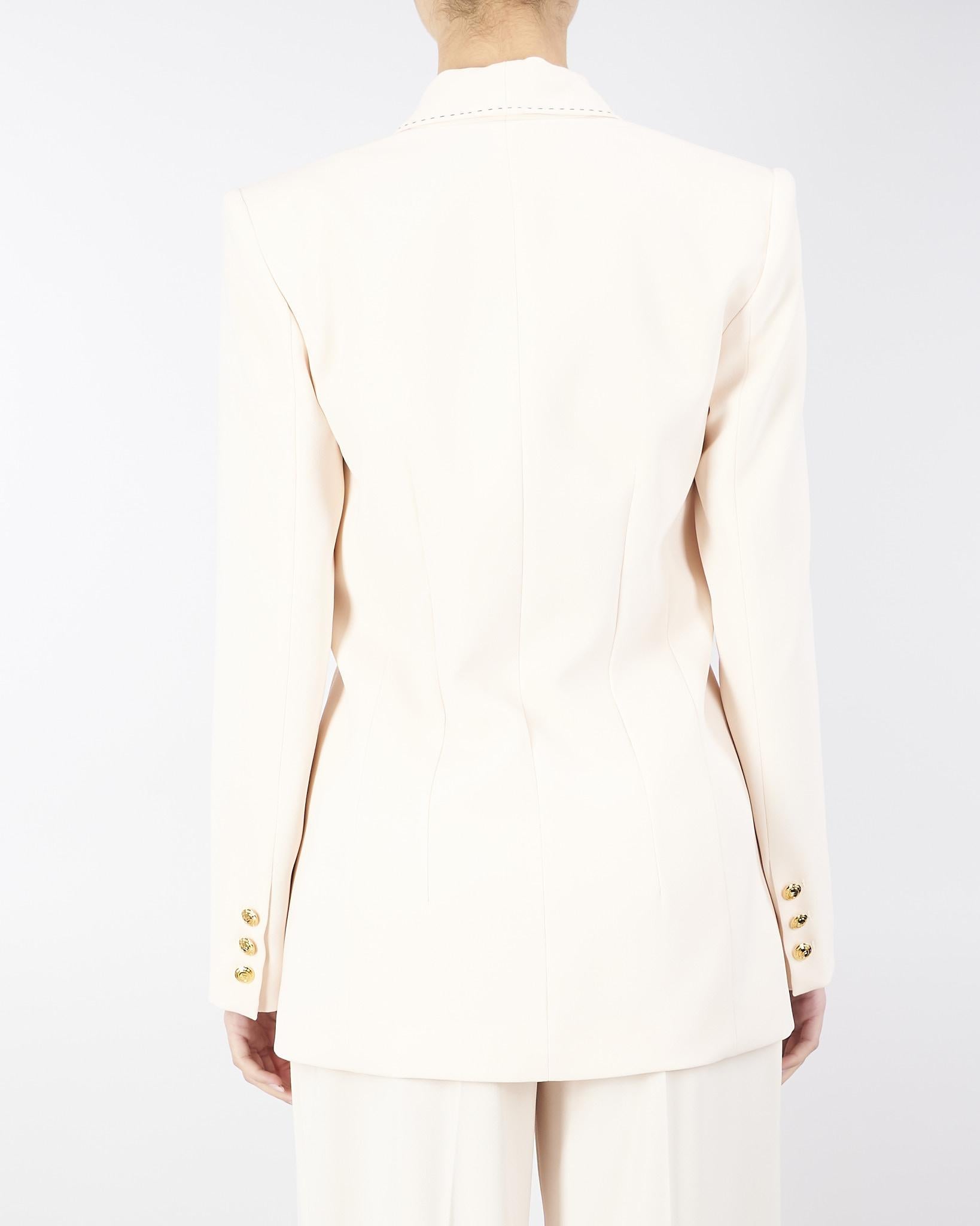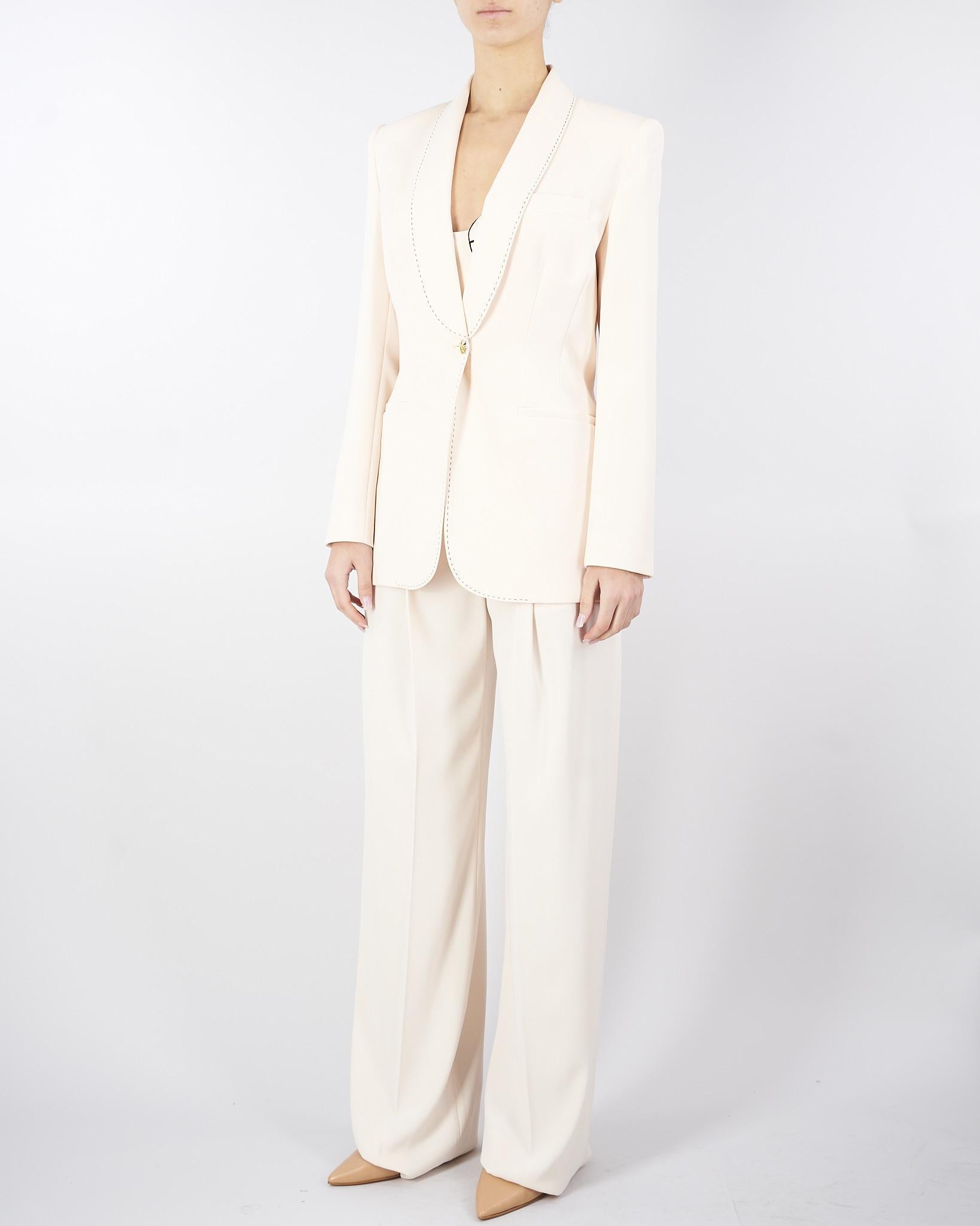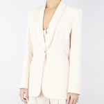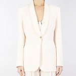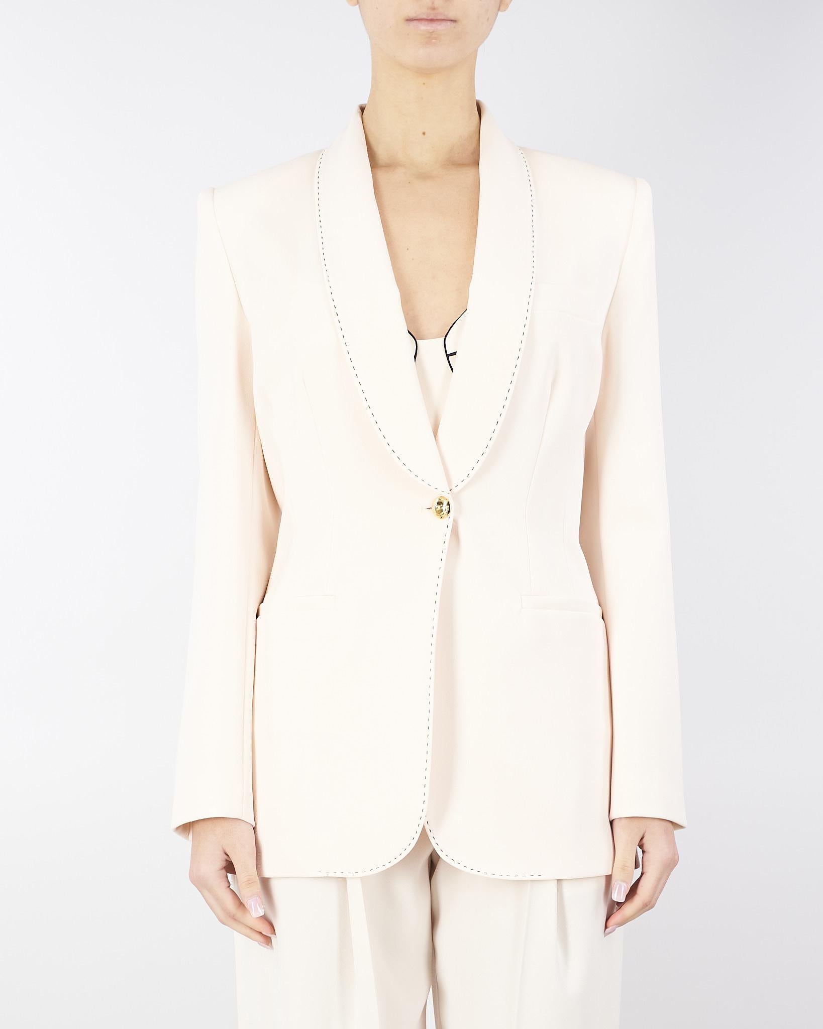 Giacca monopetto in crêpe leggero con vestibilità scivolata. Il blazer ha rever sciallato e impunture a contrasto che aggiungono definizione al capo. Chiusura con bottone in metallo dorato con logo.