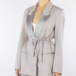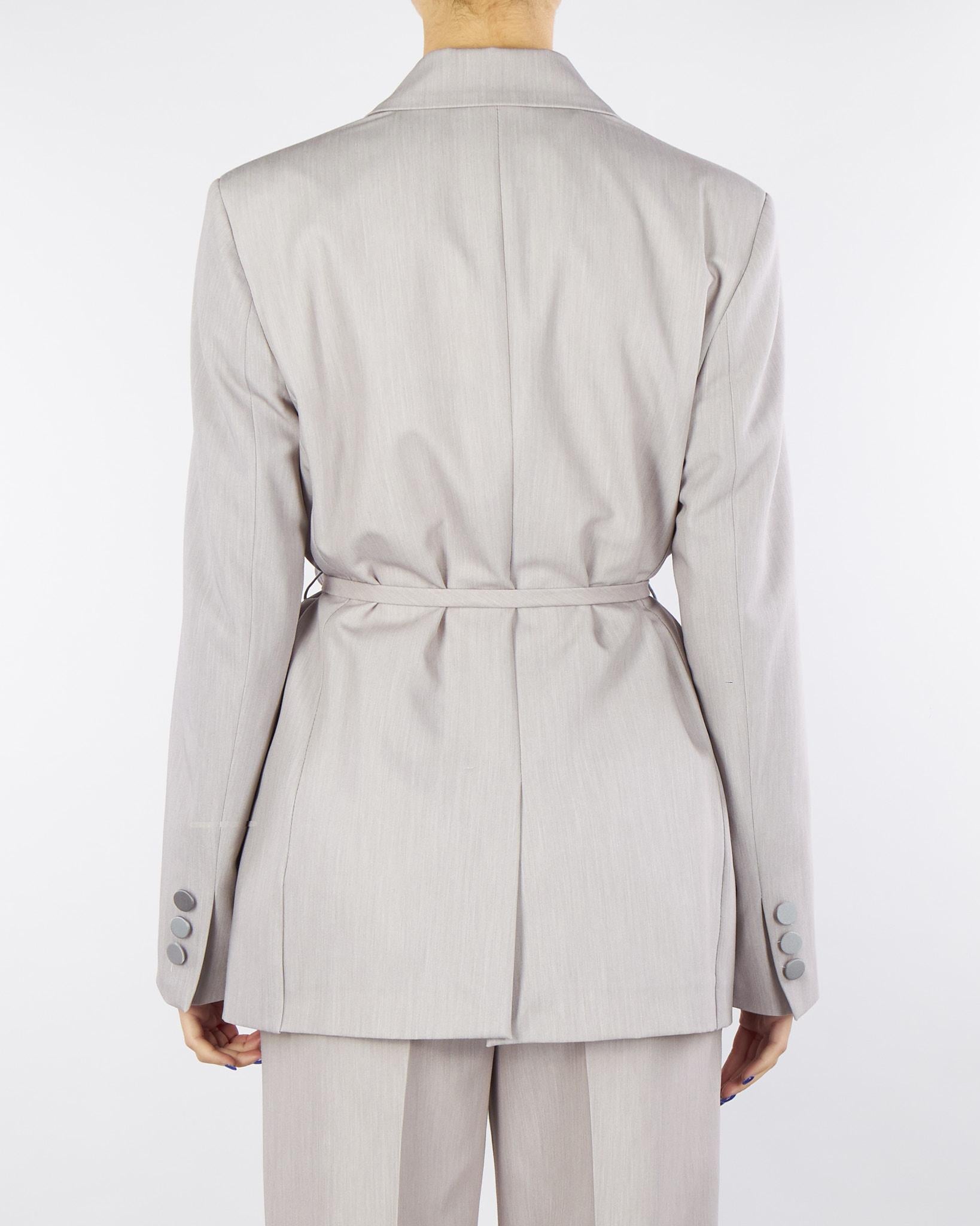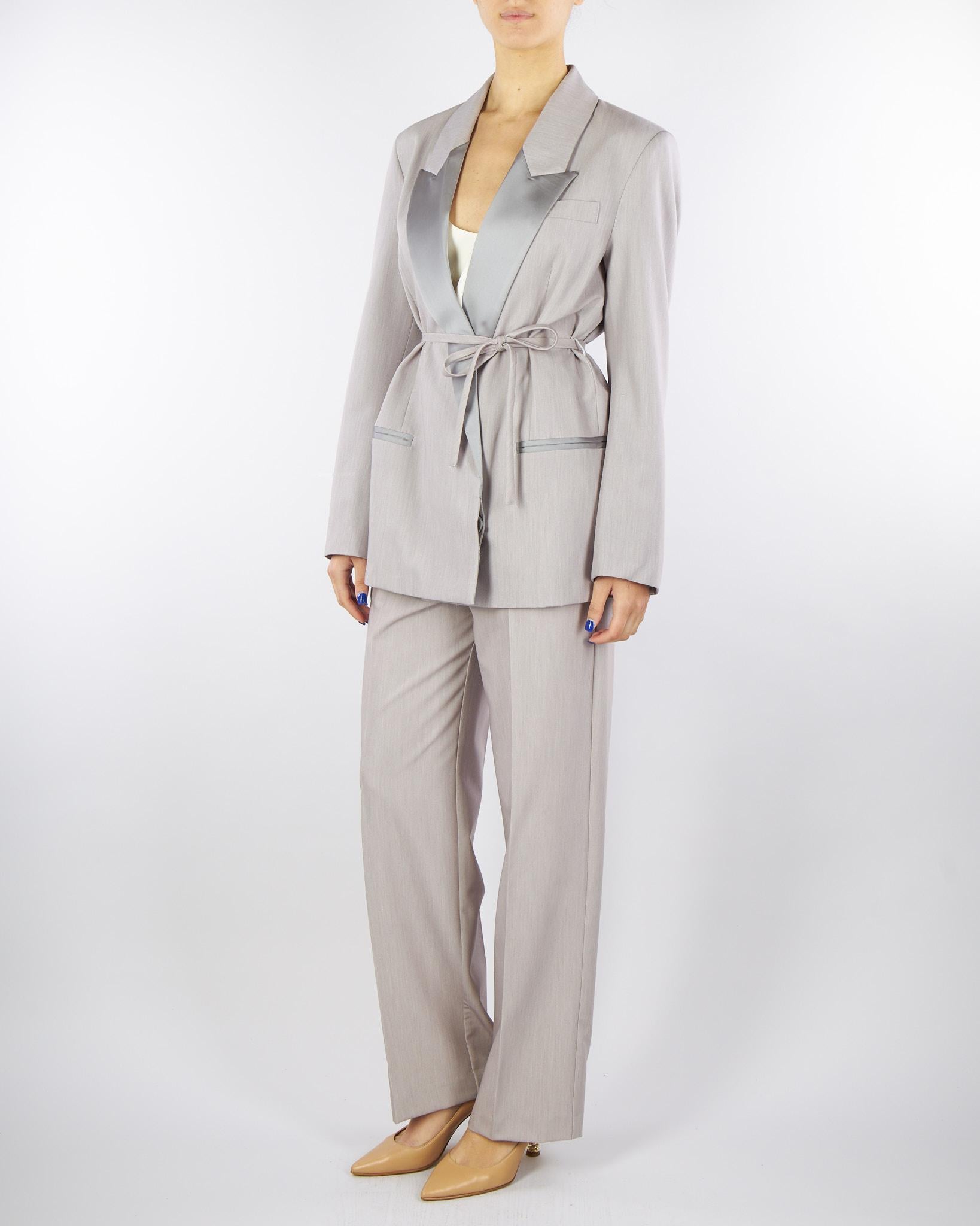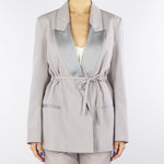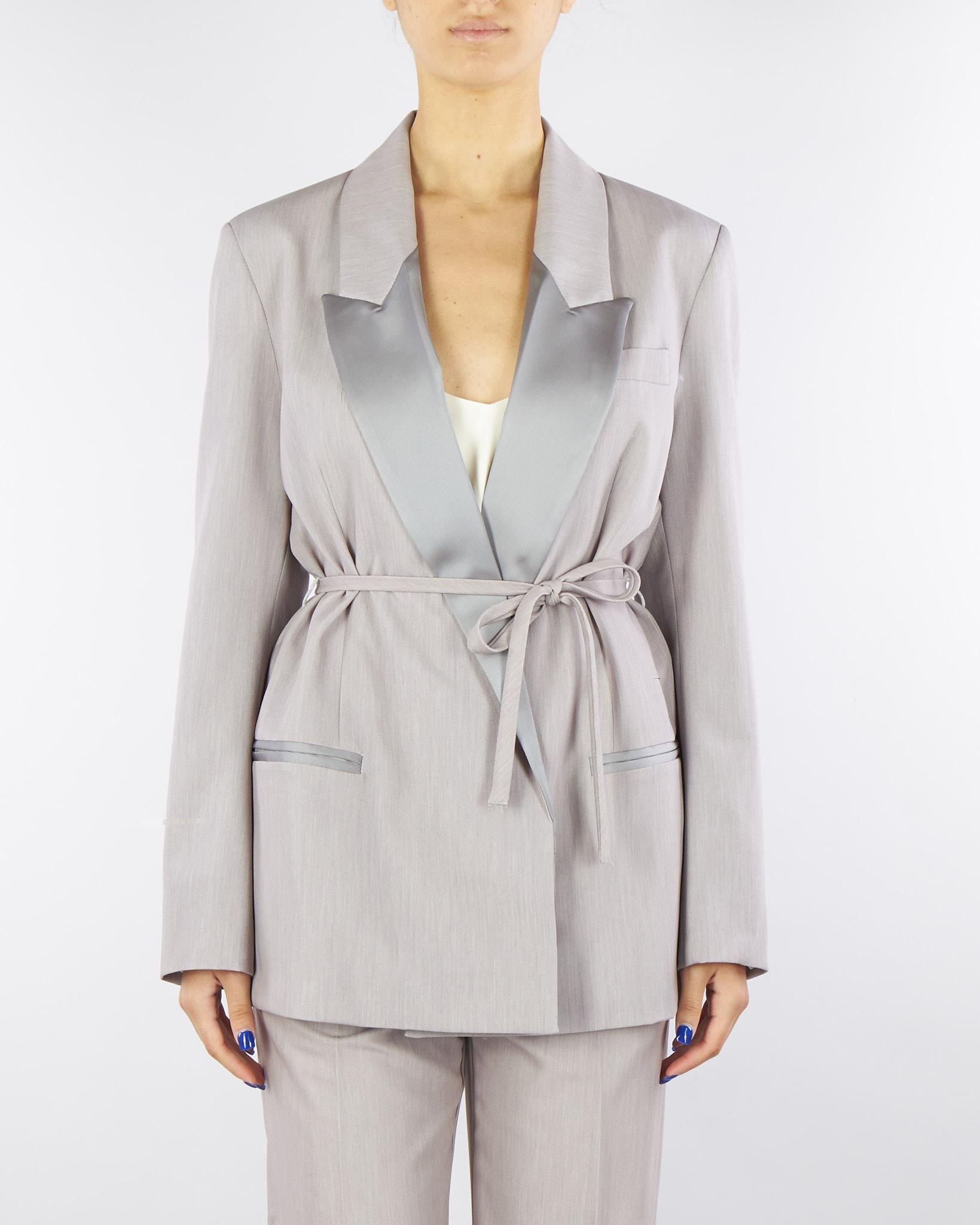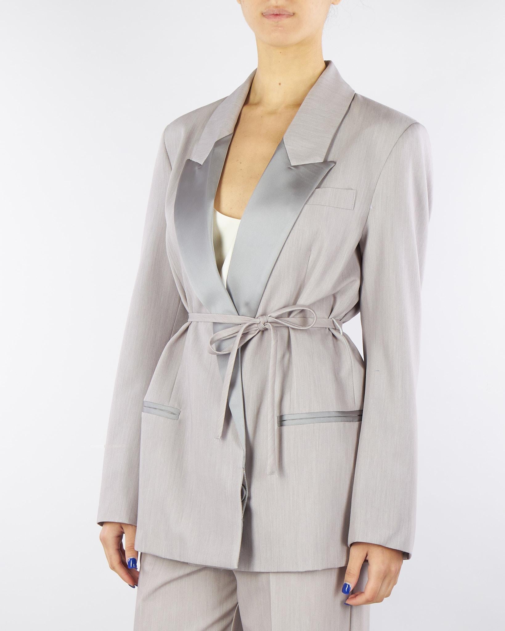 Giacca smocking di Vicolo. Modello doppiopetto con rever in raso, tasche a filo sul davanti. Chiusura centrale con cintura coordinata.