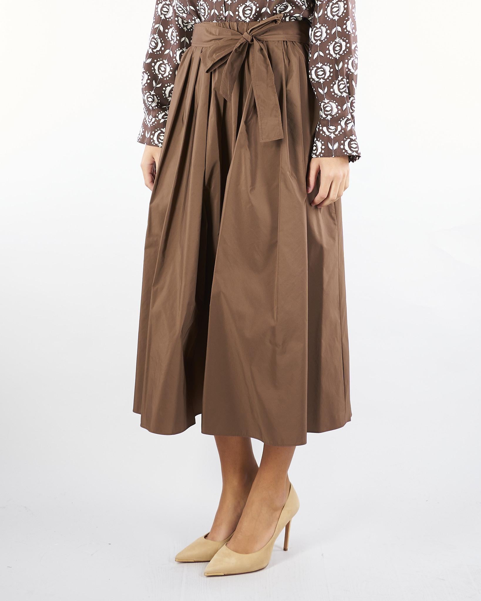 Gonna midi con pieghe inserite in vita che donano un volume ampio. Gonna in leggero taffetà di misto cotone. Linea svasata. Vita elasticizzata con passanti. Chiusura con zip laterale. Tasche inserite nei fianchi. Fusciacca abbinata da annodare in vita. Sfoderata.