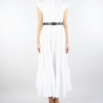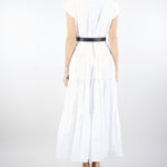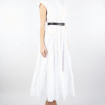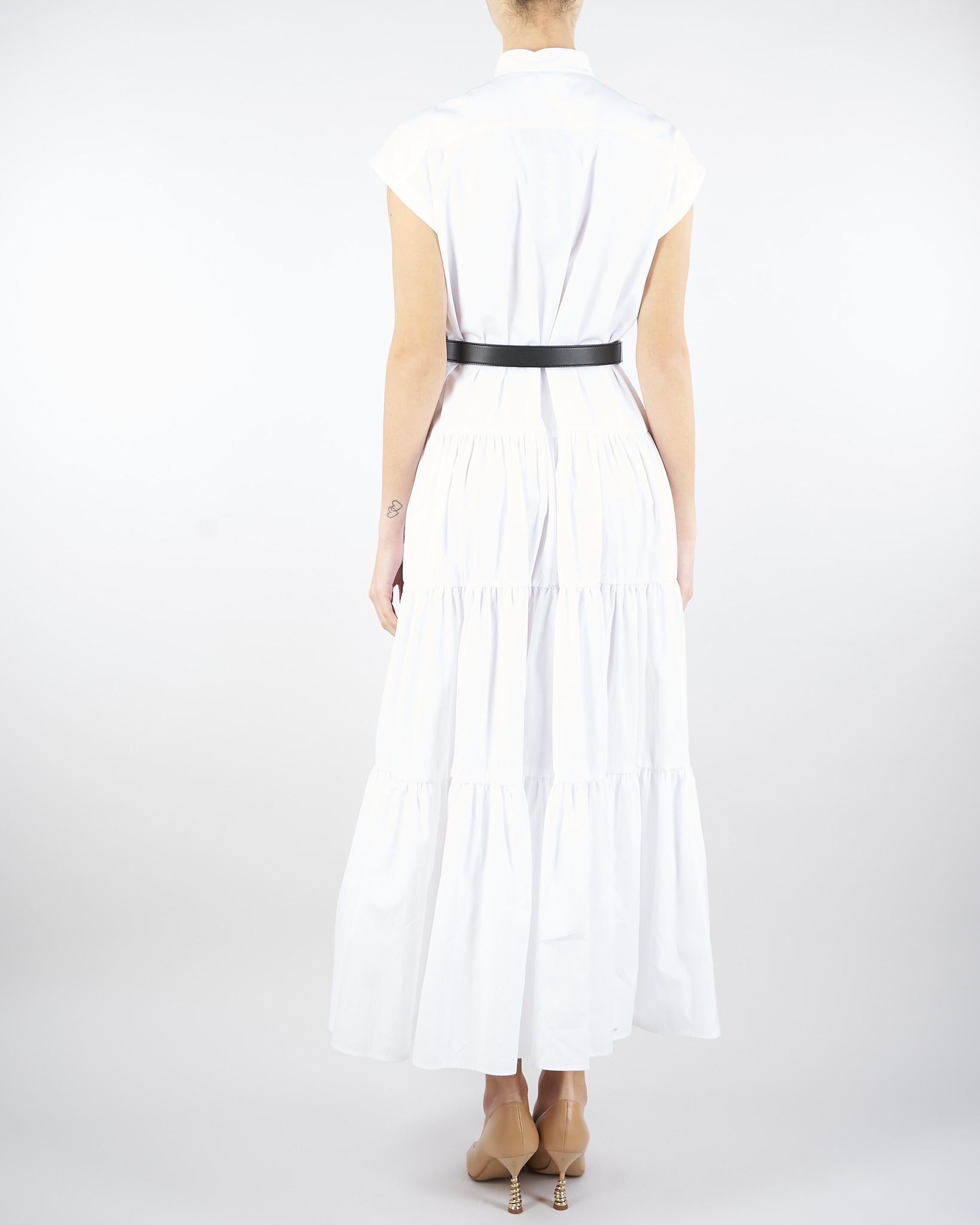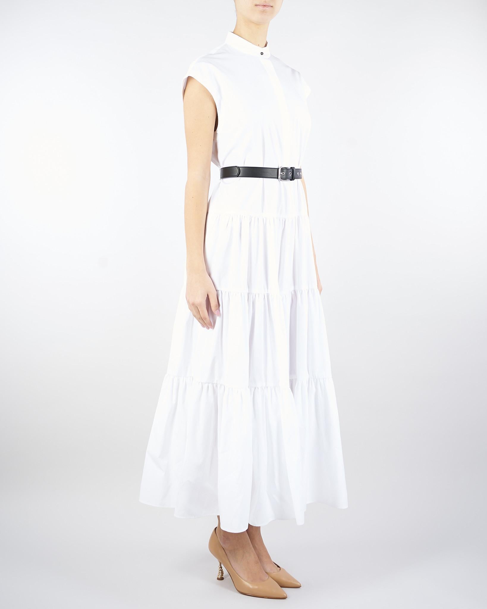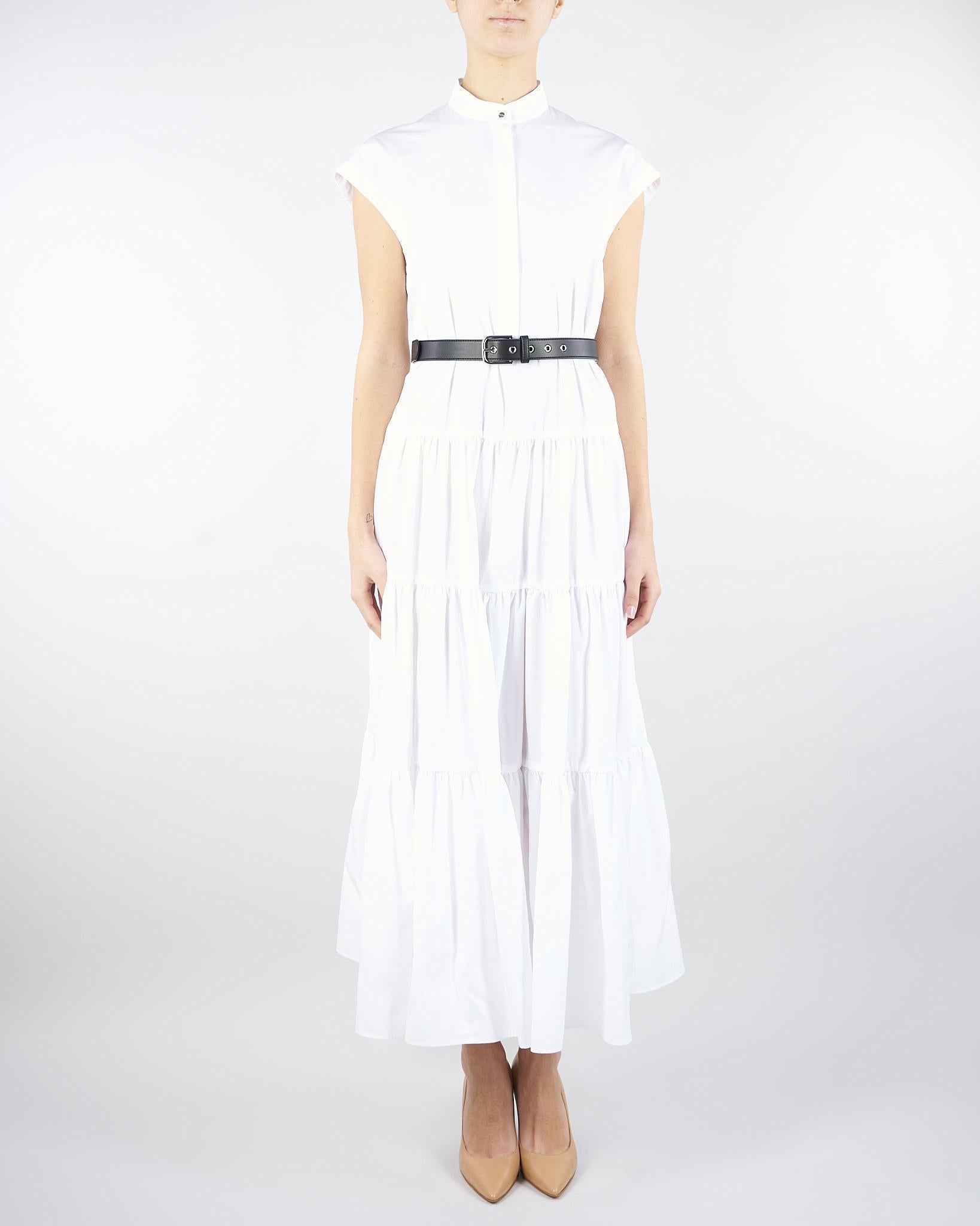 Abito smanicato lungo, realizzato in morbido popeline di puro cotone. Modello sfoderato d'ispirazione chemisier con colletto alla coreana, maniche ad aletta e tasche inserite nei fianchi. Le tre balze donano volume al capo, mente la cintura abbinata evidenzia il punto vita. Chiusura frontale nascosta.