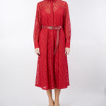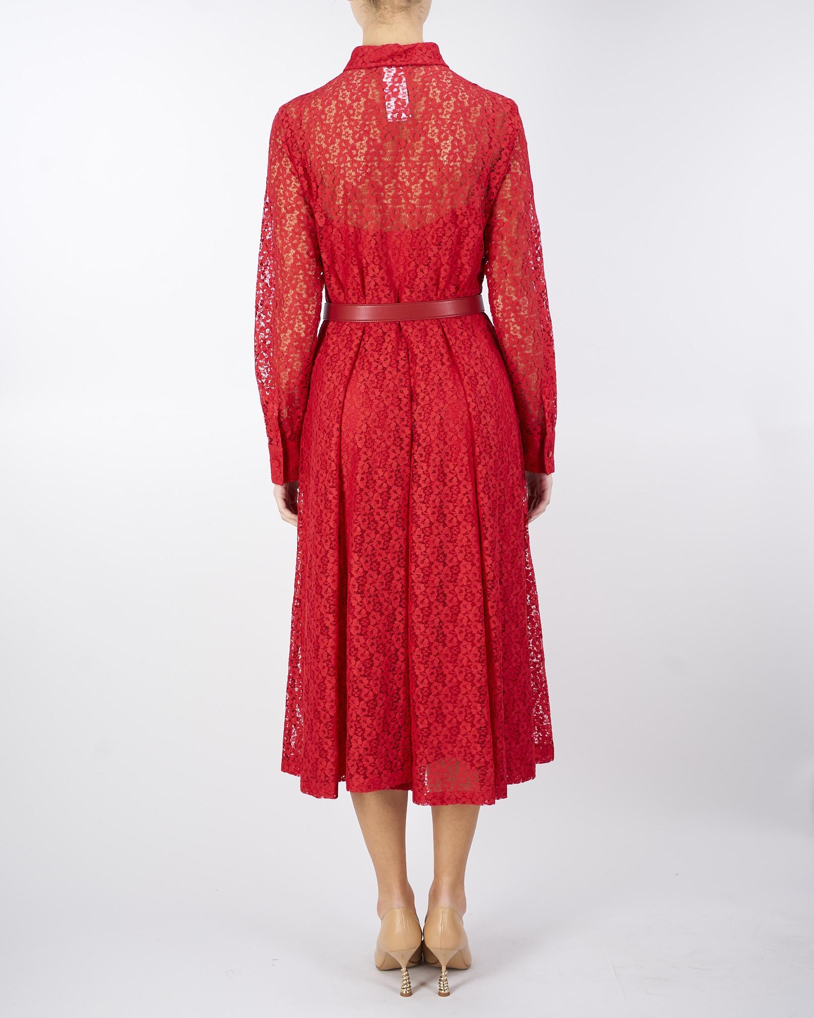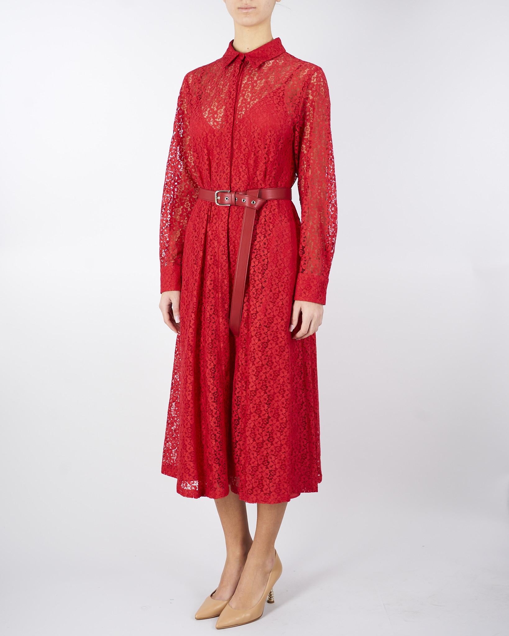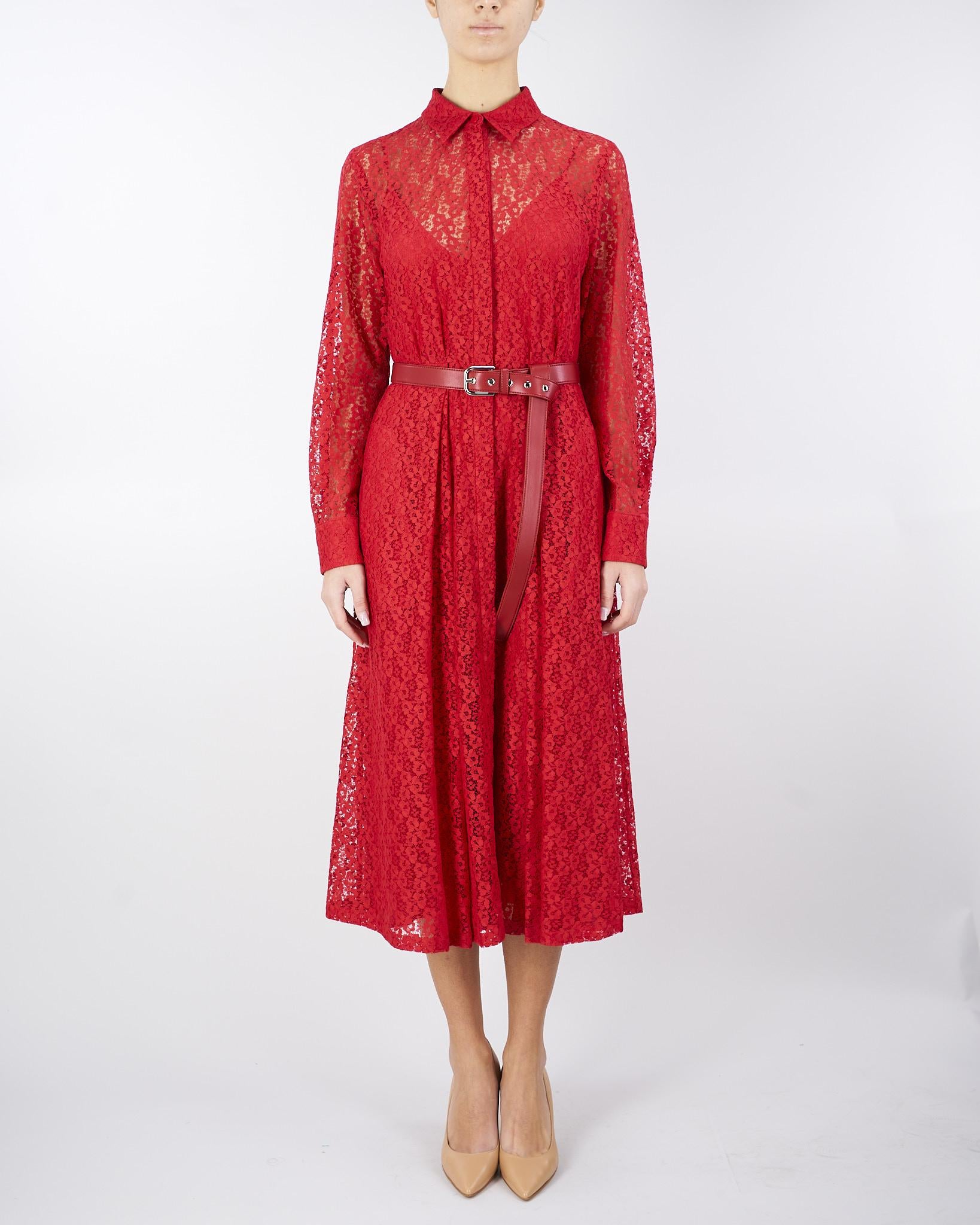 Abito chemisier lungo realizzato in prezioso pizzo dal disegno a fiori, caratterizzato da classico colletto a camicia e maniche lunghe con polsino e bottone. Modello A-line completato con cintura abbinata ad evidenziare la silhouette e sottoveste abbinata. Chiusura frontale con bottoni nascosti.