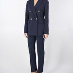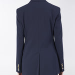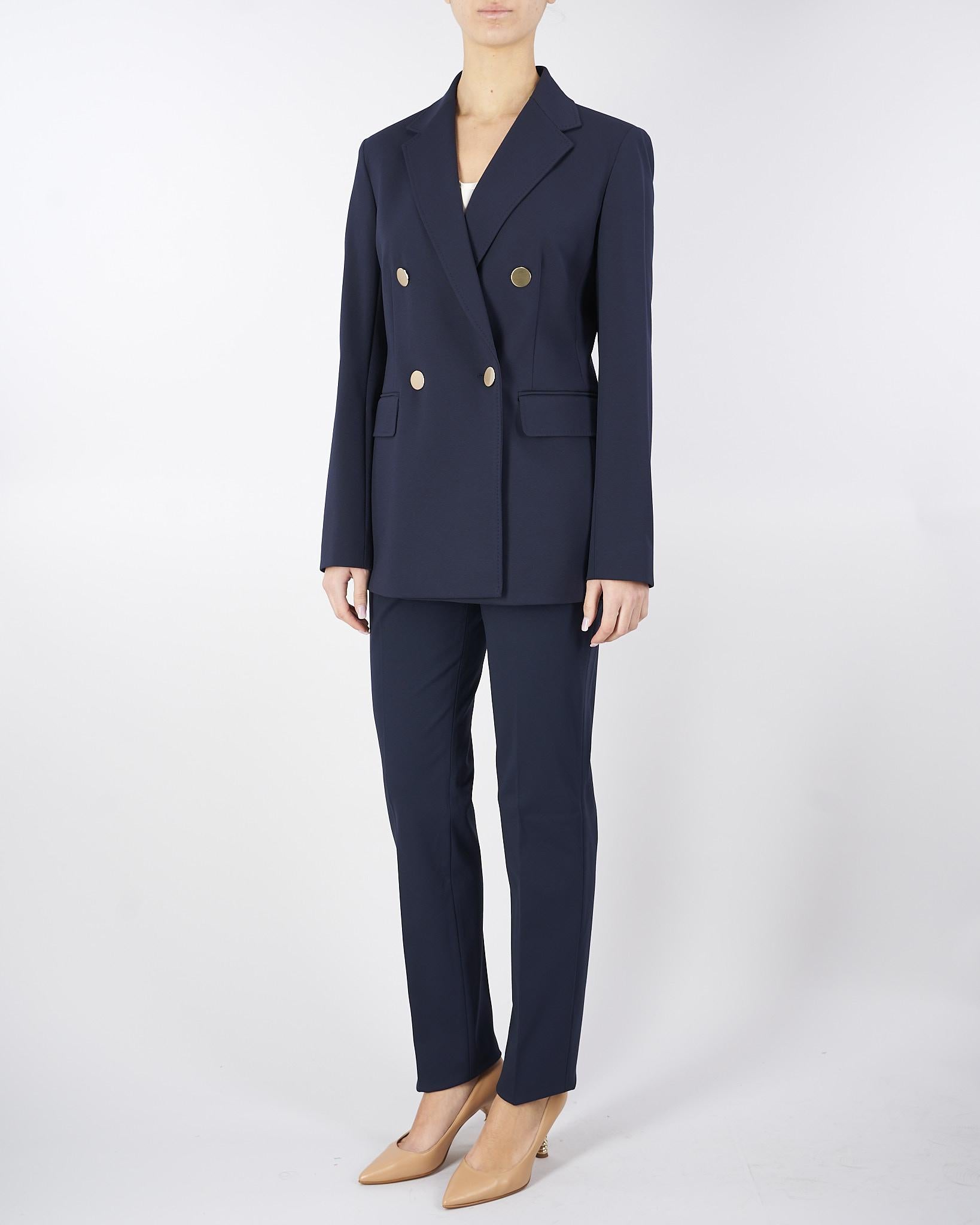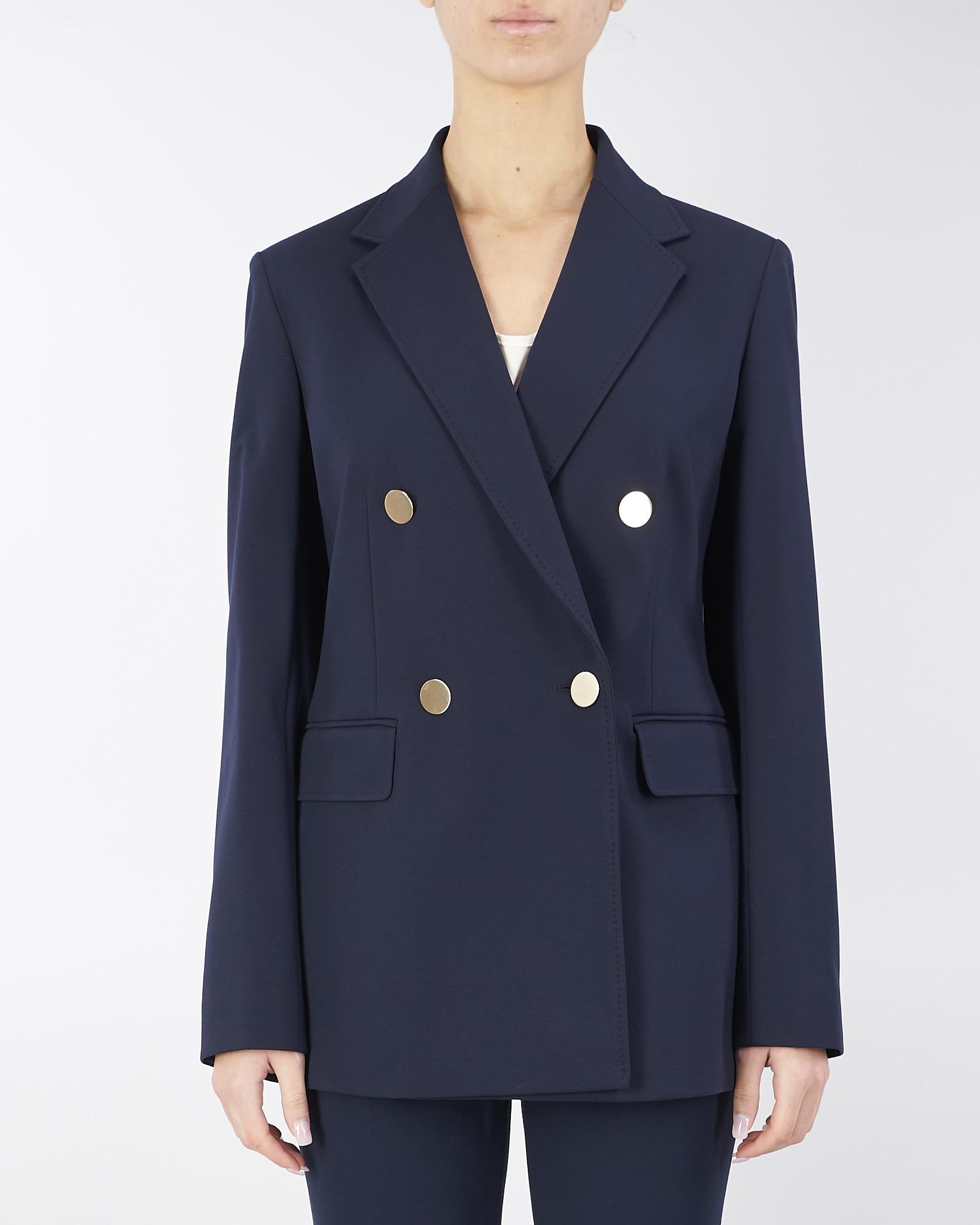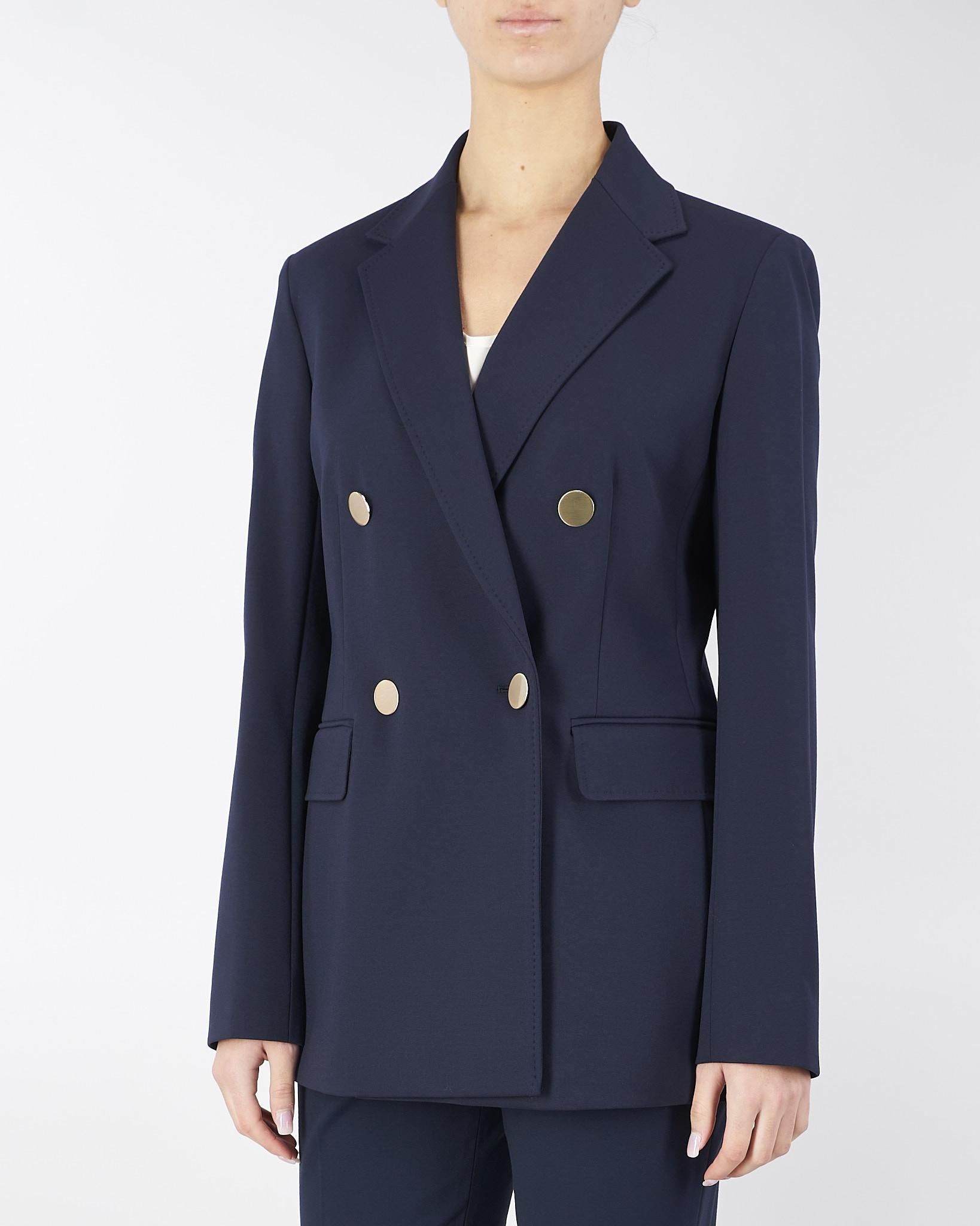 Blazer doppiopetto realizzato in morbido jersey di mista viscosa, lavorato a punto Milano. Il modello presenta collo a rever, maniche lunghe a giro e tasche a filetto con patta applicata sul davanti. Chiusura frontale con 4 bottoni.