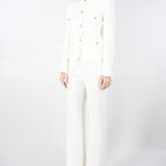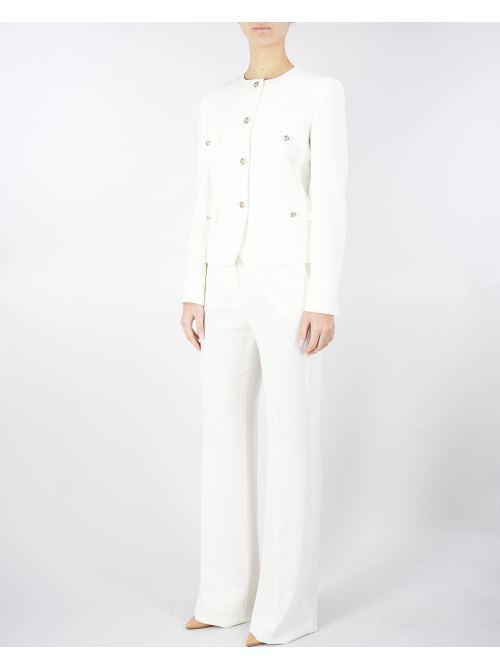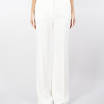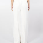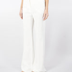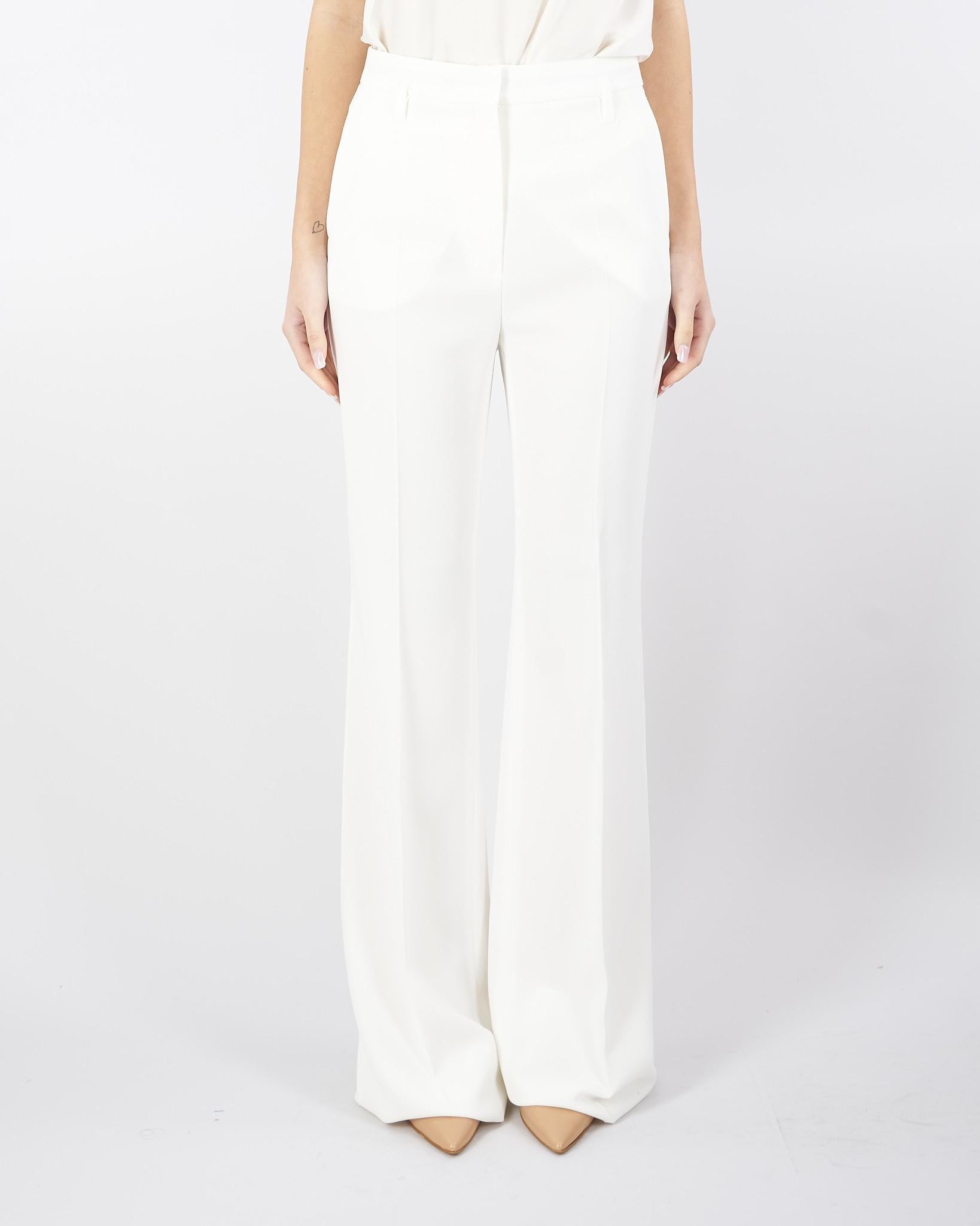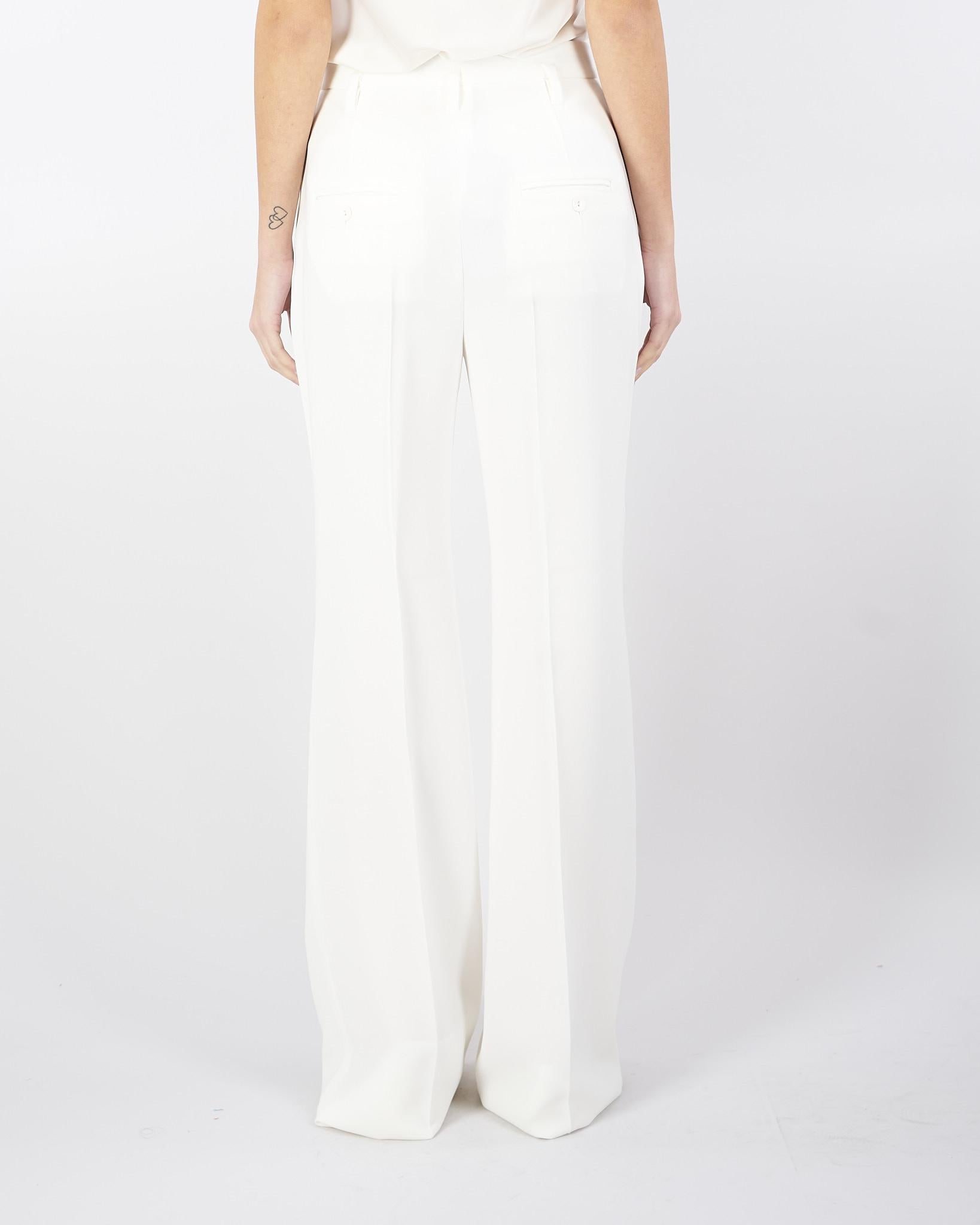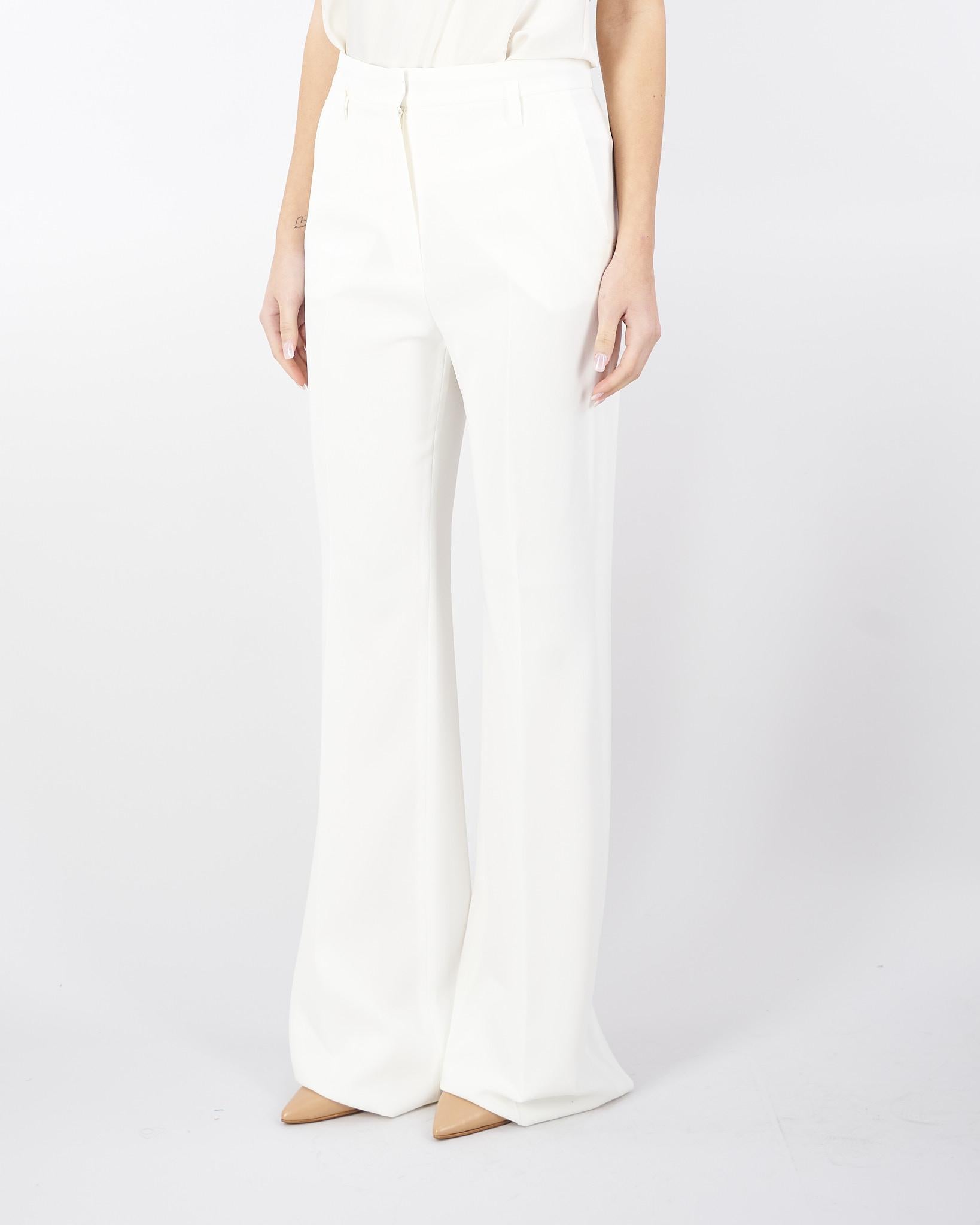 Pantalone a palazzo realizzato in cady. Modello dalla linea morbida con gamba dritta e piega stirata, tasche alla francese sui fianchi e tasche a filetto sul retro. Rifinito con passanti per cintura, si chiude con alto listino in vita, patta con zip e gancetto.