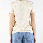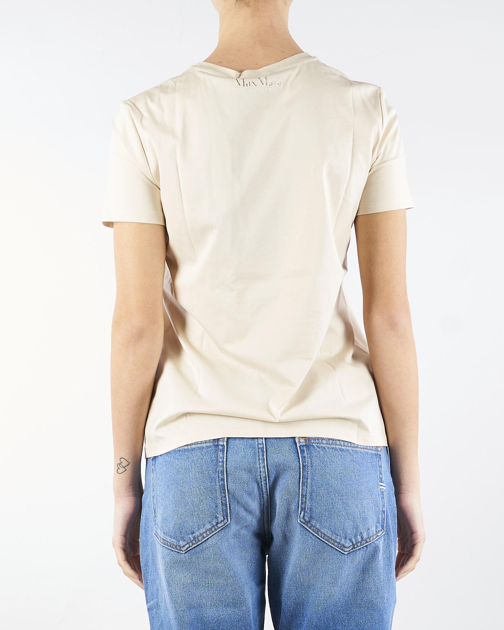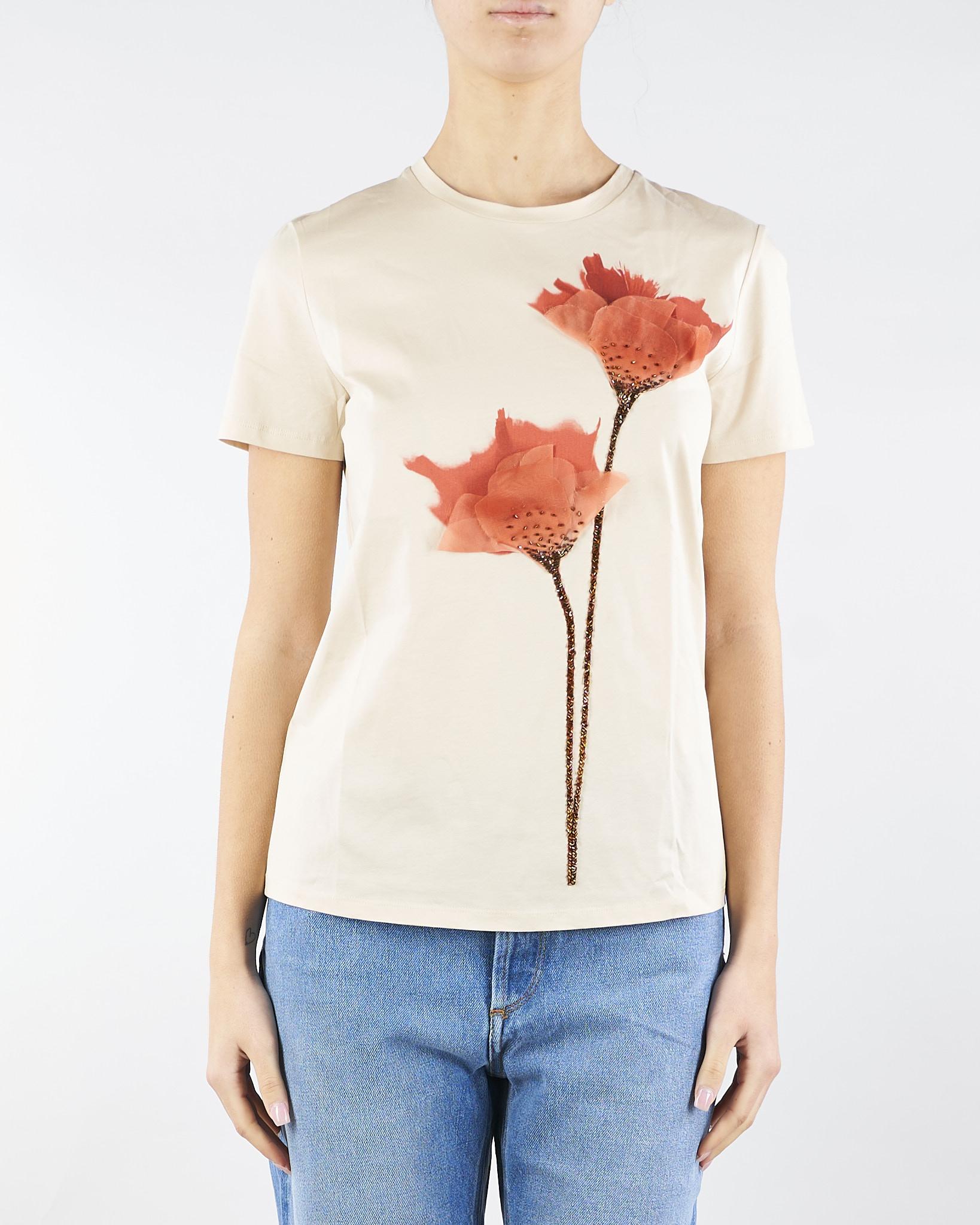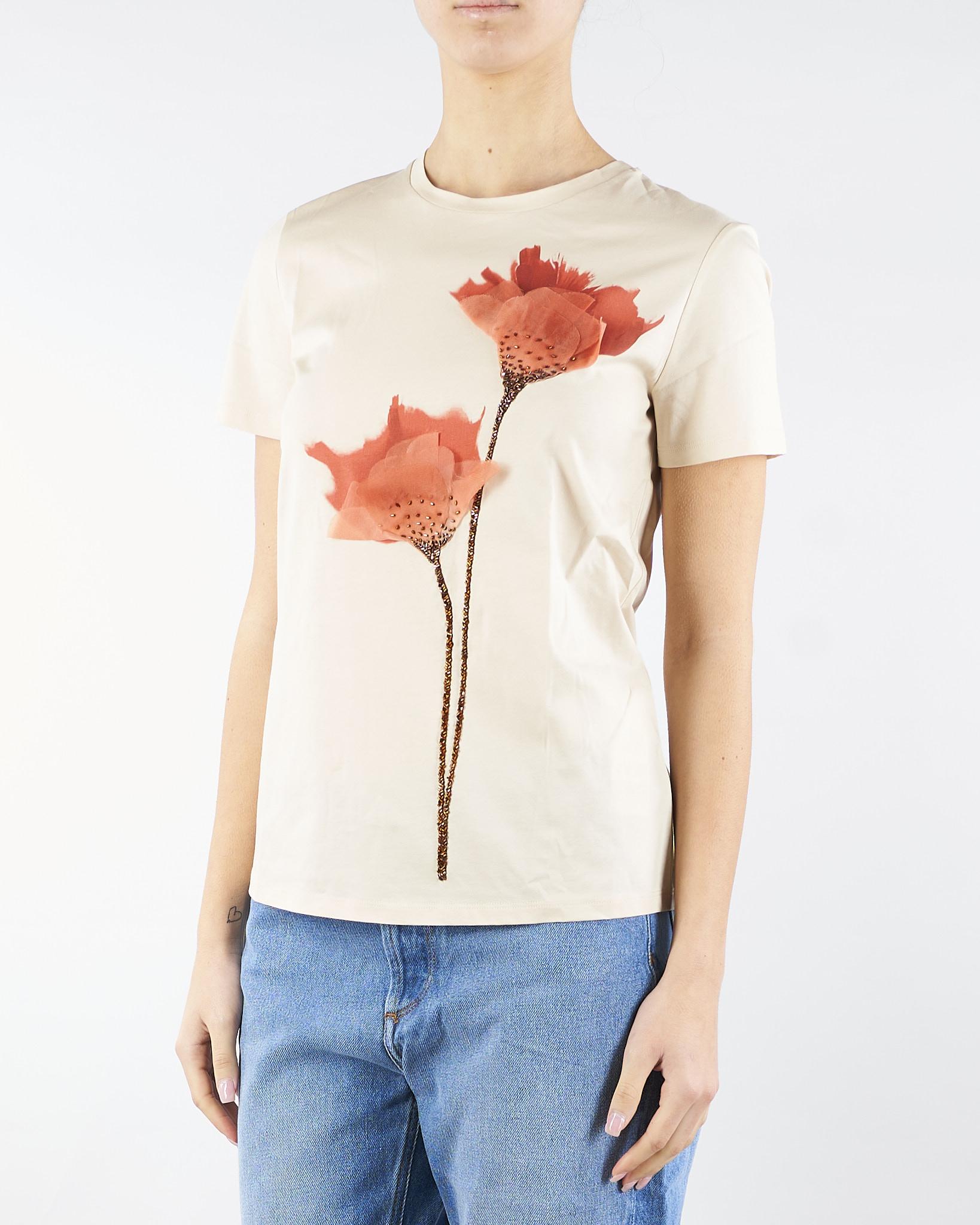T-shirt couture a maniche corte, realizzata in morbido jersey di puro cotone. La stampa floreale sul davanti è impreziosita da petali in leggerissima organza tinti a mano e un mix di perline e baguette applicate in tono. Rifinita con logo Max Mara Studio ricamato in strass sul retro del collo.
