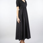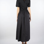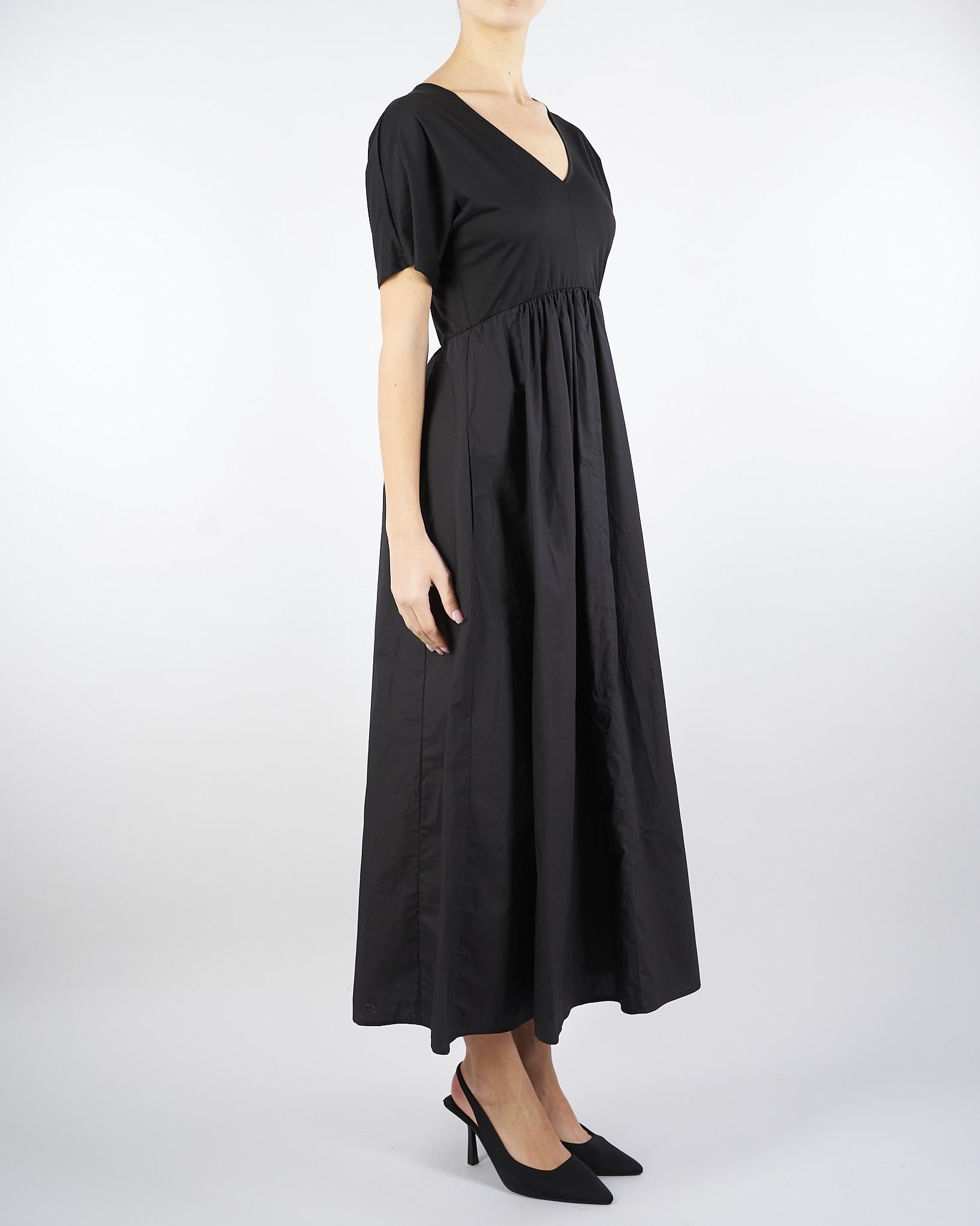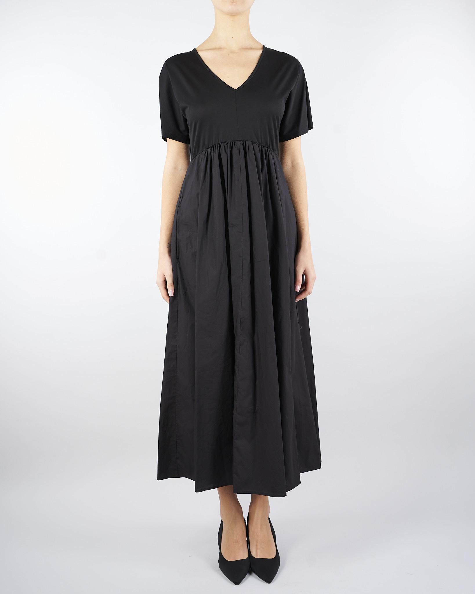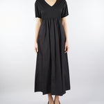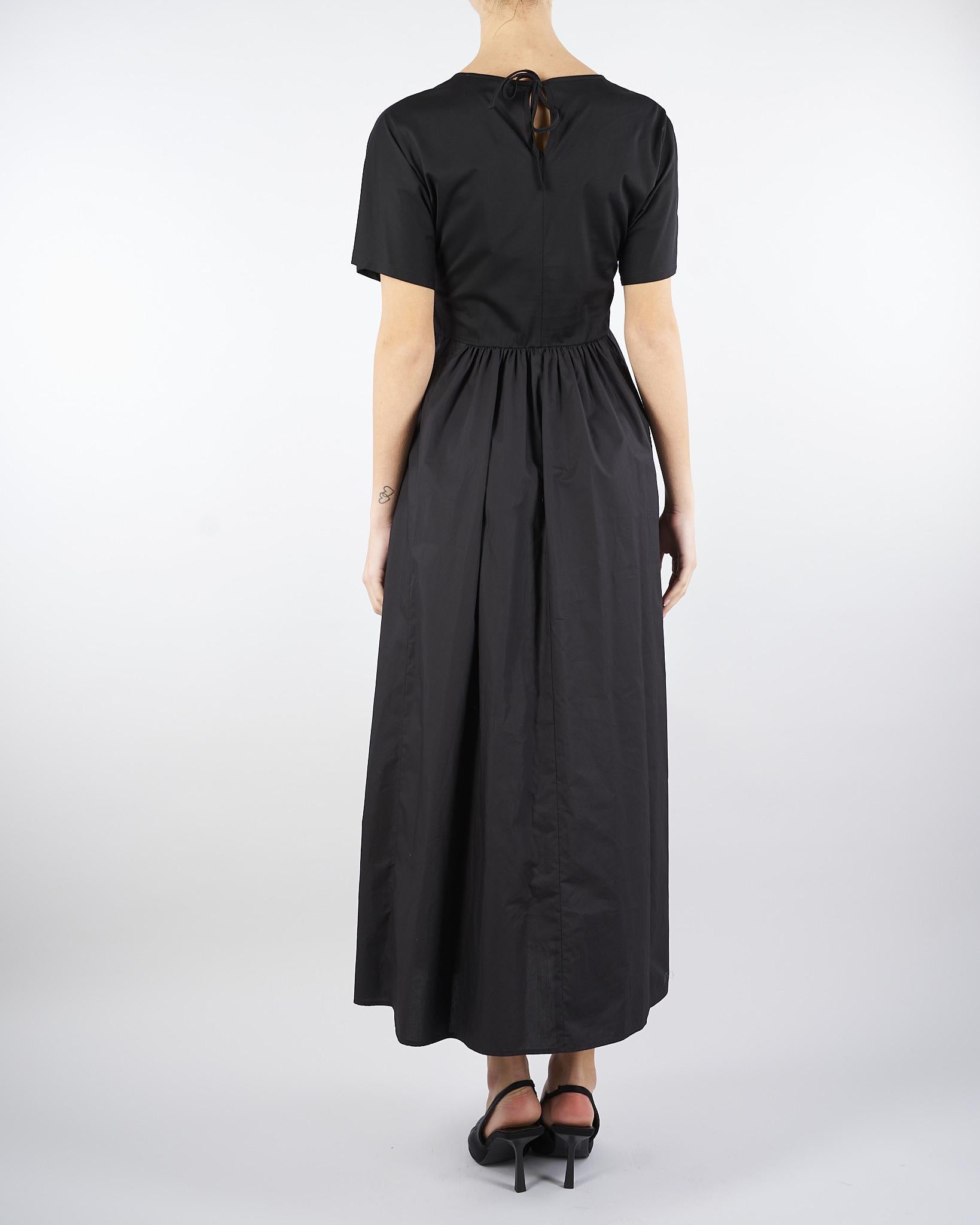 Abito lungo dal volume ampio, caratterizzato da top in jersey di cotone e gonna in popeline di cotone con tagli verticali decorativi e motivo arricciato in vita. Il modello presenta ampio scollo a V, maniche corte a kimono, tasche inserite nei fianchi e chiusura a goccia sul retro con laccetti.