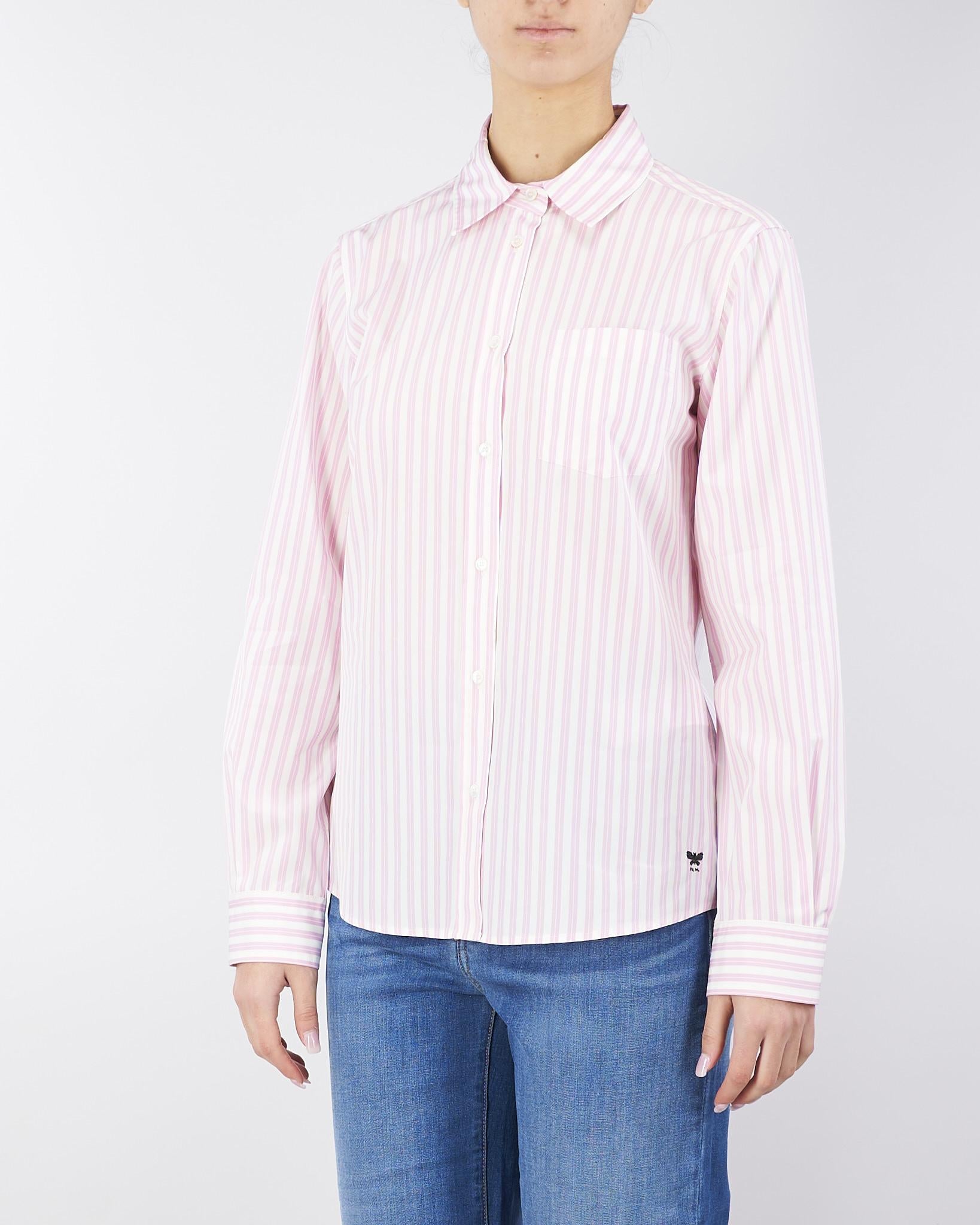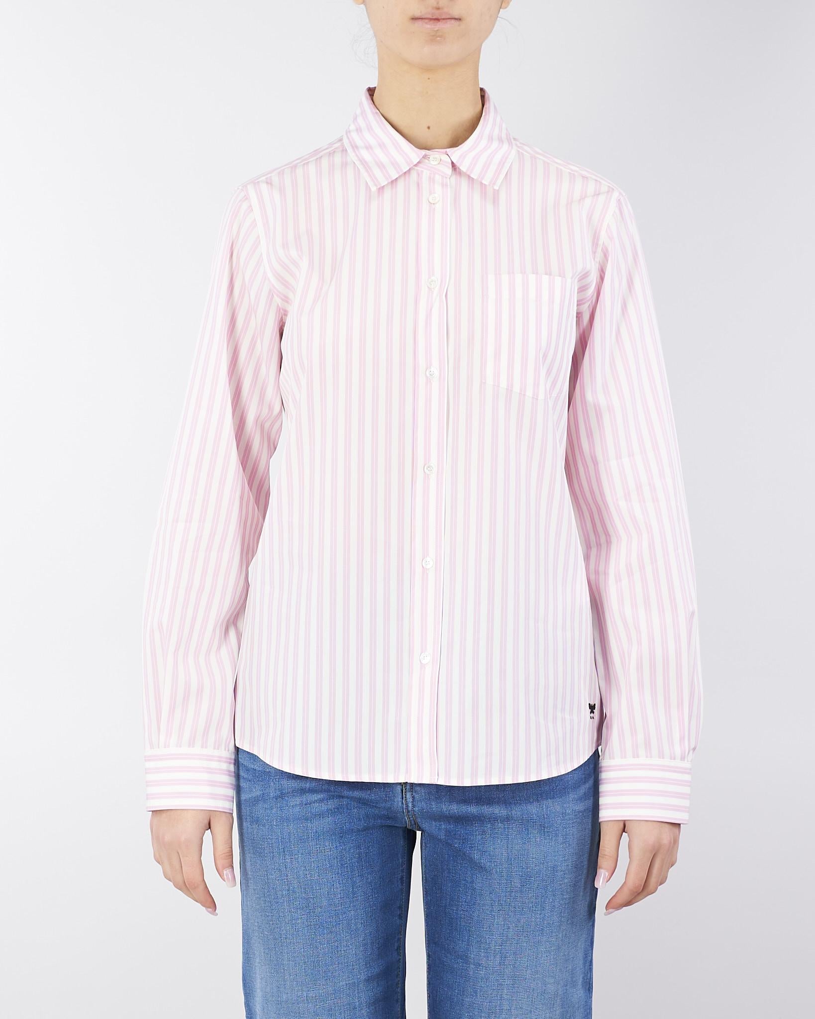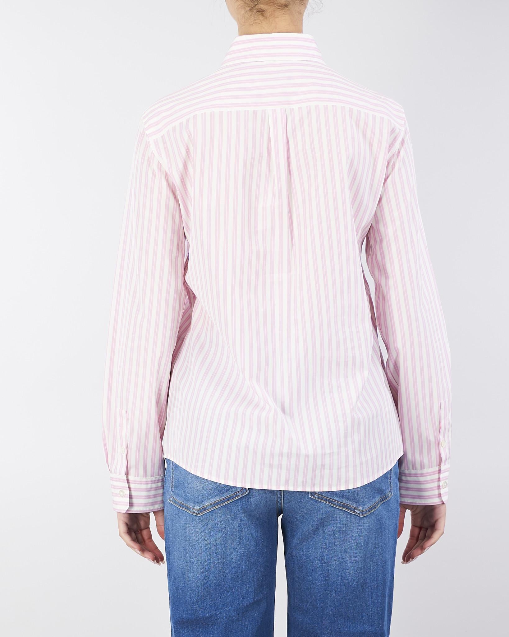 Camicia in popeline di puro cotone a righe, con logo ricamato sul davanti e taschino applicato sul petto. Modello dalla linea dritta, caratterizzato da colletto classico e maniche lunghe a giro con polsini e bottone. Rifinita con taglio carré sul retro e fondo arrotondato. Chiusura con bottoni a vista. Il tessuto principale di questo capo contiene almeno il 50% di fibra di cotone coltivata secondo i principi dell'agricoltura biologica.
