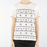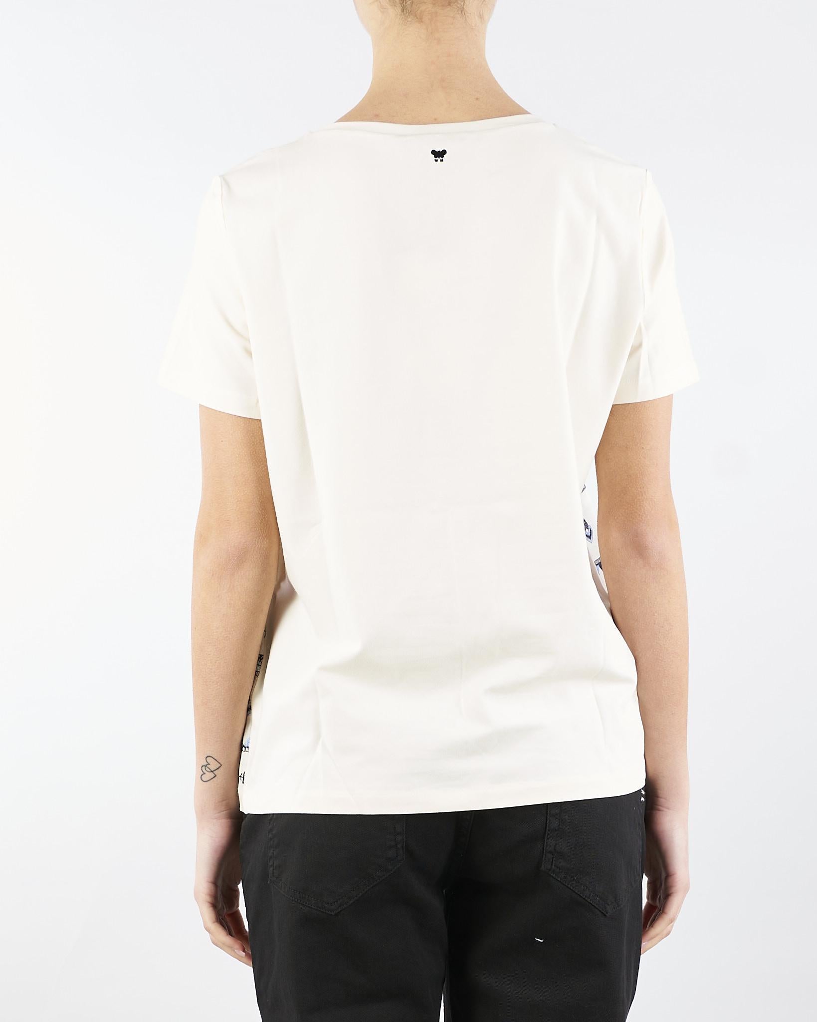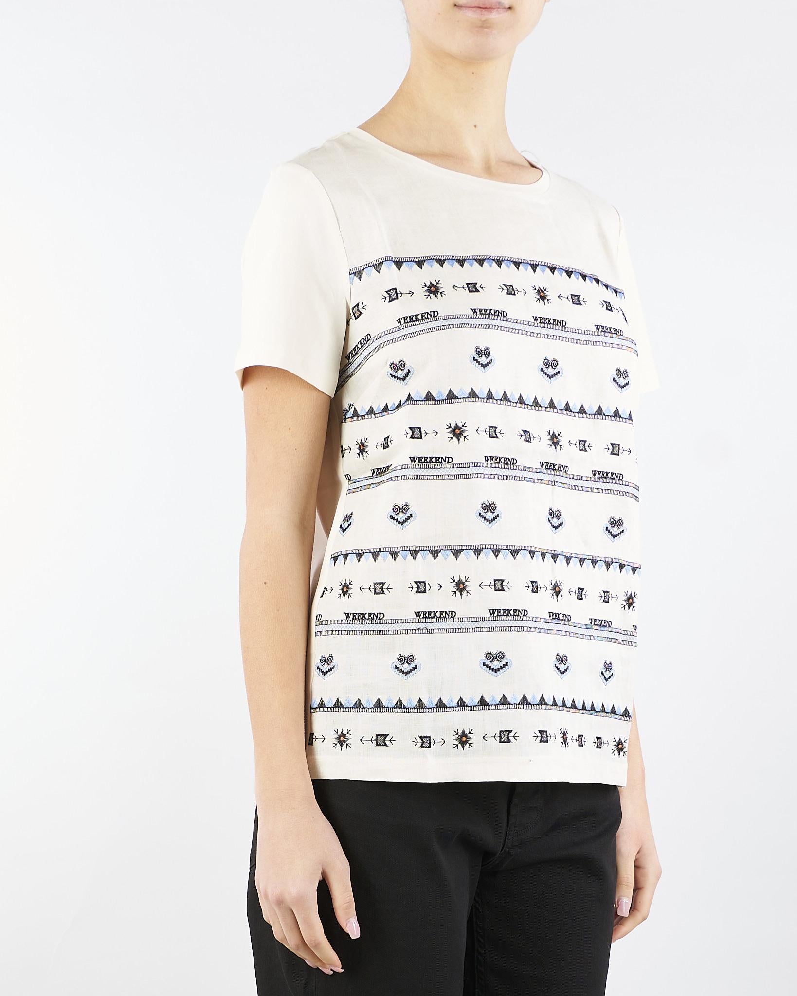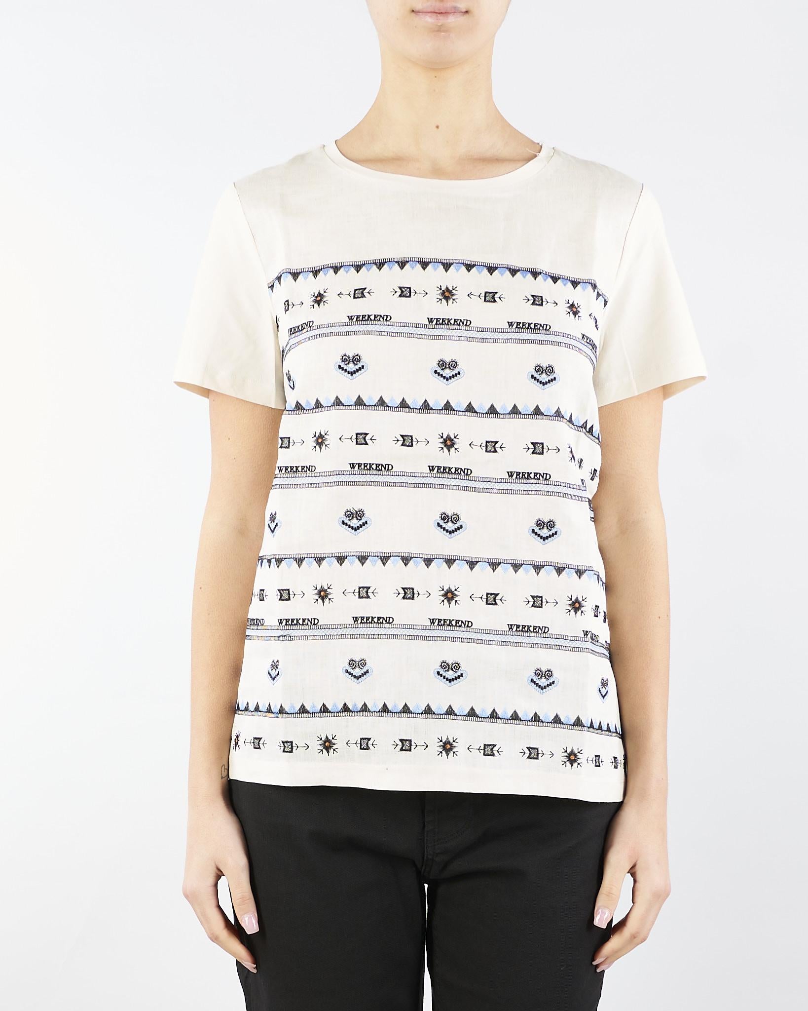 T-shirt in jersey di cotone stretch e tela di lino ricamata sul davanti. Il capo presenta girocollo e maniche corte. Linea dritta. Lunghezza 60 cm.