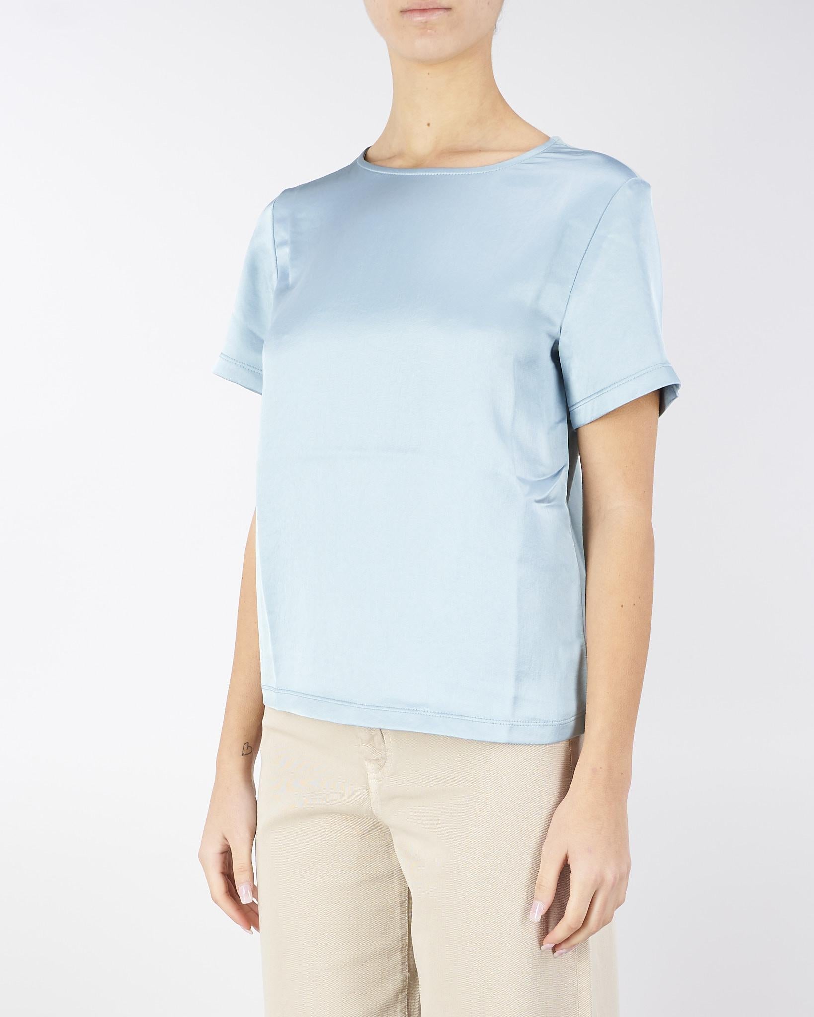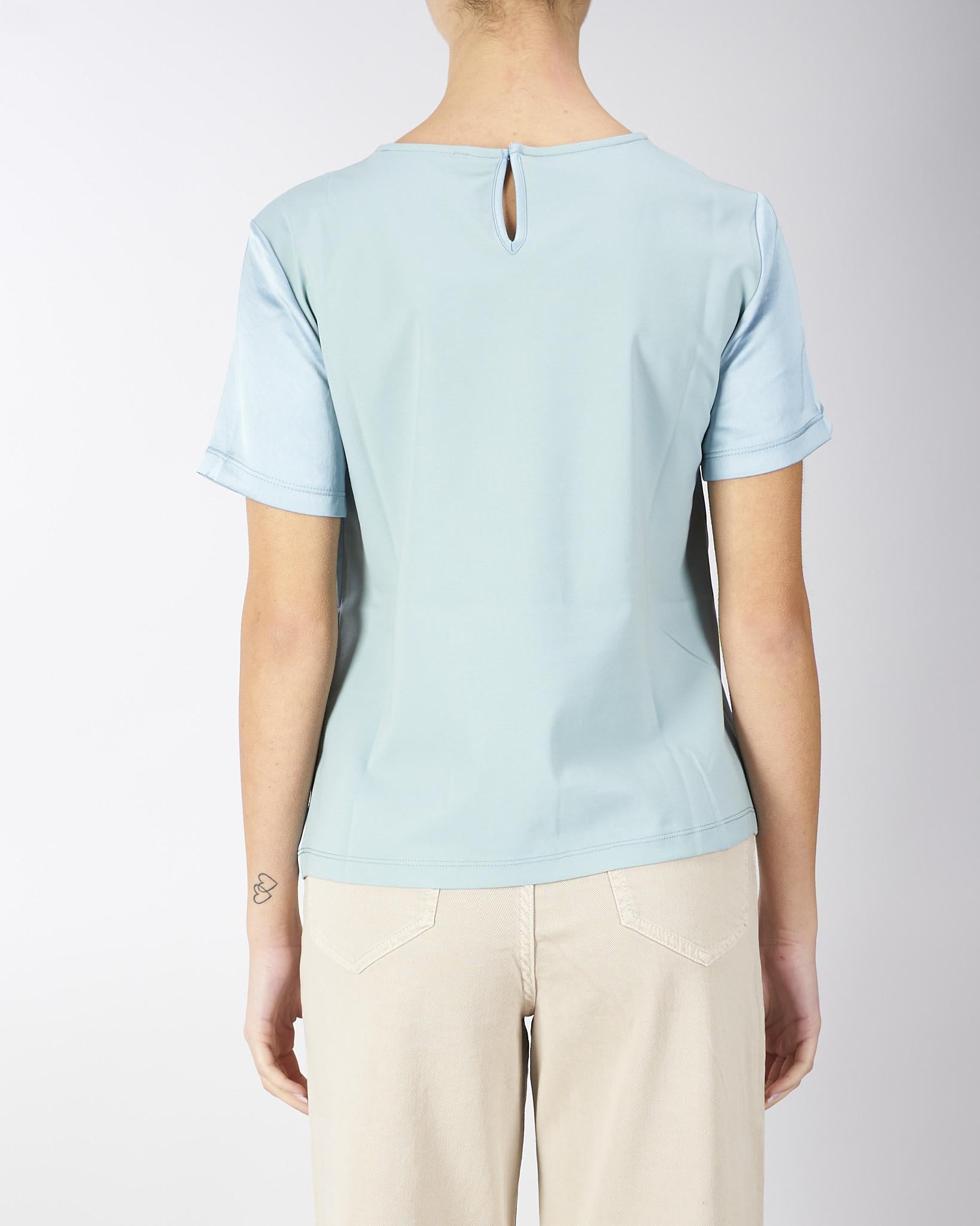 T-shirt in raso tecnico con retro in jersey lyocell, lavorato a punto Milano. Modello dalla linea dritta caratterizzato da collo tondo, maniche corte e apertura a goccia sul retro.