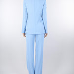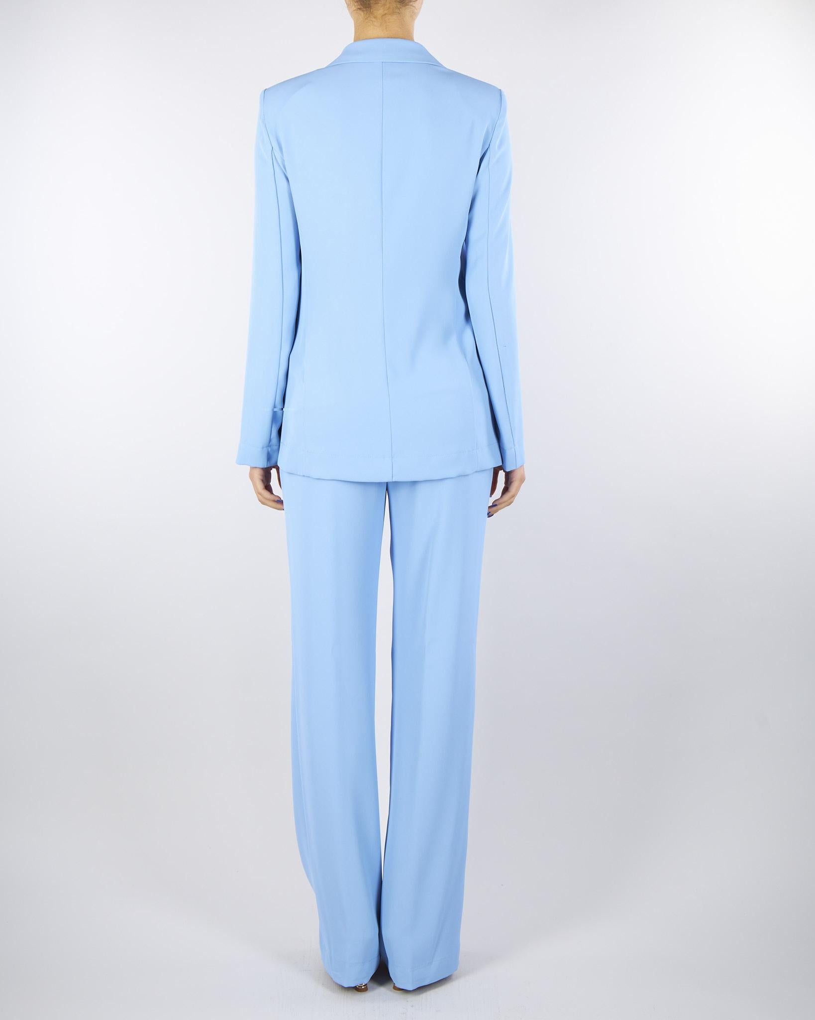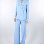 Tailleur Azzurro di Angela Davis. Modello doppiopetto con rever, tasche a filo con pattina. Chiusura centrale con bottoni. Pantalone dritto con vita alta.
