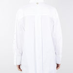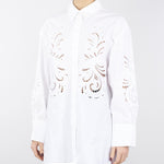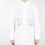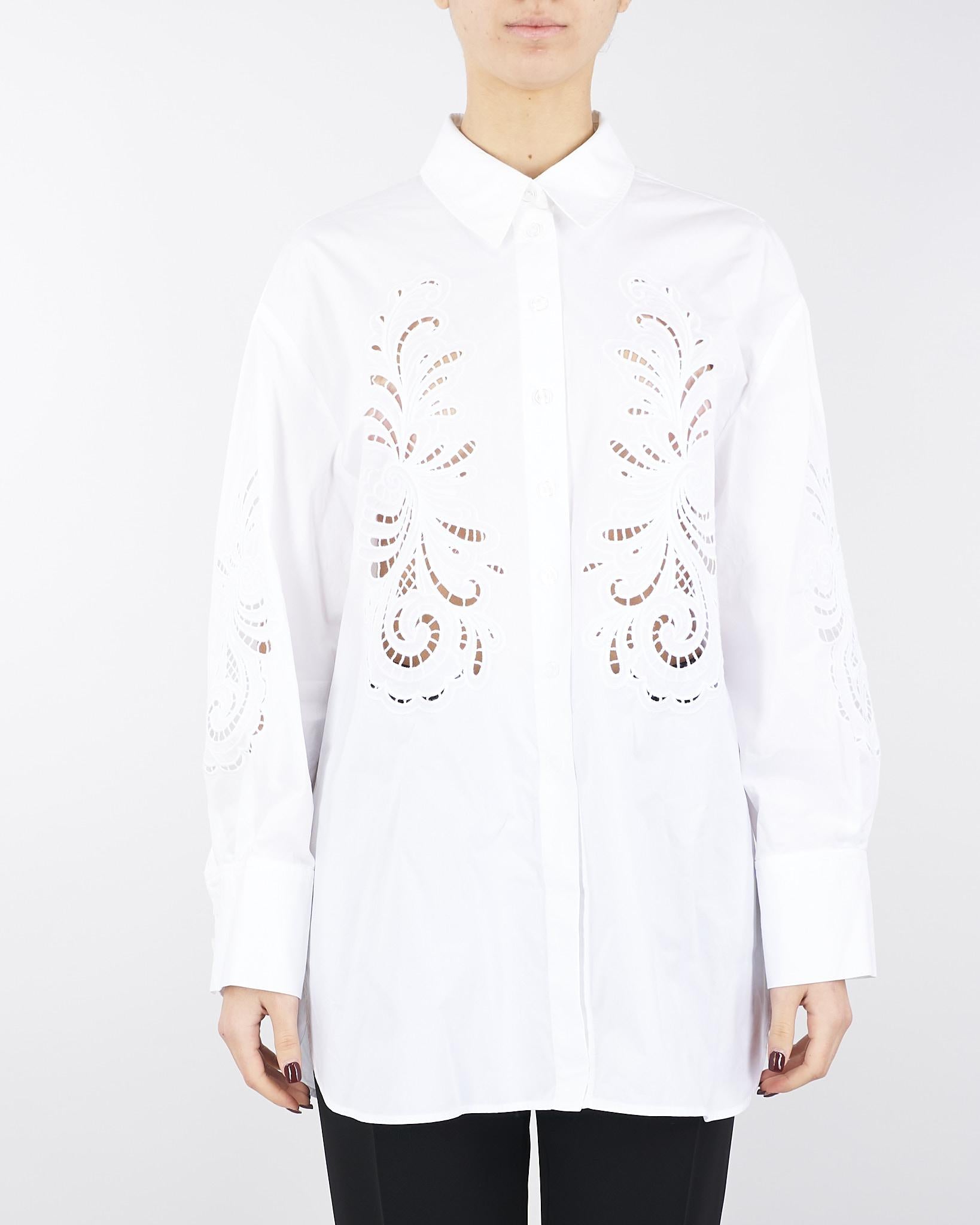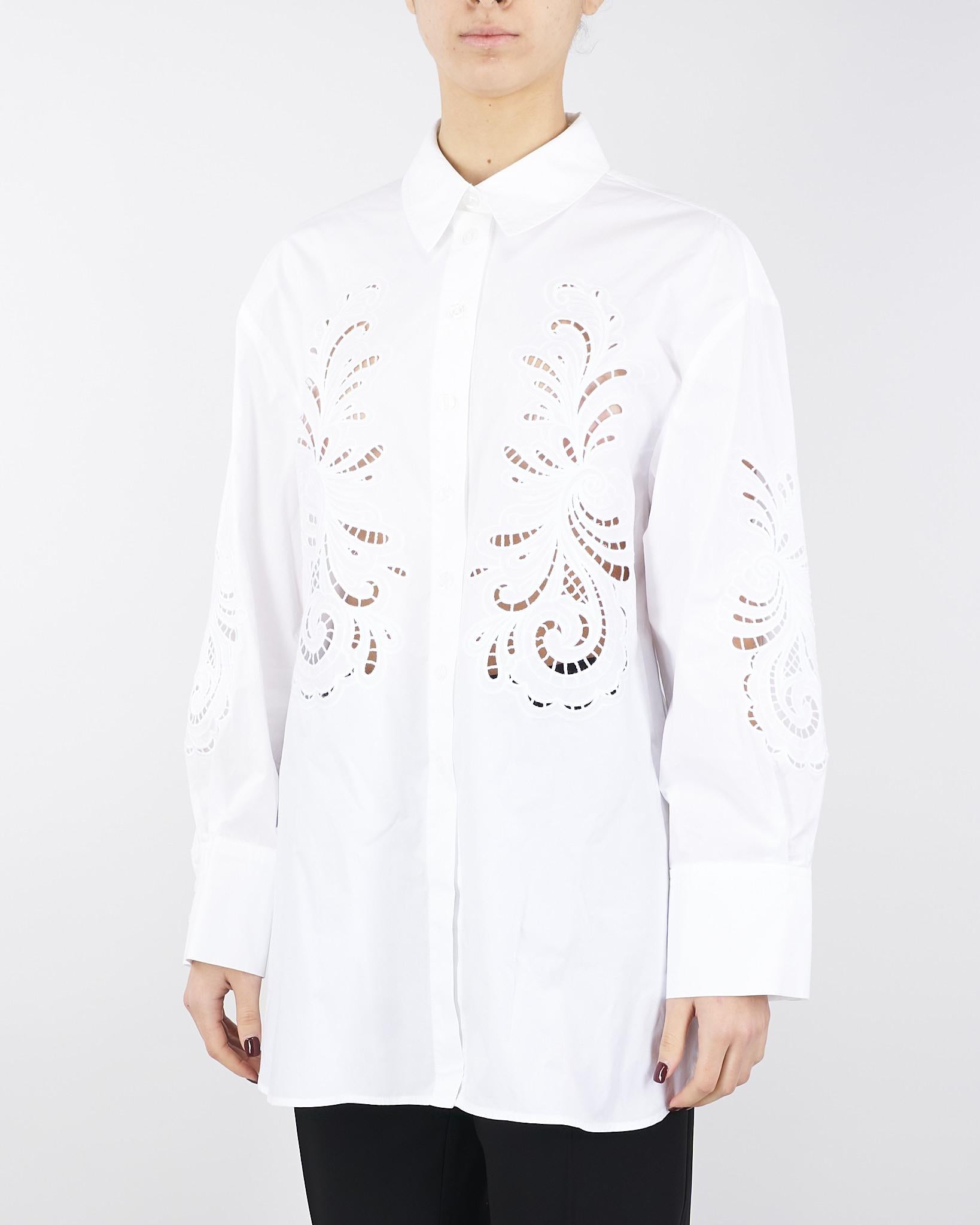 Camicia in popeline di cotone con finissaggio naturale impreziosita da ricamo piazzato a filo in tinta a intaglio, disegno d'ispirazione cashmere in esclusiva per Twinset. Ha colletto classico, chiusura con bottoni, maniche lunghe con spalle scese, polsi con bottoni, fondo arrotondato con spacchi ai fianchi, carré e placchetta logo Oval T sul retro, linea over.
