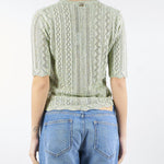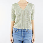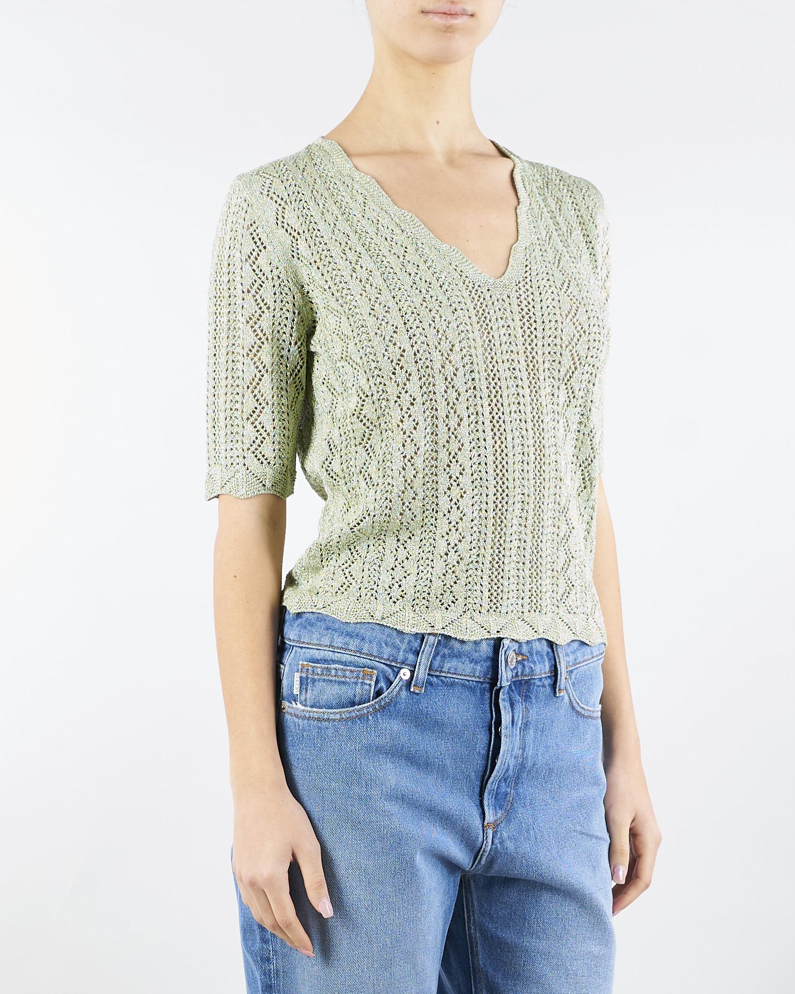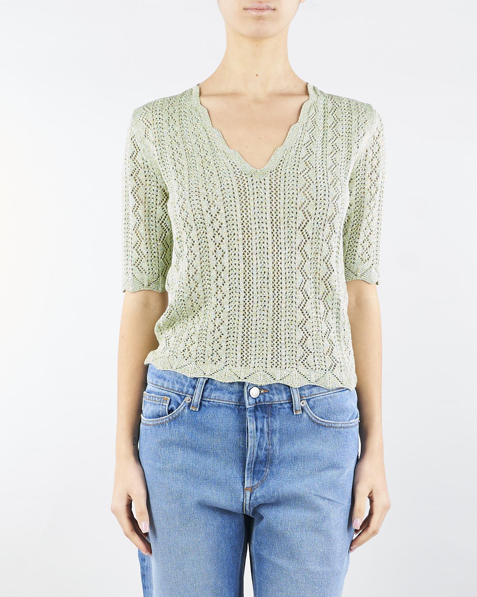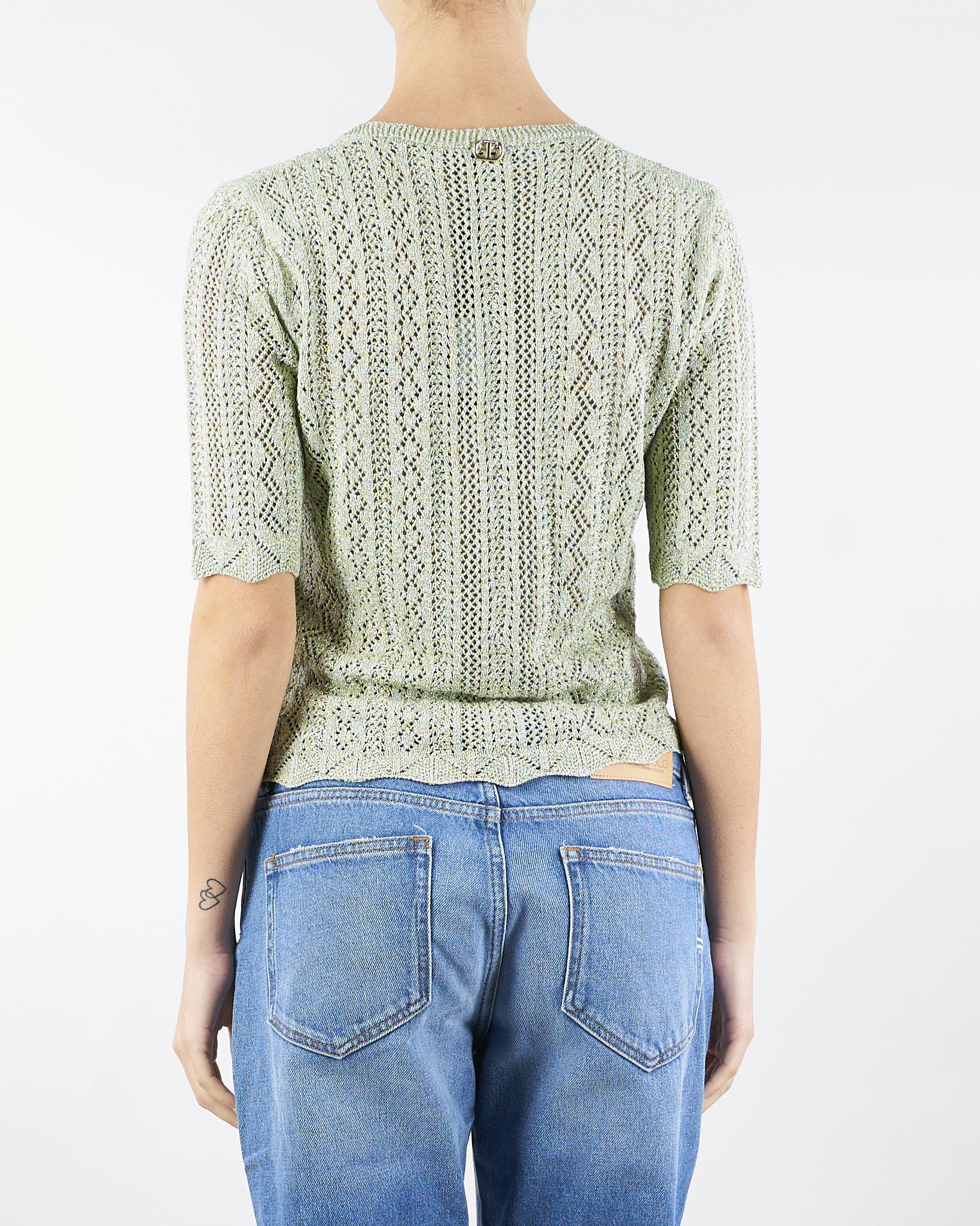 Maglia in misto viscosa lurex con lavorazione punzonata che crea disegni geometrici. Ha scollatura a V, maniche corte, profili smerlati, placchetta logo Oval T, linea morbida.