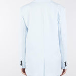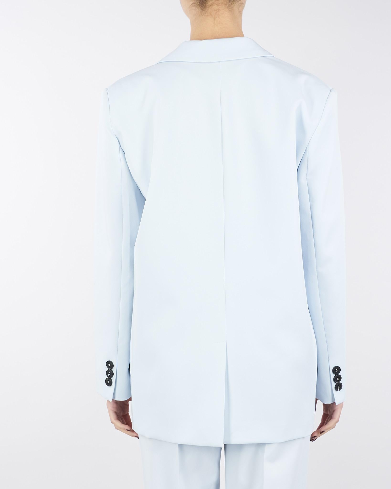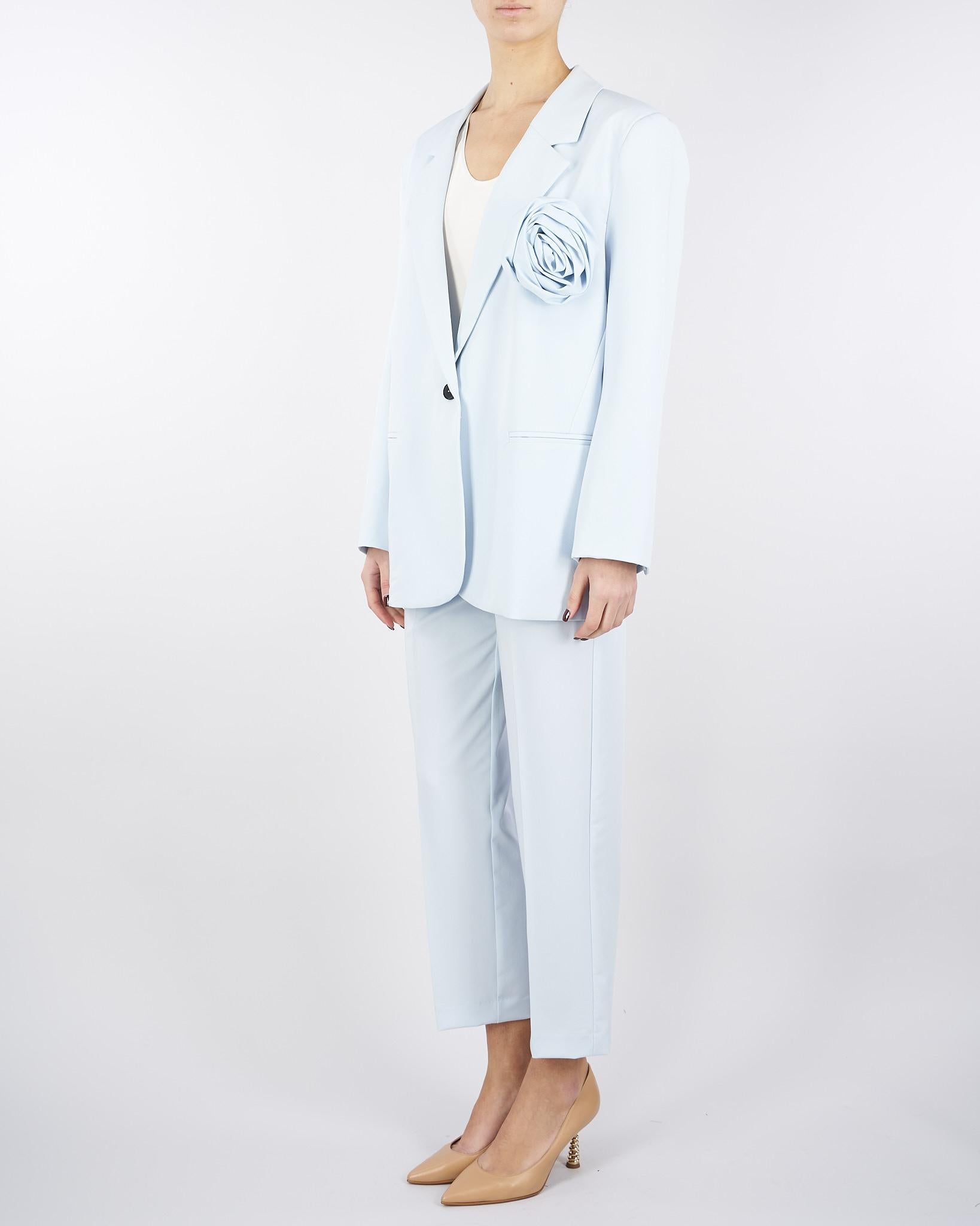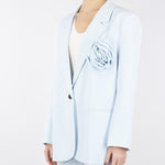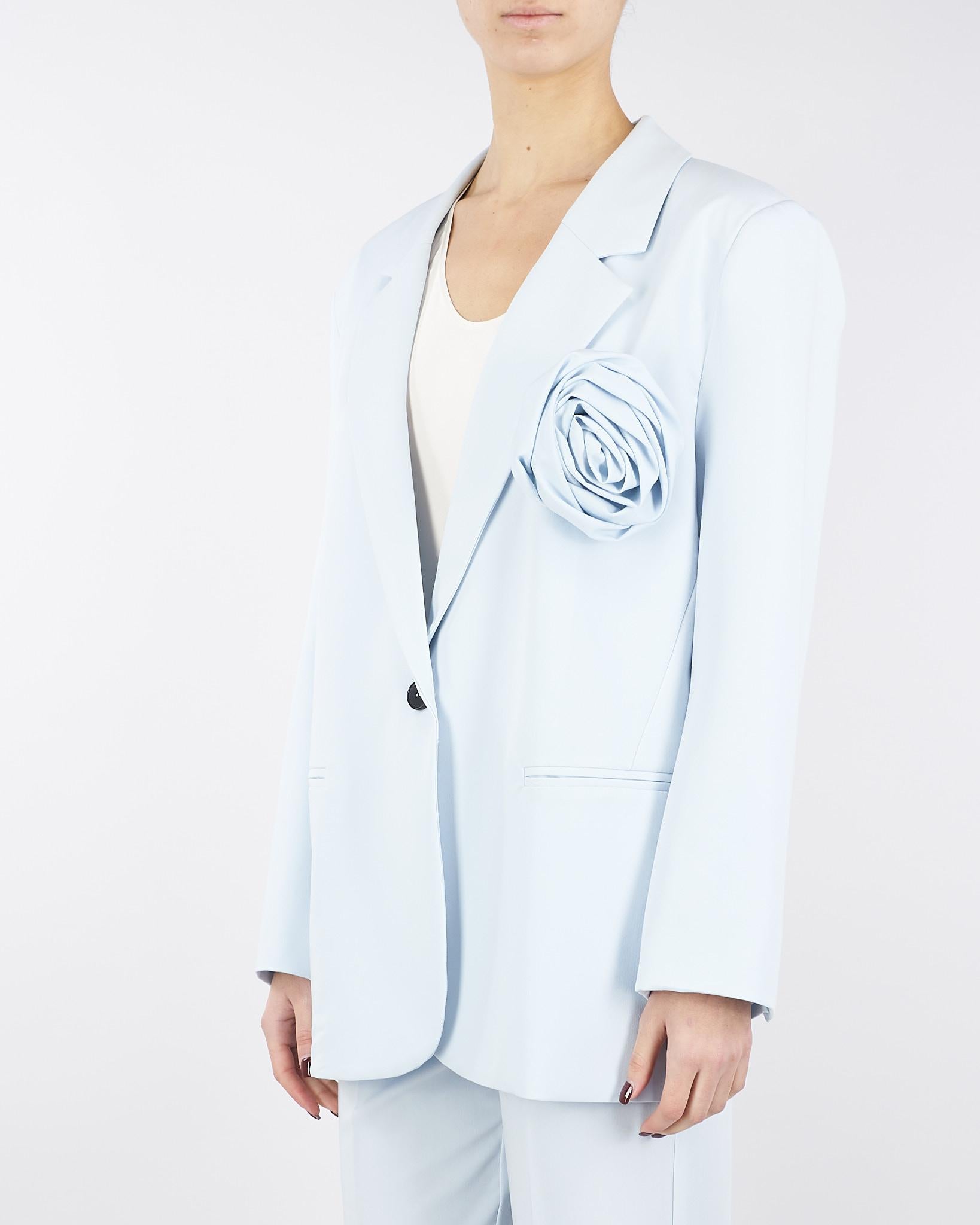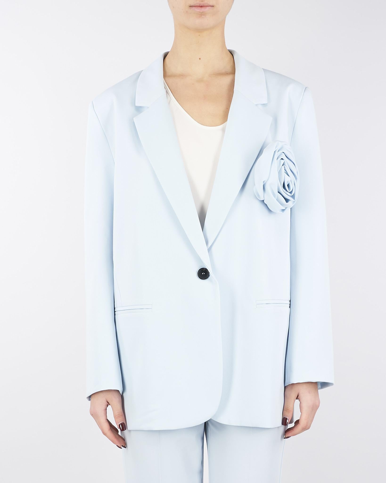 Blazer over con collo a revers e maniche lunghe con bottoni sul polso. Tasche frontali a filetto e spacchi posteriori. Chiusura sul davanti un bottone. Dettaglio spilla removibile in tessuto a forma di rosa.